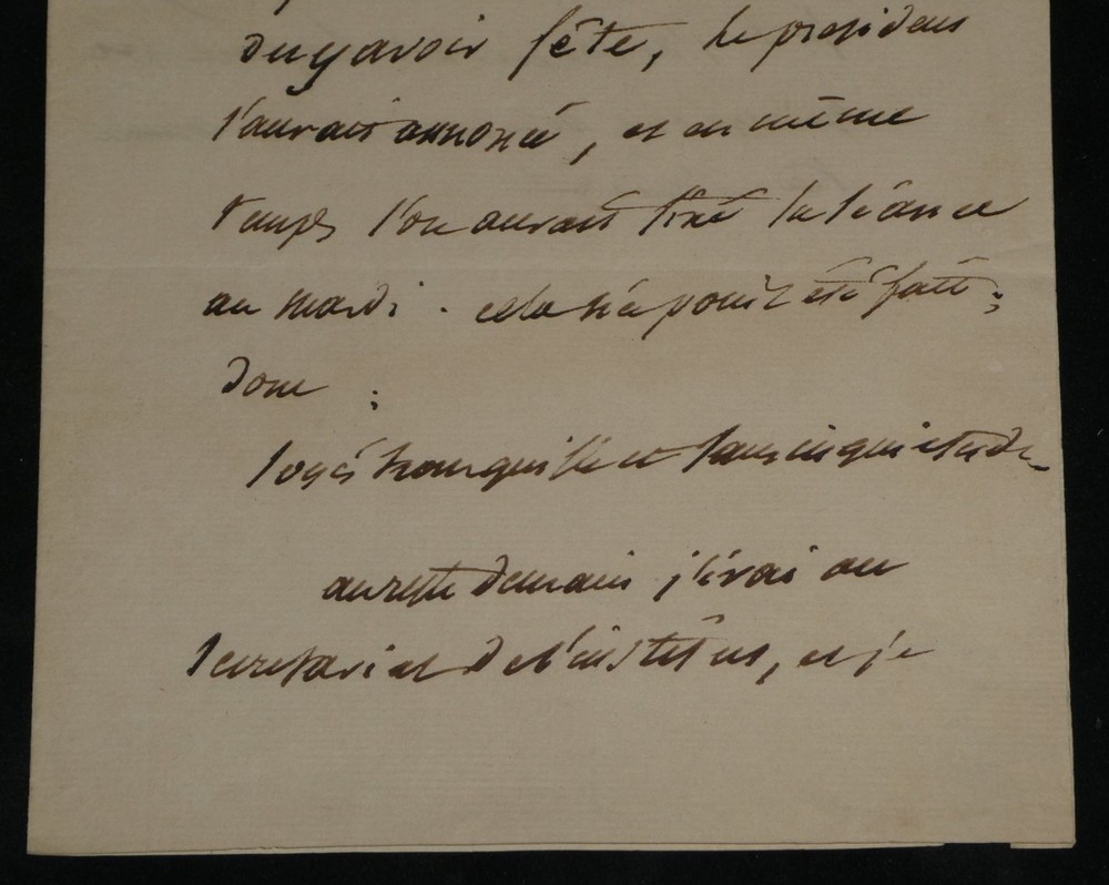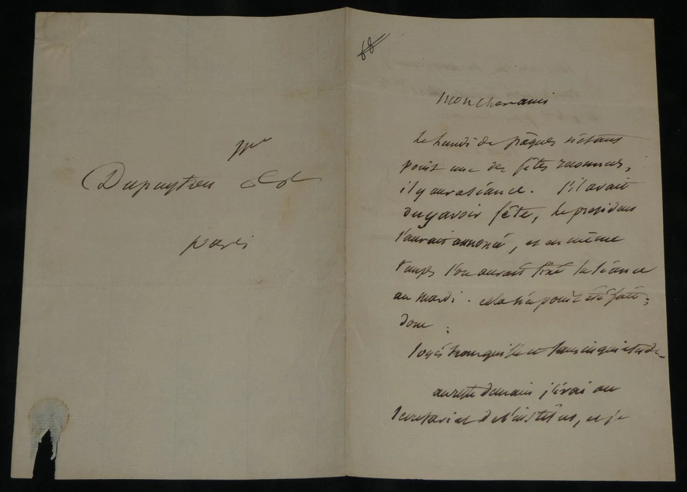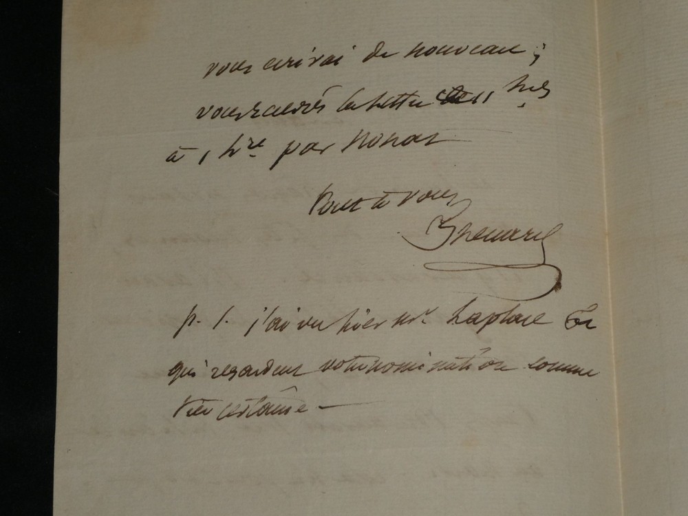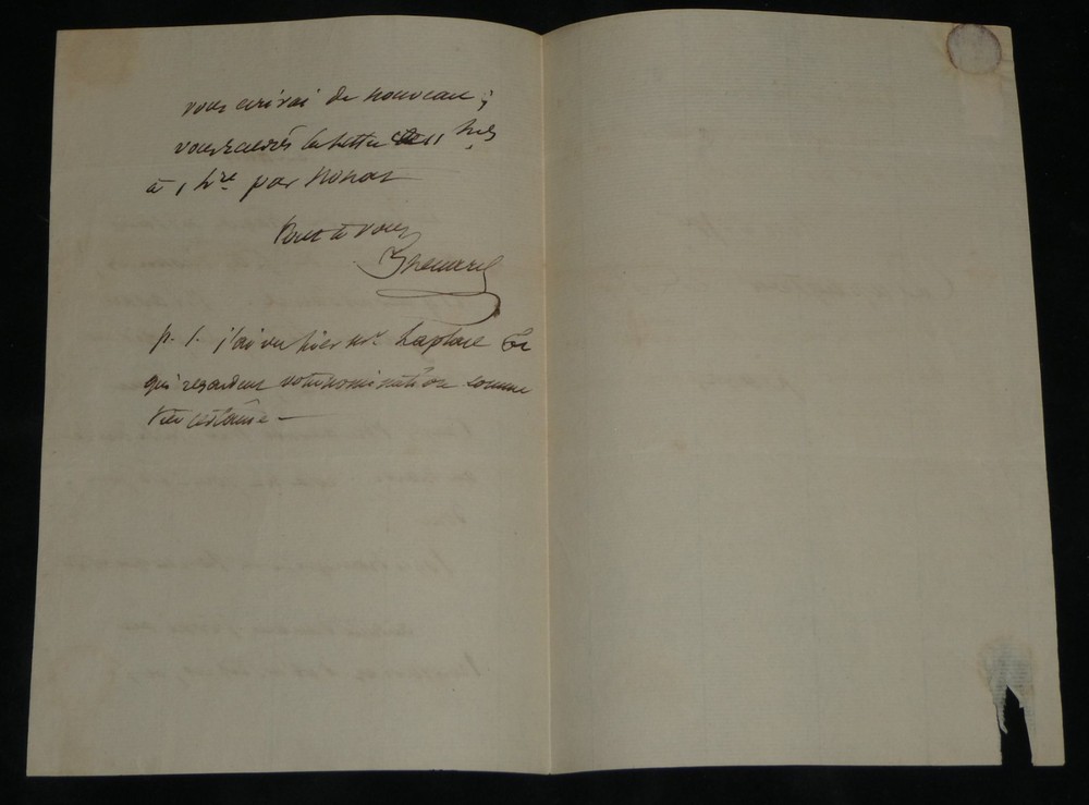 Free eBay listing template designed by dewiso.com Louis Jacques Thenard Letter Signed Autograph To Dupuytren Chimie&médecine 1825 The description of this item has been automatically translated. If you have any questions, please feel free to contact us. Louis Jacques Thénard. Autograph letter signed to Baron Dupuytren, Chemistry and medicine, 1825 French chemist Autograph letter signed by Louis Jacques Thénard, addressed to Baron Guillaume Dupuytren, undated. Written in brown ink on a double sheet of laid paper. This letter is a leading document for understanding the networks of scientific influence under the Restoration: Louis Jacques Thénard (the author), then Baron d'Empire, one of the greatest chemists of the 19th century (discoverer of hydrogen peroxide), reassures Dupuytren about the holding of a session at the Institute scheduled for Easter Monday. He also reports having seen Pierre-Simon de Laplace, and specifies that the latter considers the appointment of Dupuytren as “very certain”. This direct mention of one of the greatest scholars of the time gives the letter a major institutional significance, linked to Dupuytren's academic and scientific career. “My dear friend, Easter Monday is not one of the recognized holidays, there will be a session. If there should have been a party, the president would have announced it, and at the same time the session would have been fixed for Tuesday. This was not done; therefore: be calm and without worry. Moreover, tomorrow I will go to the secretariat of the institute, and I will write to you again; you will receive the letter from 11 a.m. to 1 a.m. by [Nonat]. All yours PS I saw Mr Laplace etc yesterday who view your appointment as very certain. » Louis Jacques Thénard (1777–1857), leading chemist, member of the Institute, professor at the Collège de France, is particularly known for the discovery of hydrogen peroxide and for his central role in scientific organization under the Empire and the Restoration. His correspondence with Dupuytren illustrates the close links between medicine, chemistry and scholarly institutions at the highest level. This letter is fully part of the scientific and academic network that surrounded Dupuytren at the height of his career. Dimensions: 12.2 x 18.1 cm State : Beautiful state of conservation. See photos for details. Number of pages: 2 pages You will find in this same sale several documents sent or received by Doctor Dupuytren, whether signed autograph letters or co-signed expert reports. -- Guillaume Dupuytren and his circle: The Elite of Science under the Restoration -- Guillaume Dupuytren was one of the most imposing and influential figures in 19th century medicine. Chief surgeon at the Hôtel-Dieu in Paris and professor of anatomy, he acquired international fame as much for his surgical genius as for his imperious character. Named Baron by Louis XVIII and First Surgeon to the King under Charles X, he left his name to the famous "Dupuytren's disease". Dupuytren's correspondence and archives bear witness to his constant exchanges with the greatest scientific figures of his time, including: - Georges Cuvier: The father of comparative anatomy and paleontology, whose work illuminates the importance of pathological anatomy in Dupuytren's surgery. - Antoine Dubois: Renowned surgeon and obstetrician to Empress Marie-Louise. Their collaboration illustrates the collegiality of experts during the most complex clinical cases. - Antoine Portal, Baron Portal: first physician to Louis XVIII and founder of the Royal Academy of Medicine. - René-Nicolas Desgenettes: Chief physician to the Napoleonic armies, key figure in the Egyptian campaign. - Louis Jacques Thénard: Leading chemist, testifying to Dupuytren's openness to the exact sciences. - Constant Duméril: Eminent zoologist and member of the Academy of Sciences, illustrating the links between clinique medicine and the natural sciences. Contact us Autograph letters, old papers, old books, photographs, engravings, stamps... We appraise and/or buy your letters, collections of letters and old books throughout France. A question? Any clarification? Do not hesitate to contact me Payment Payments by eBay, PayPal, transfer or check are accepted. Sending Careful delivery in rigid, waterproof packaging within three days. Allow for the usual postal delays in addition. Back Satisfaction guaranteed or your money back. If you are not completely satisfied, return at the seller's expense for Europe. At the buyer's expense for the rest of the world. Autograph letter signed by Louis Jacques Thénard, addressed to Baron Guillaume Dupuytren, undated.Written in brown ink on a double sheet of laid paper.This letter is a leading document for understanding the networks of scientific influence under the Restoration: Louis Jacques Thénard (the author), then Baron d'Empire, one of the greatest chemists of the 19th century (discoverer of hydrogen peroxide), reassures Dupuytren about the holding of a session at the Institute scheduled for Easter Monday.He also reports having seen Pierre-Simon de Laplace, and specifies that the latter considers the appointment of Dupuytren as “very certain”. This direct mention of one of the greatest scholars of the time gives the letter a major institutional significance, linked to Dupuytren's academic and scienti