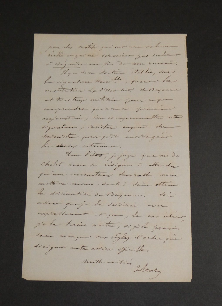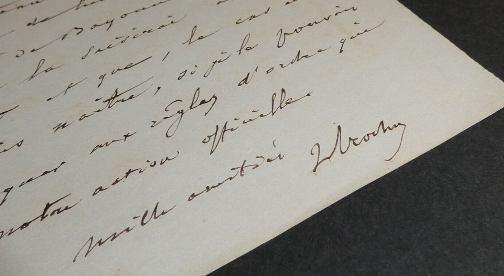 Free eBay listing template designed by dewiso.com Louis Jules Trochu, General- Signed Autograph Letter to M Lambert, 1853 The description of this item has been automatically translated. If you have any questions, please feel free to contact us. Louis Jules Trochu. Autograph letter signed dated February 21, 1853 in Paris. Major General Signed autograph letter written by Louis Jules Trochu, to Mon cher Lambert on February 21, 1854 in Paris. “My dear Lambert, I am doing everything that M de Cholet is worth and deserves even though I do not know him personally. For this reason and for the reason that I very rarely let slip the opportunity to serve, when I can, the interests of an officer of our army, I am very willing to contribute to the realization of the wish expressed by this officer through you. But it does not seem to me that this realization can be immediate. [...]" Dimensions: 21.1 x 13.6 cm State : See photos for details. Number of pages: 3 pages Louis-Jules Trochu Louis-Jules Trochu, born at the Palais in Belle-Île-en-Mer on Mars 12, 1815 and died in Tours on October 7, 1896, was a French division general and statesman during the Second Empire. Wikipedia Contact us Autograph letters, old papers, old books, photographs, engravings, stamps... We appraise and/or buy your letters, collections of letters and old books throughout France. Payment Payments by eBay, PayPal, transfer or check are accepted. Sending Careful delivery in rigid, waterproof packaging within three days. Allow for the usual postal delays in addition. Back Satisfaction guaranteed or your money back. If you are not completely satisfied, return at the seller's expense for Europe. At the buyer's expense for the rest of the world. Signed autograph letter written by Louis Jules Trochu, to Mon cher Lambert on February 21, 1854 in Paris. “My dear Lambert, I am doing everything that M de Cholet is worth and deserves even though I do not know him personally. For this reason and for the reason that I very rarely let slip the opportunity to serve, when I can, the interests of an officer of our army, I am very willing to contribute to the realization of the wish expressed by this officer through you. But it does not seem to me that this realization can be immediate. [...]" Dimensions: 21.1 x 13.6 cm State : See photos for details. Number of pages: 3 pages
