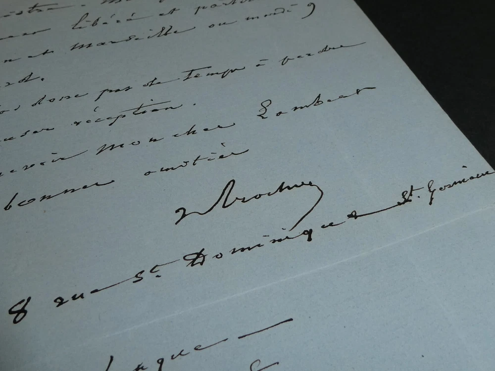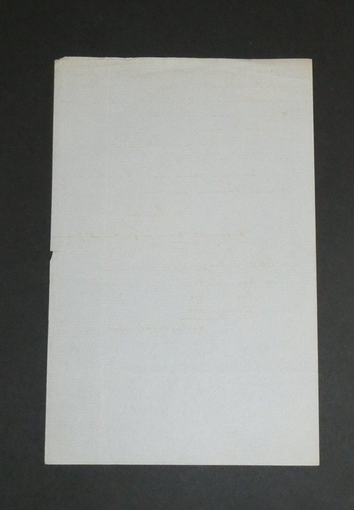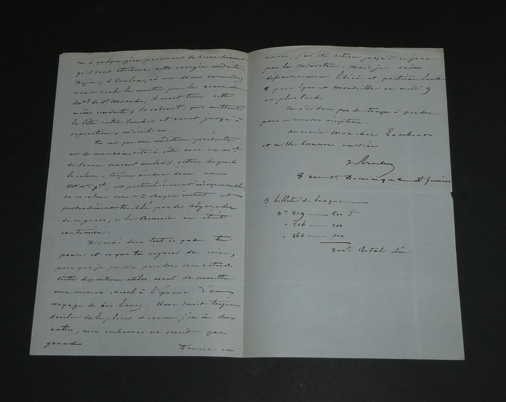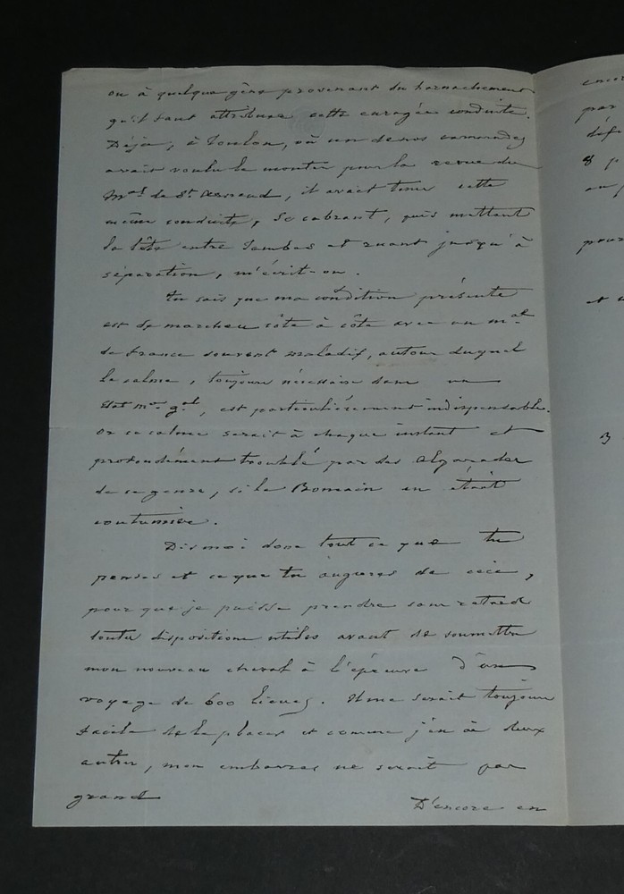 Free eBay listing template designed by dewiso.com Louis Jules Trochu, General- Signed Autograph Letter to M Lambert, 1854 The description of this item has been automatically translated. If you have any questions, please feel free to contact us. Louis Jules Trochu. Autograph letter signed dated May 4, 1854 in Paris. Major General Signed autograph letter written by Louis Jules Trochu, to Mon cher Lambert on May 4, 1854 in Paris. On blue colored paper with dry weather. “My dear Lambert, I am sending you herewith the 800 f I am your debtor. Gal d'Aurelle, my charge d'affaires in Toulon, had not announced his arrival on Roman horse, but I knew from a letter from the innkeeper of the Golden Cross that he had arrived there. Since then, it has been sent to Marseille and I will have further news following an accident which worries me a little. My orderly, who is a very good rider, the elite of the guides having wanted to mount him and make him trot, on , the horse began to launch energetic kicks which my man naturally resisted with a good seat, but a stirrup and, soon after, the straps having broken, there was a fall, the rider seriously sprained his arm and here I was momentarily without an orderly. [...]" Dimensions: 21.1 x 13.6 cm State : See photos for details. Number of pages: 3 pages Louis-Jules Trochu Louis-Jules Trochu, born at the Palais in Belle-Île-en-Mer on Mars 12, 1815 and died in Tours on October 7, 1896, was a French division general and statesman during the Second Empire. Wikipedia Contact us Autograph letters, old papers, old books, photographs, engravings, stamps... We appraise and/or buy your letters, collections of letters and old books throughout France. Payment Payments by eBay, PayPal, transfer or check are accepted. Sending Careful delivery in rigid, waterproof packaging within three days. Allow for the usual postal delays in addition. Back Satisfaction guaranteed or your money back. If you are not completely satisfied, return at the seller's expense for Europe. At the buyer's expense for the rest of the world. Signed autograph letter written by Louis Jules Trochu, to Mon cher Lambert on May 4, 1854 in Paris. On blue colored paper with dry weather.“My dear Lambert, I am sending you herewith the 800 f I am your debtor. Gal d'Aurelle, my charge d'affaires in Toulon, had not announced his arrival on Roman horse, but I knew from a letter from the innkeeper of the Golden Cross that he had arrived there. Since then, it has been sent to Marseille and I will have further news following an accident which worries me a little. My orderly, who is a very good rider, the elite of the guides having wanted to mount him and make him trot, on , the horse began to launch energetic kicks which my man naturally resisted with a good seat, but a stirrup and, soon after, the straps having broken, there was a fall, the r
