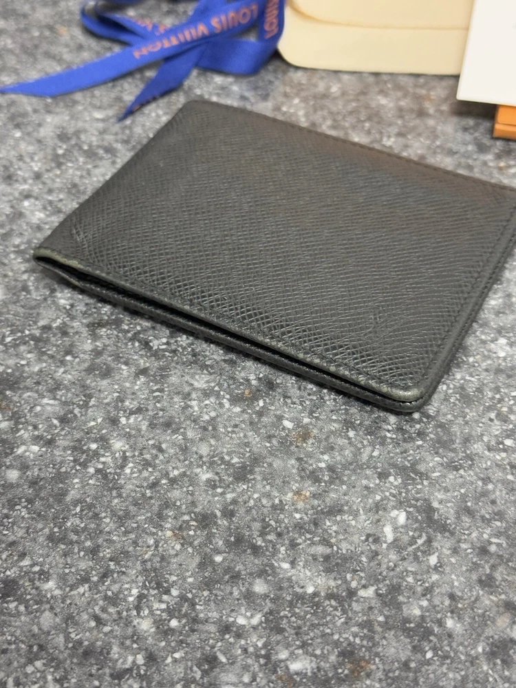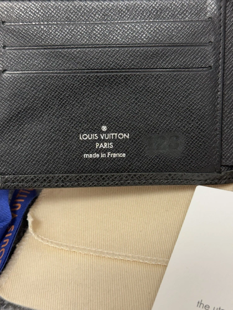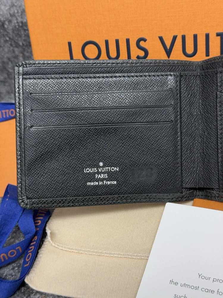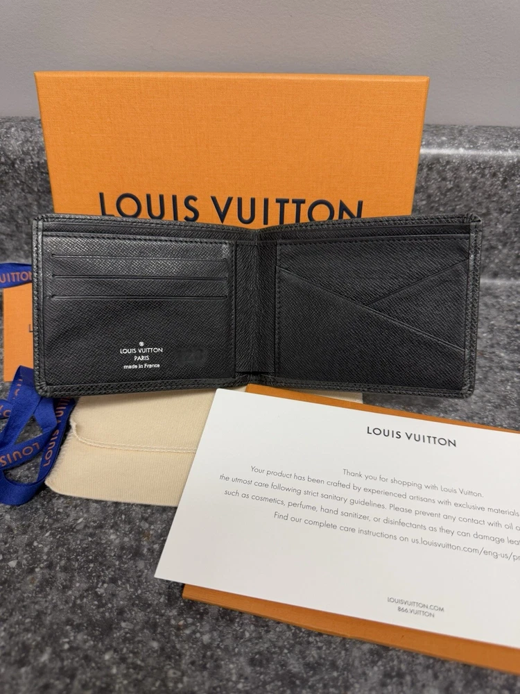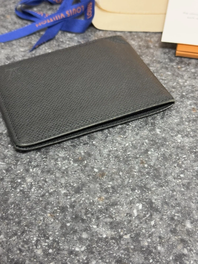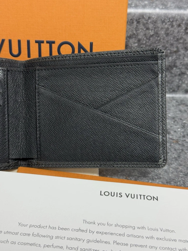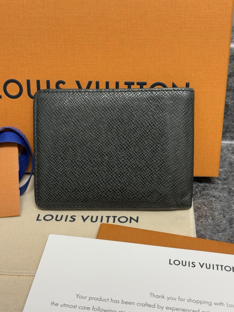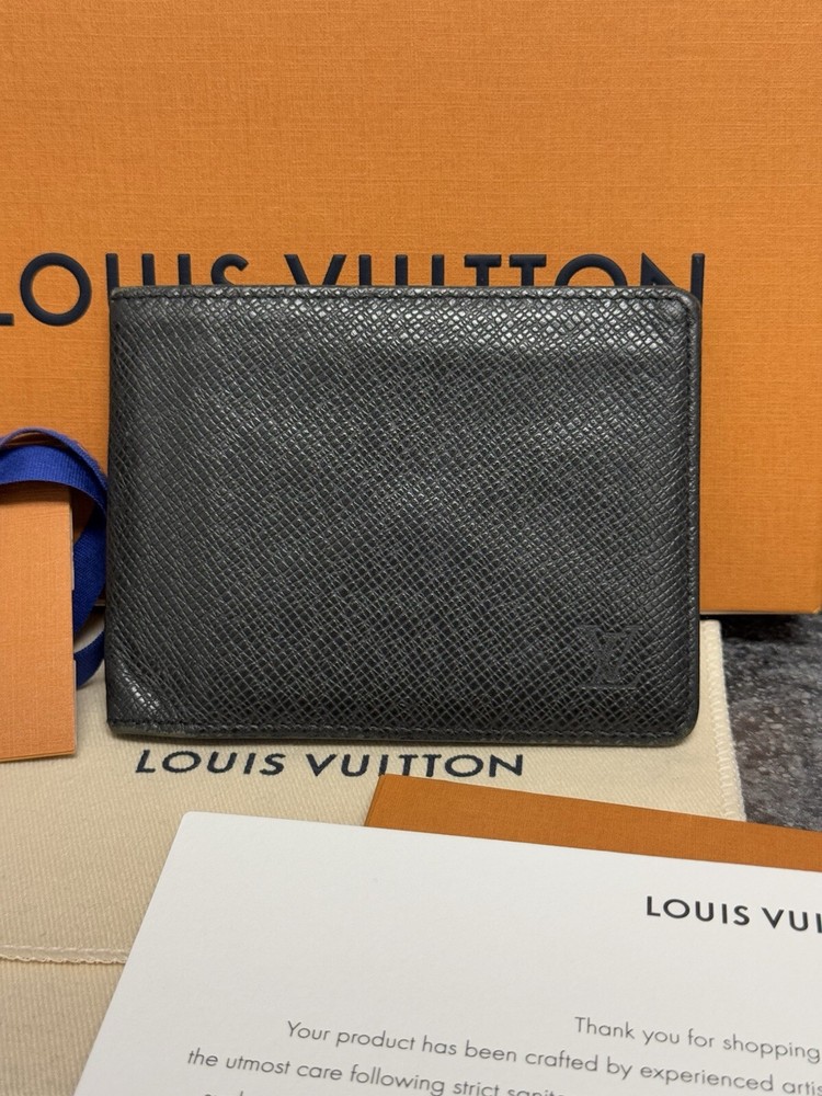 Louis Vuitton Portefeuille Black Taiga Leather Multiple Men’s Bifold Wallet This louis vuitton black multiple men’s bifold wallet is in good preowned condition! The wallet features five card slots, two pockets, and two bill slots. Very spacious! The wallet comes with its box, dust bag, ribbon, gift tag, “thank you for shopping with louis vuitton” paper, and the receipt holder. Full inclusion!!! Model Number: M30531 This wallet is still on the lv website currently selling for $630. Date Code: CT2029 Will ship the next day via usps! Please let me know if you have any questions or offers! The wallet had initials inside beside the lv heat stamp that have been rubbed out and also the wallet has some color loss on the corners from usage.