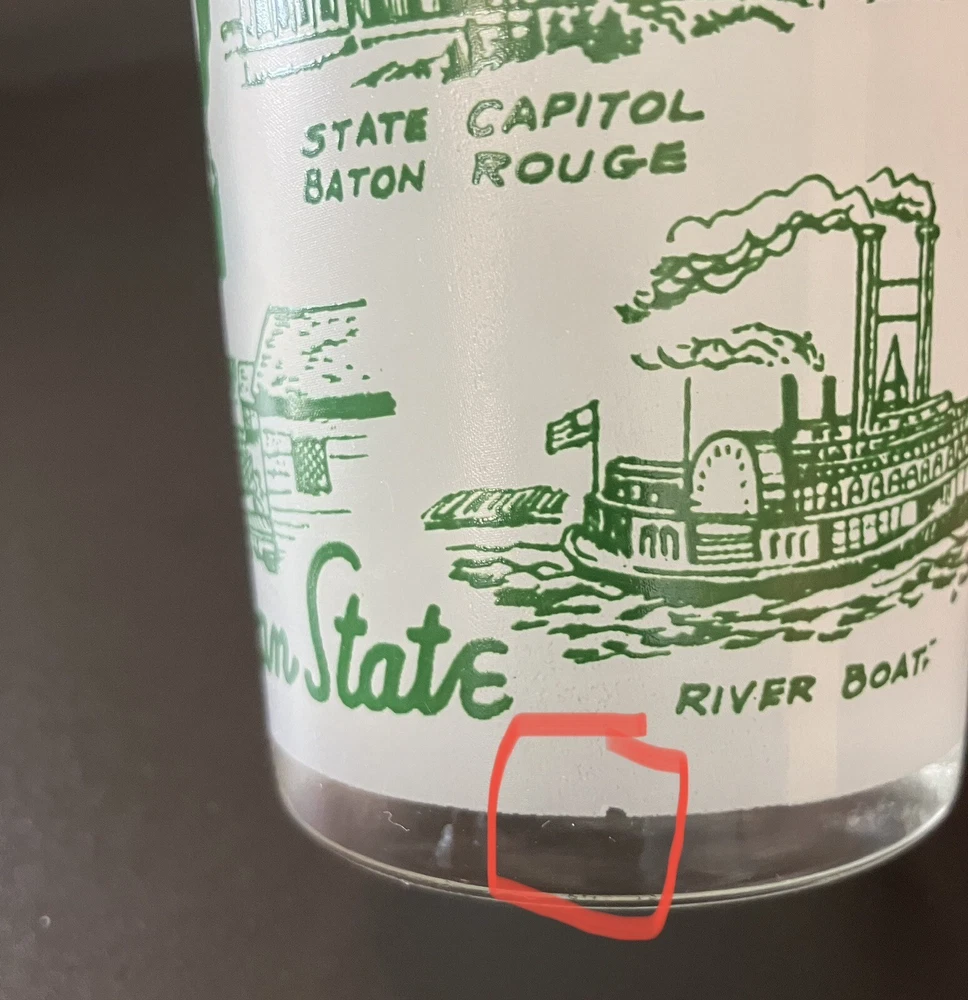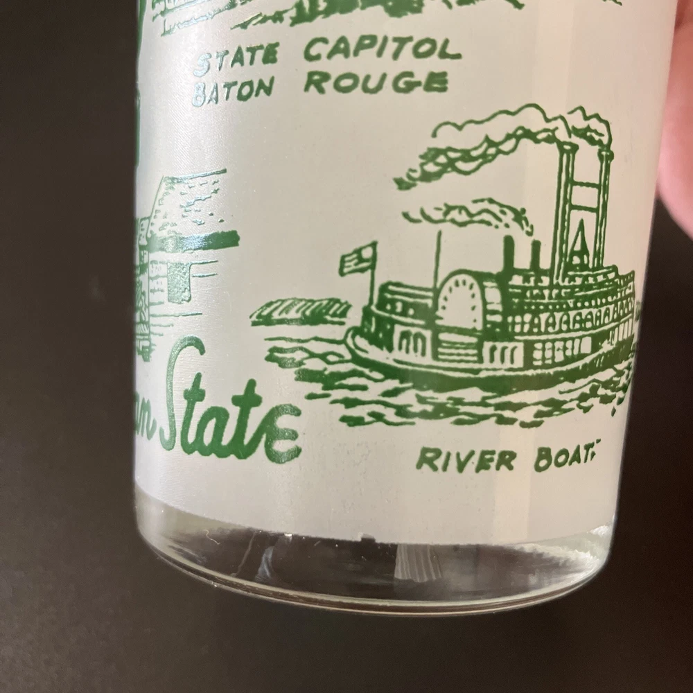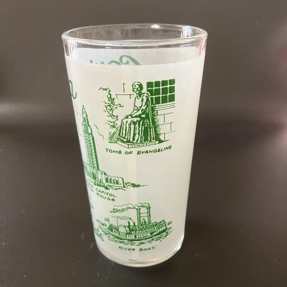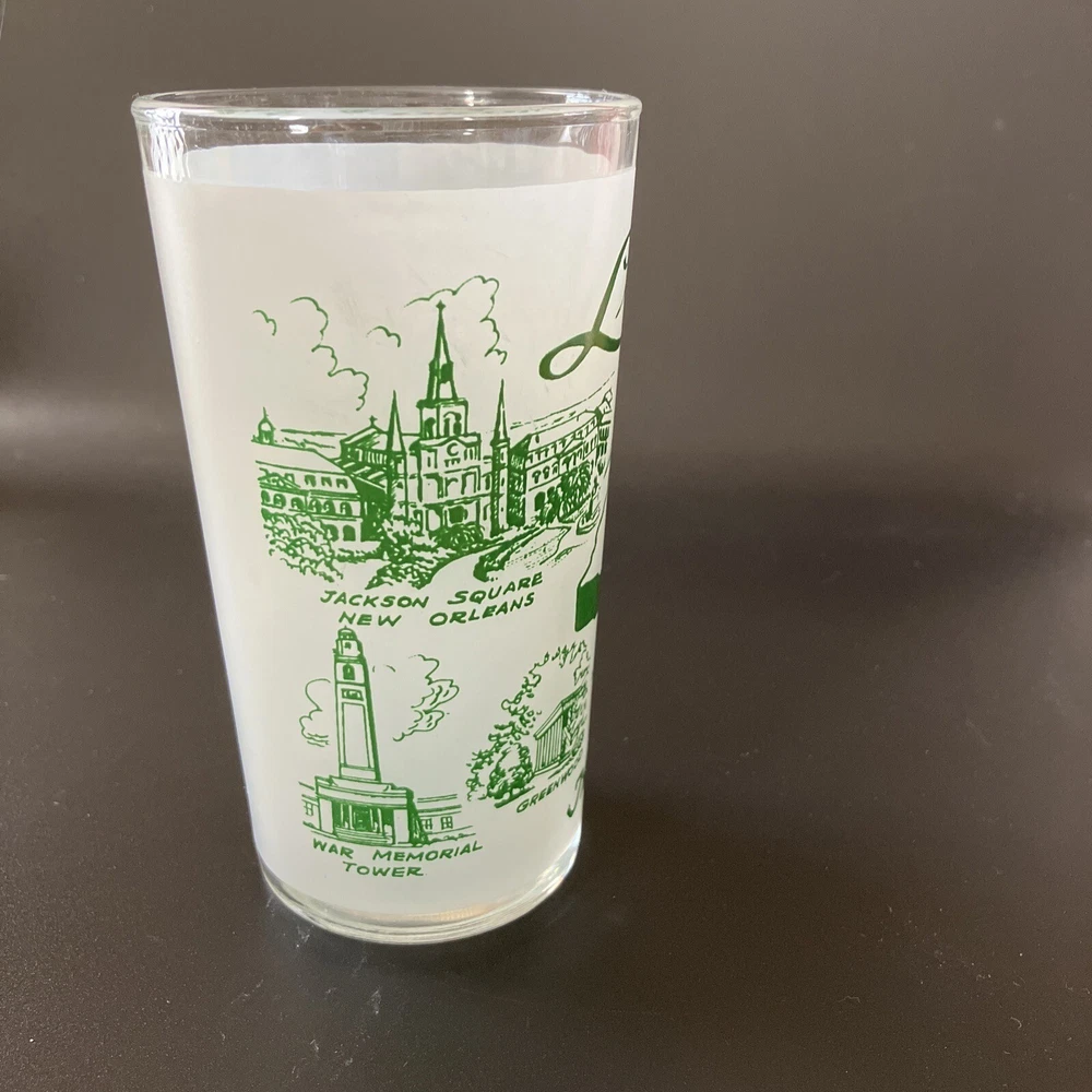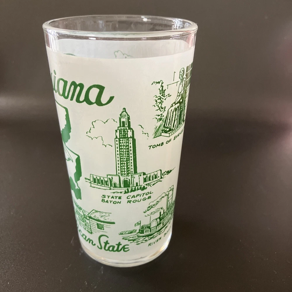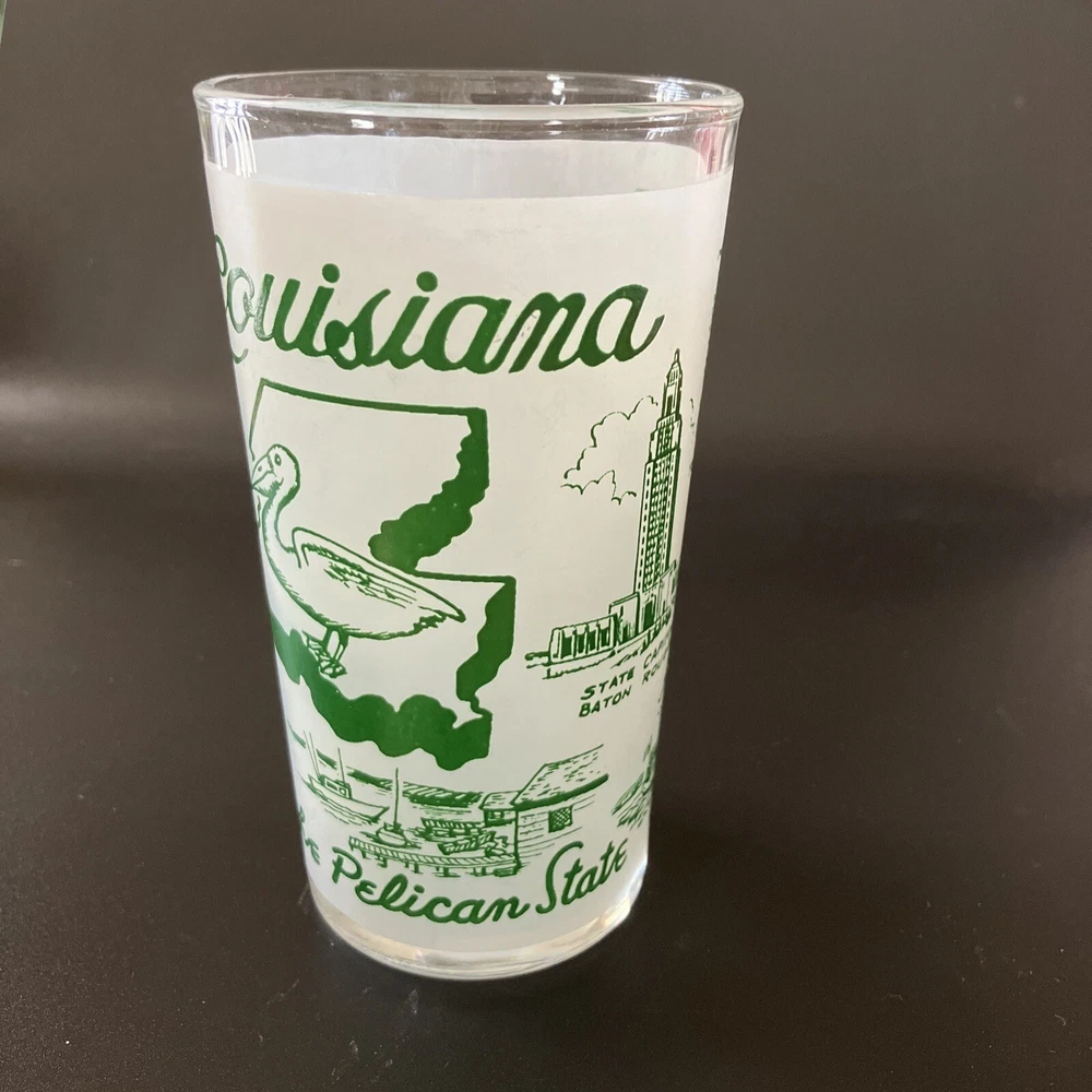 Souvenir drink ware, state of Louisiana. In very good condition, with only one scuff as seen in last picture. Please see all photos as they are part of the description. Holds 8oz comfortably, holds 9 oz. all the way to the rim. This stands 4.75” tall. A fun addition to your mid-century barware collection! See my other listings for other glassware. I am happy to combine shipping of similar items if requested. Sales to US-based buyers only. Sorry, no international shipping. Will be well- cushioned and packed with care for safe shipping.