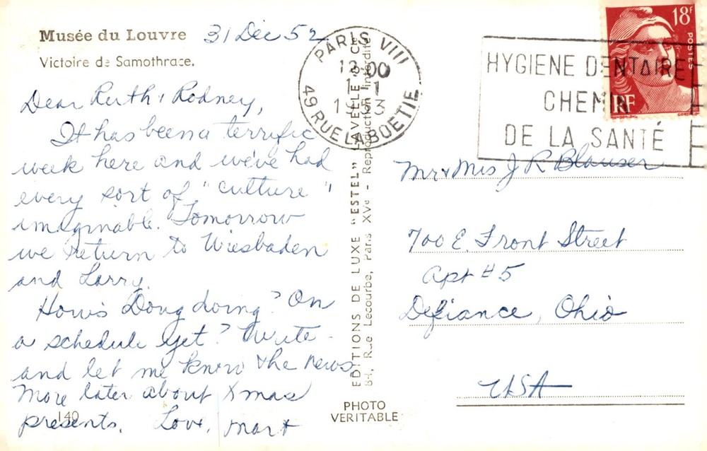 Greetings from Paris! We've had an amazing week filled with culture. Tomorrow we head back to Wiesbaden. How's Dong? Keep me updated on the news. More about Xmas presents later. Love, Mart.