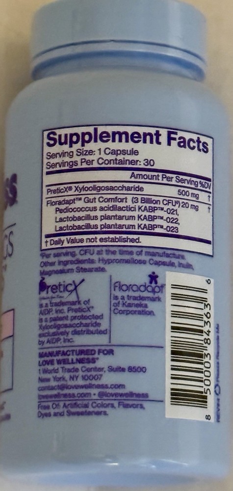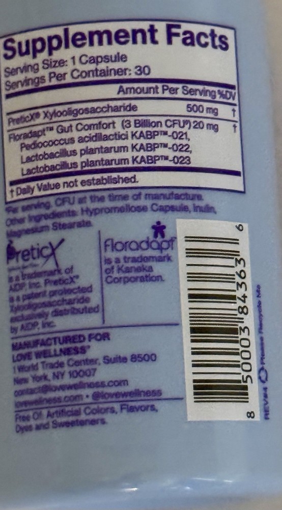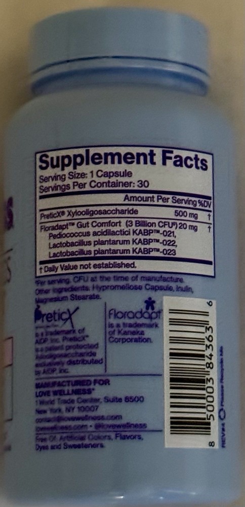 Flavor:UnflavoredBrand:Love Wellnessgtin13:850003843636Ingredients:See BottleWhen to Take:1 Capsule Daily With or Without FoodFeatures:30 CapsulesType:Dietary SupplementMain Purpose:Digestive Support, Immune System SupportFormulation:CapsuleExpiration Date:07/2026Department:WomenUPC:850003843636Country/Region of Manufacture:United StatesDosage:See BottleNumber of Pills:30Active Ingredients:See Bottle