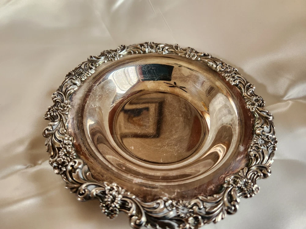 This beautiful 7-inch bowl by Reed & Barton is a stunning addition to any collection. The intricate burgundy pattern on the sterling silver (.925) composition makes it a unique and elegant piece. The bowl's age is unknown, adding to its mystery and charm. Reed & Barton manufactured in Taunton MA from 1824 until 2015. This bowl is perfect for use or display and is sure to impress.