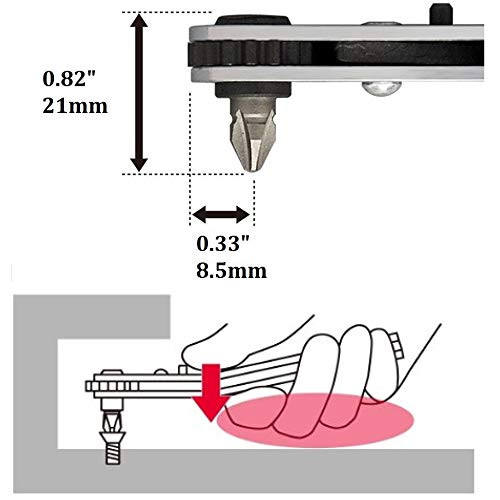 [ HIGH HEAVY DUTY RIGHT ANGLE RATCHET SCREWDRIVER & ALLEN WRENCH] Stubby low profile and long flat handle with 90 degree screwdriver & bits set are perfect for tight workspaces and close quarters. The plate-shaped handle is easy to press and apply force and even a strongly tightened screw can be easily loosened. The upwards angled bent head allows screwdrivers to enter even complex work areas. 9 bits phillips (+1, +2, +3 mm), flathead (-6 mm) and hex (2.5, 3, 4, 5, 6 mm) are included. [ MAGNETIC BITS MINI SLIM SCREWDRIVER KIT ] The bit holder has a magnet to prevent the bit from dropping when replacing and supports smooth work. The small pocket size is portable. You can put it in a tool box or put it in your pocket for work as well. The short & stubby bits do not disturb the work even in a narrow place. [ EFFICIENT RATCHETING MECHANISM] It is a screwdriver with a ratchet mechanism that can turn the screw only by the left and right repetitive operations. Reduces screwdriver time and increases work efficiency. Both the tightening and loosening of the screws can be switched with the button on the screwdriver, so no need to change the grip. [ AUTHENTIC JAPANESE QUALITY TOOL ] Made in Japan. official English package. High quality products manufactured by craftsmen in Tsubame city where is a famous site of metal and cutlery in Japan. [ PRODUCT INFORMATION ] Total length: 4.25" / Thickness: 0.82" / Body Weight: 2.18 oz/ Handle Material: Steel / Bits Material: Carbon tool steel