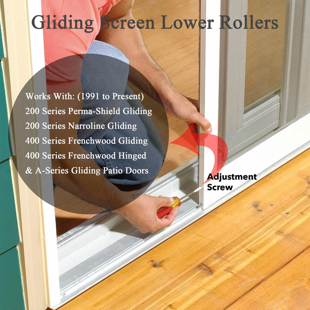 Commonly used to replace gliding patio door insect screen bottom roller assembly for Andersen 200 Series Perma-Shield Gliding, 200 Series Narroline Gliding, 400 Series Frenchwood Hinged, 400 Series Frenchwood Gliding and A-Series Gliding Patio Doors. Compatible with gliding insect screens manufactured from 1991 to present. Works with upper screen rollers part #1997063. Edge adjustment arm allows for easy and quick adjustments with a flat head screwdriver. No tools required to install, the roller housing has two tabs that lock under the frame to hold in place. 2 pack of lower screen rollers included, we recommend replacing both rollers at the same time.