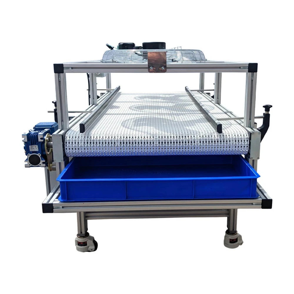 Contact Us Visit Our Store Home About Us Payment Shipping Returns Contact Us View Feedback Add to Favourites Loynds Candy Cooling Conveyor Tunnel - Artisan Candy Manufacturing Machine The Loynds Mini Cooling Tunnel is the perfect accompaniment to our other low volume candy manufacturing machines. Designed and built in the UK, this machine is the ideal solution for a small scale candy factory, giving a good cooling solution in a small footprint. The Cooler sits at the height of a regular work bench, so product can be passed directly from your tabletop machines, or your own hands, onto the conveyor. The machine is manufactured from aluminium extrusion and all contact parts are made from food grade certified materials. There are 3 axial fans located on the top of the candy cooler for even cooling across the mesh belt. The fan speeds can be adjusted which in turn controls the amount of cooling. The mesh belt helps warm air move away from the product being cooled. The belt speed can be adjusted using the inverter controls on the front of the machine. A combination of belt speed and fan speed gives excellent cooling control. Underneath the mesh belt are crumb catchers. These catch and debris candy which can be collected and recycled into subsequent batches. Running along the sides of the candy cooling tunnel are adjustable side guides. Using quick release thumb screws these guides can be moved in our outwards which alters the available width of cooling conveyor. The stand is on Castor wheels which can be locked to prevent the machine moving during operation. Home About Us Payment Shipping Returns Contact Us View Feedback Add to Favourites