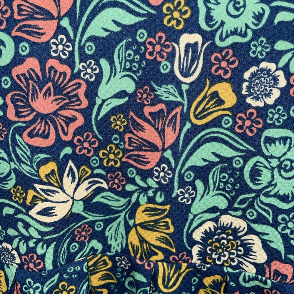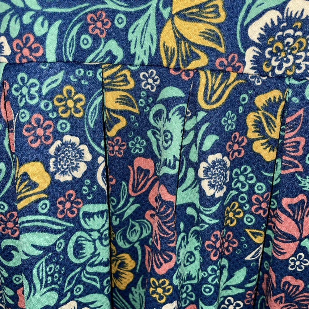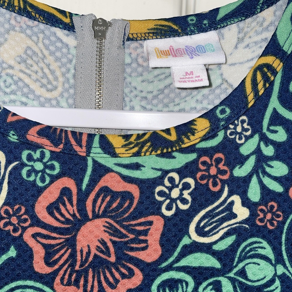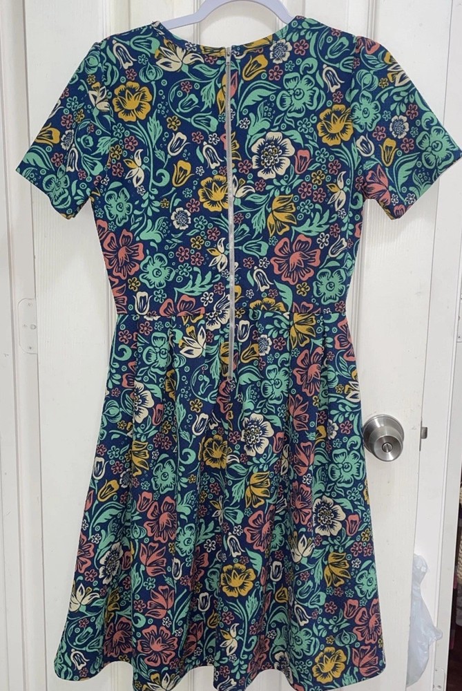 The LuLaRoe Women's Dress Amelia in navy blue, Pink , green, yellow floral pattern is a stylish and versatile fit and flare dress perfect for the spring and summer seasons. Made from a blend of polyester and spandex, this knee-length dress features a round neck, short sleeves, and a charming floral pattern in vibrant shades. With a zipper closure and pockets, this dress combines comfort with a trendy design, making it a standout piece in any woman's wardrobe. Ideal for casual outings or dressed-up events, this LuLaRoe dress is a must-have for any fashion-forward individual.