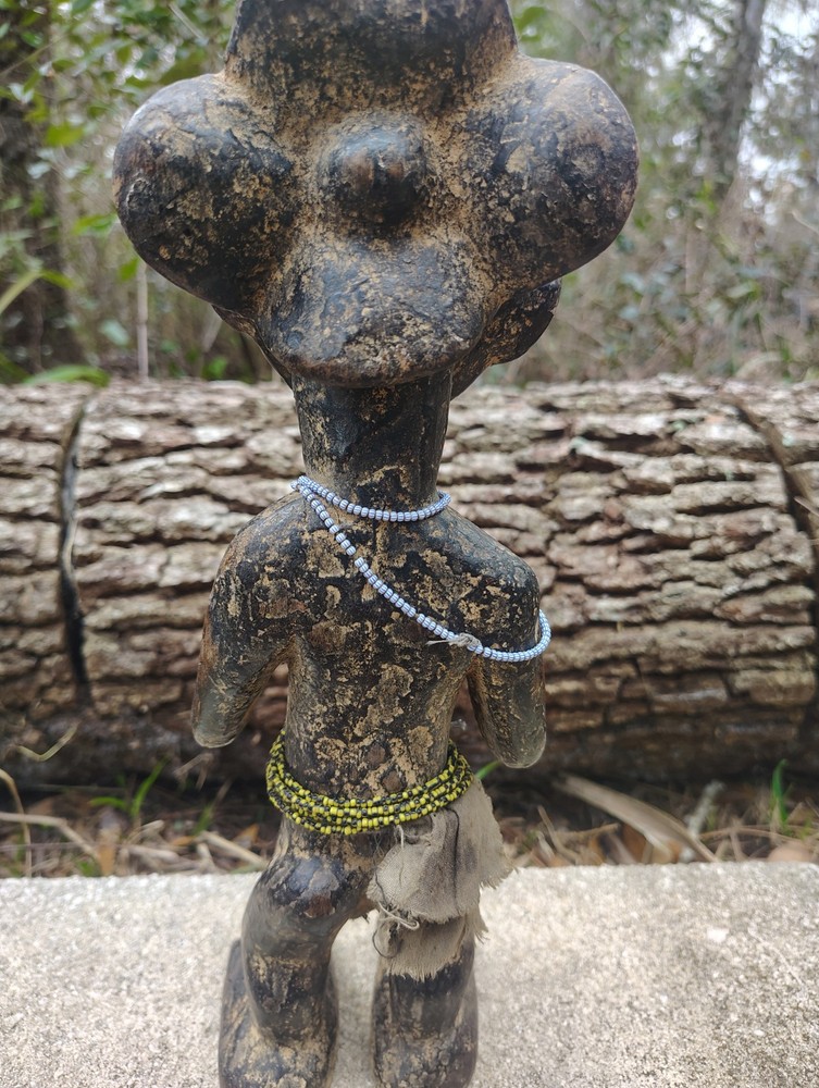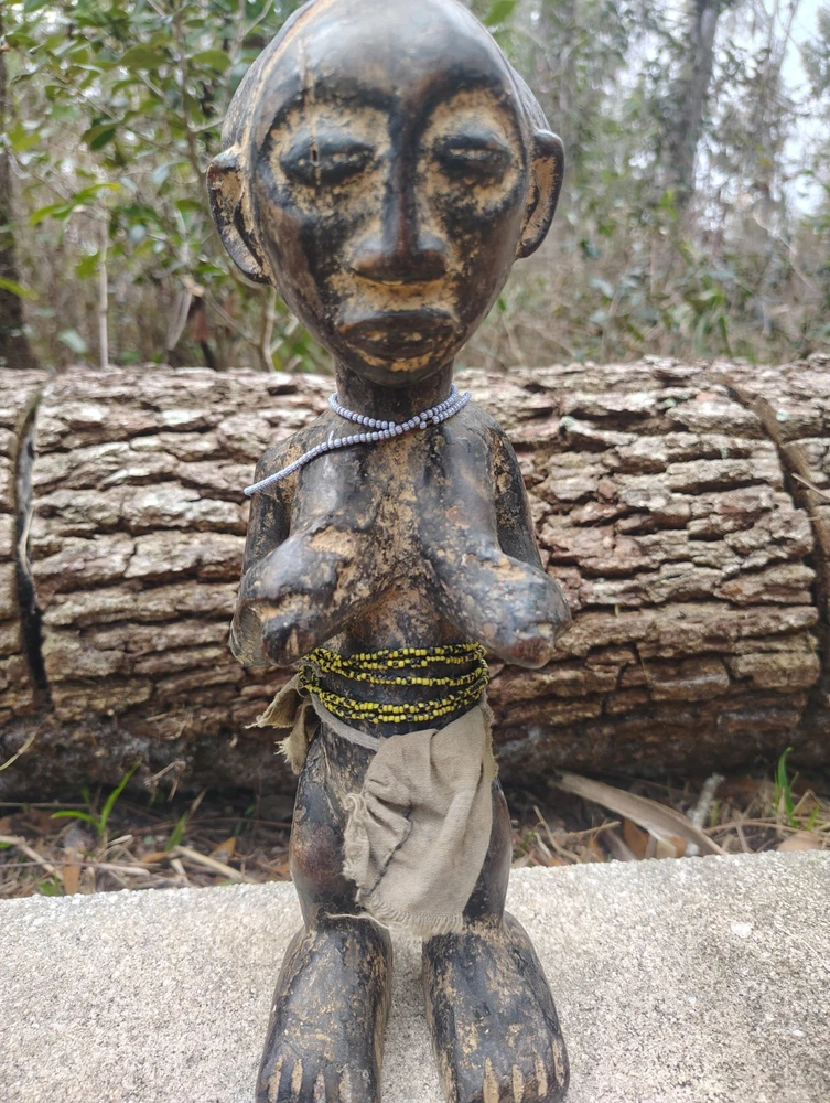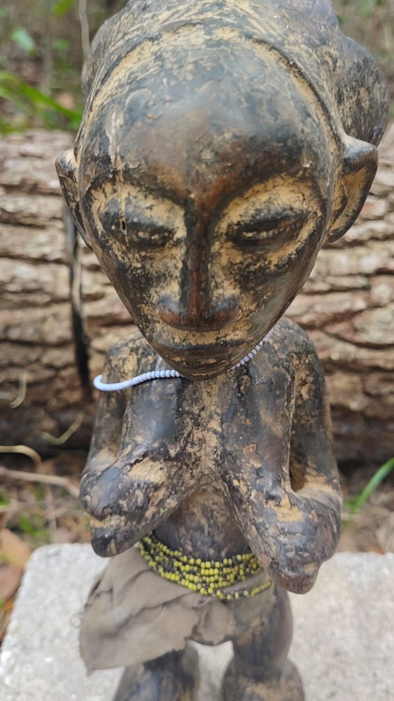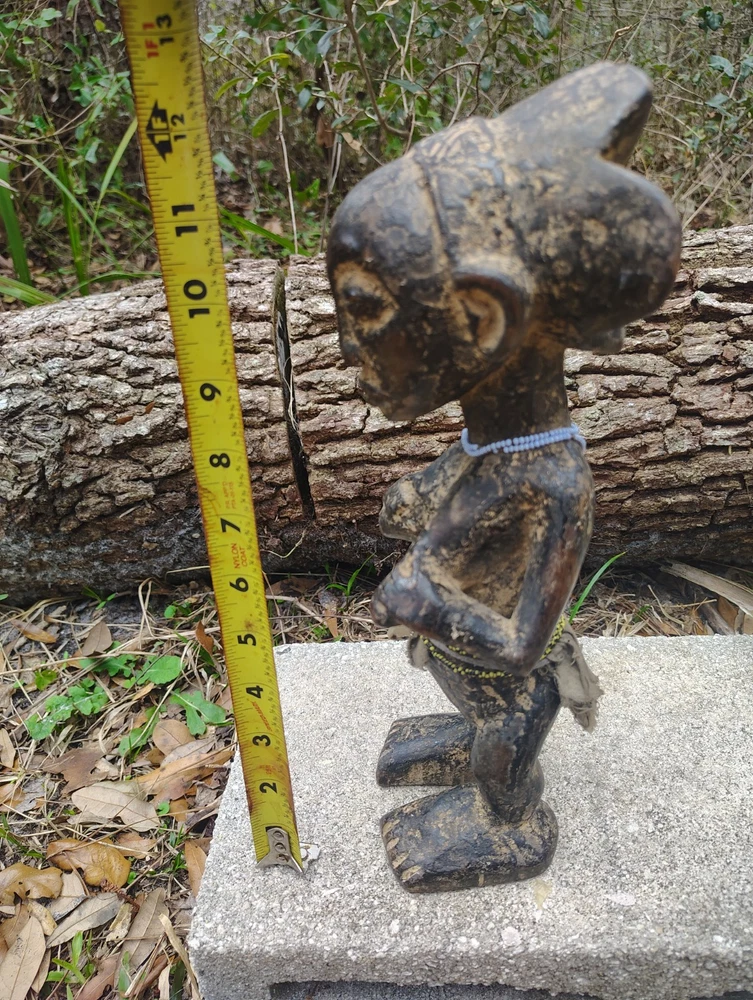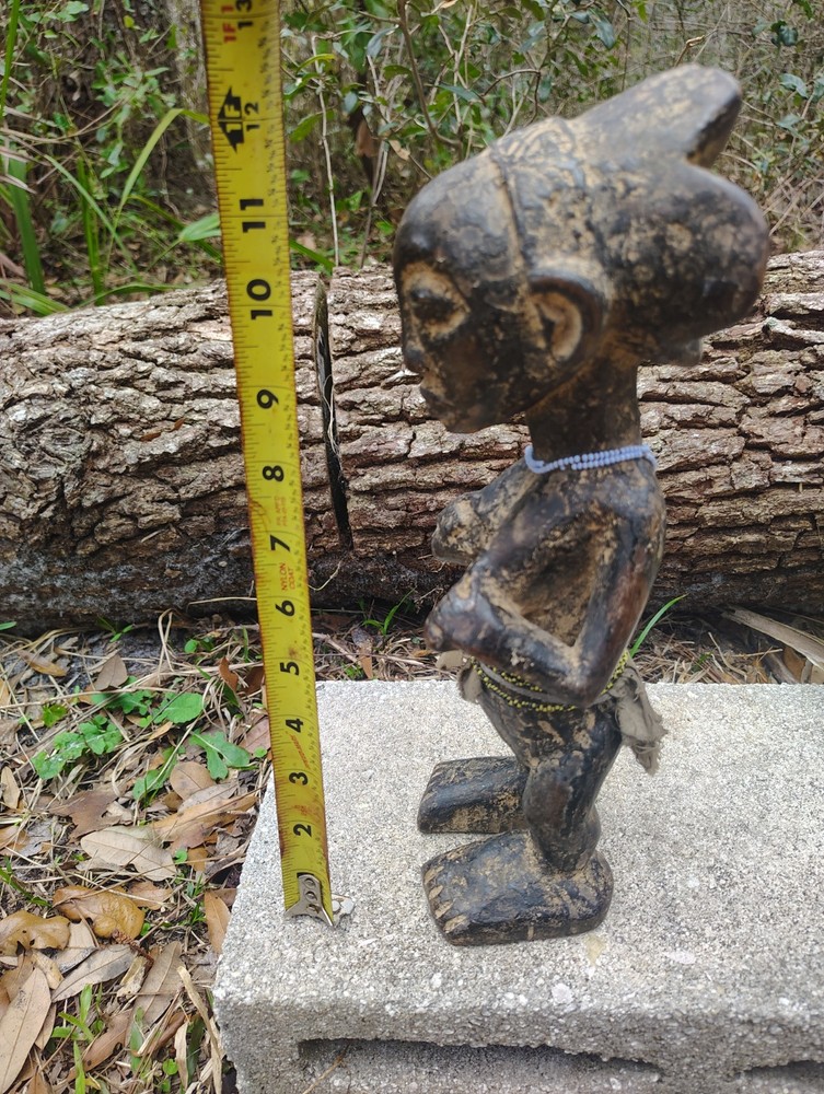 Raw earth USA presents this exceptional Luba female figure statue from Congo. The Luba female figure is crafted as a veneration of feminine beauty and motherhood. Crafted from wood, the Luba female figures are distinct with their hand-carved and distinct head-pieces. The history of the Luba people can be traced back 500 years as they have dominated part of the Congo during that time. Luba society is still a large culture, and their influence remains significant. Luba and their closely related neighbors the Hemba, are some of the most important crafters and carvers in Central Africa This statue stands 12 inches tall by 4 inches wide and 4 inches deep. She is adorned with beautiful beads/cloth It is carved from a solid hardwood. This piece has some cracks/signs of age/repair but is in great condition. True age and usage is unknown. Auction includes standard USPS shipping and insurance