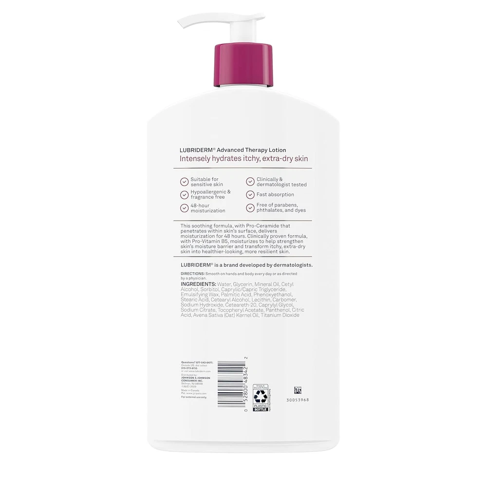 32-fluid ounce bottle of Lubriderm Advanced Therapy Fragrance-Free Daily Moisturizing Lotion+ Pro-Ceramidewith Vitamin E and Pro-Vitamin B5 itchy, extra-dry skinto help strengthen skin’s moisture barrier Specially designedunscented lotion intensely hydratesitchy, extra-dry skin. The soothing formula of the body lotion with Pro-Ceramide penetrates within skin's surface to deliver 48-hour clinically proven moisturization Body lotion is formulated with vitamins E and Pro-Vitamin B5which moisturizes to help strengthen skin's moisture barrier. The non-greasy lotion transforms itchy, extra-dry skin into healthier looking, more resilient skin Clinically- and dermatologist-tested lotion is hypoallergenic and fragrance free. The daily hand and body moisturizer suitable for sensitive skin is formulated free of parabens, phthalates and dyes Lubriderm, a dermatologist developed, advanced therapy lotion absorbs quickly and leaves a clean, non-greasy feel. To use, smooth on hands and body daily or as directed by a physician Lubriderm Advanced Therapy Fragrance-Free Daily Moisturizing Lotion + Pro-Ceramide intensely hydrates and helps relieve itchy, extra-dry skin. From a dermatologist-developed brand, this fragrance-free moisturizing lotion provides 48-hour clinically proven hydration and helps strengthen skin's moisture barrier for more resilient skin. The soothing formula of this non-greasy lotion is suitable for sensitive skin and contains Pro-Vitamin B5 and Vitamin E to moisturize and transform itchy, dry skin into healthier-looking skin. The fast-absorbing formula of this hypoallergenic body lotion has been clinically, and dermatologist tested and is free of parabens, phthalates and dyes. To use, smooth on hands and body daily or as directed. Advanced Therapy Lotion + Pro-Ceramide for extra-dry skin from Lubriderm, a dermatologist developed brand.