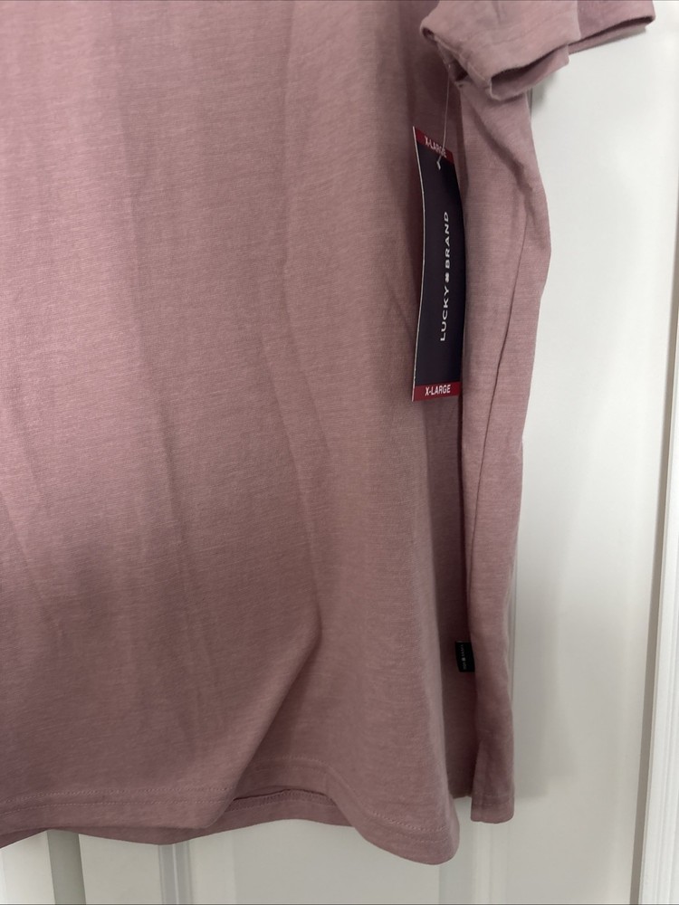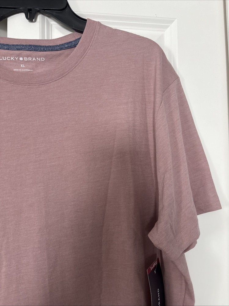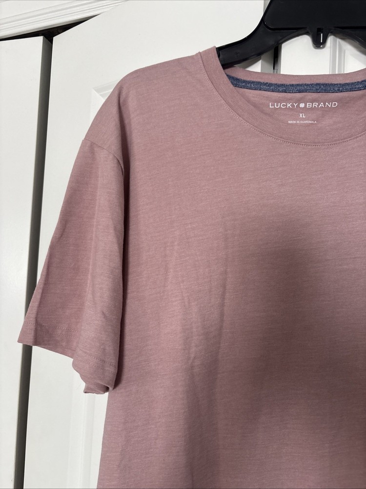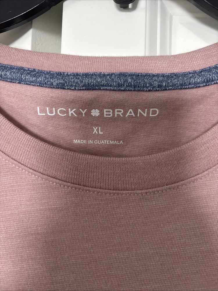 The Lucky Brand Men's XL Tee Shirt is a stylish and comfortable addition to any man's wardrobe. Made from soft cotton material, this short sleeve crew neck shirt features a solid pink color with red accents. The regular fit and classic theme make it perfect for the summer and spring seasons. With its machine washable design, this knit fabric shirt is easy to care for and ideal for everyday wear. Show off your personal style with this quality piece from Lucky Brand.