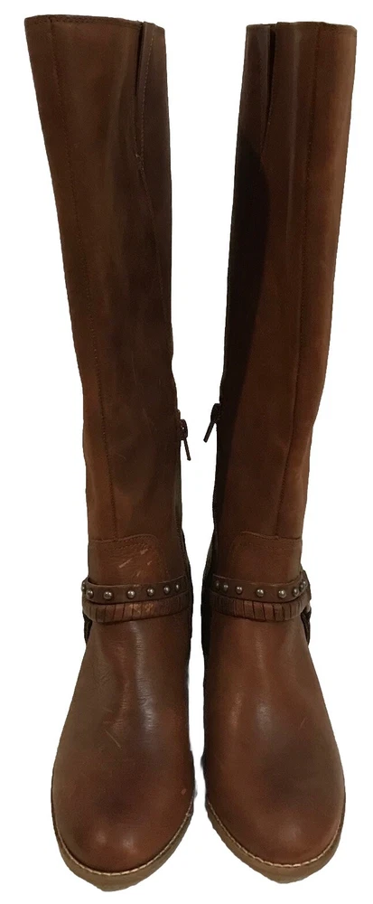 Elevate your equestrian style with these Lucky Brand Karesi Equestrian boots. Crafted from high-quality leather, these boots feature a round toe shape, low heel height, and a zipper closure for easy wear. The solid pattern and brown color make them versatile for any occasion, from casual outings to business meetings to cocktail parties. These women's boots are designed for comfort, with a cushioned insole and lined interior. The outsole is also made of leather, ensuring durability and longevity. Perfect for any season, these boots are a must-have for any fashion-forward woman. Will be shipped & packaged with care.