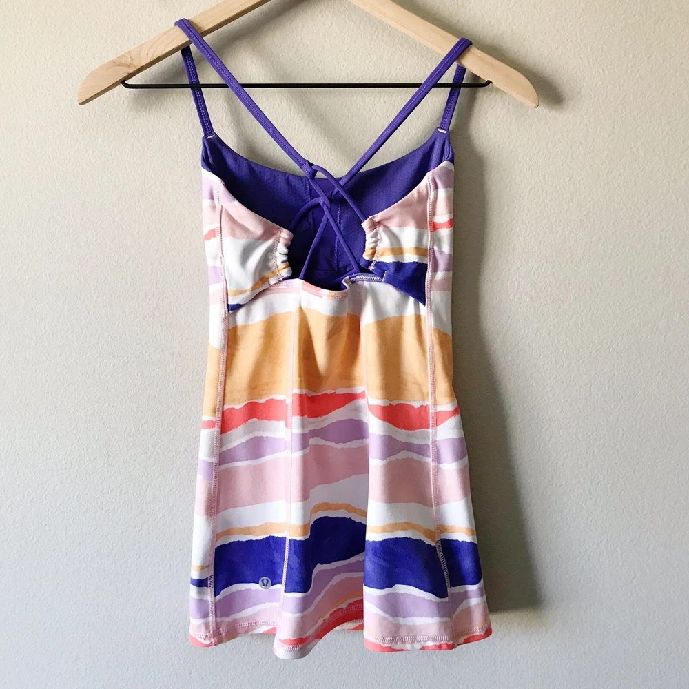 Lululemon Athletica Dancing Warrior Tank in Bleacher Stripe White Iris Flower/Iris Flower. Size 2 (see size dot). Luon fabric. Adjustable strappy back. Moisture wicking and breathable. Stretchy. Pockets for cups, but cups are not included. Retailed for $58. Pre-owned, excellent used condition.