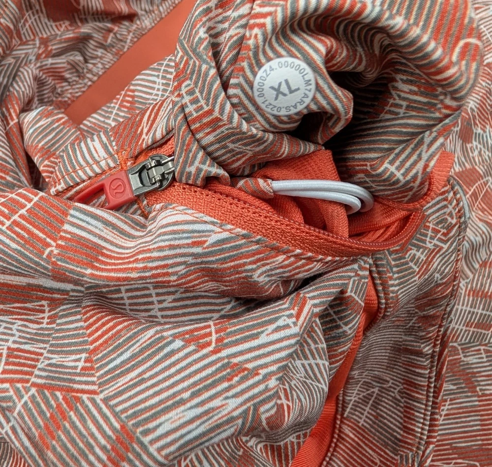 Brand: Lululemon Gender: Men Size: XL Material: Polyester blend Style: Zip-Up / Athletic / Streetwear Features: Full zip, abstract geometric pattern, logo zipper pull, breathable fabric Condition: Pre-owned, excellent condition with no visible flaws Pattern: Geometric / Abstract Occasion: Casual, Activewear Vintage: No Style Code: 000002744