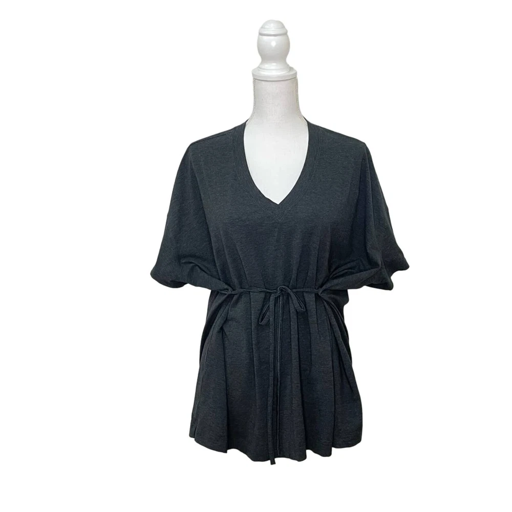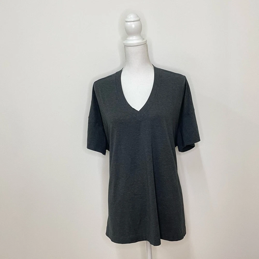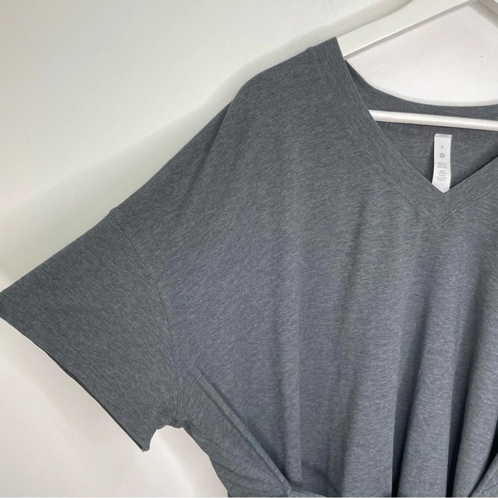 Lululemon Women’s Charcoal Gray Oversized Side Tie V-Neck Short Sleeve Tee Breathable Pima cotton Lycra for stretch Ties on each side Oversized, relaxed fit V-neck Size 8 *approximate measurements: Pit to pit- 30” Length- 26” *excellent preowned condition