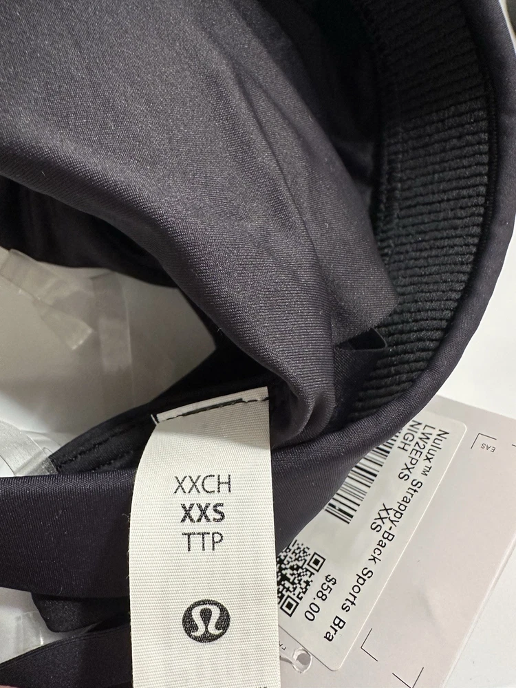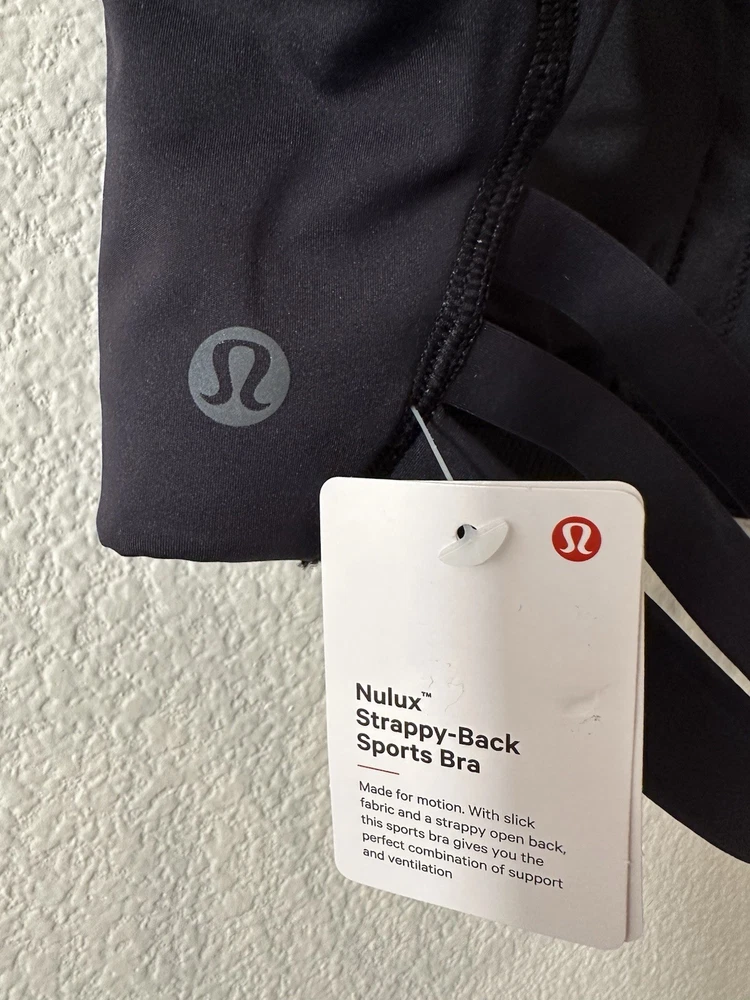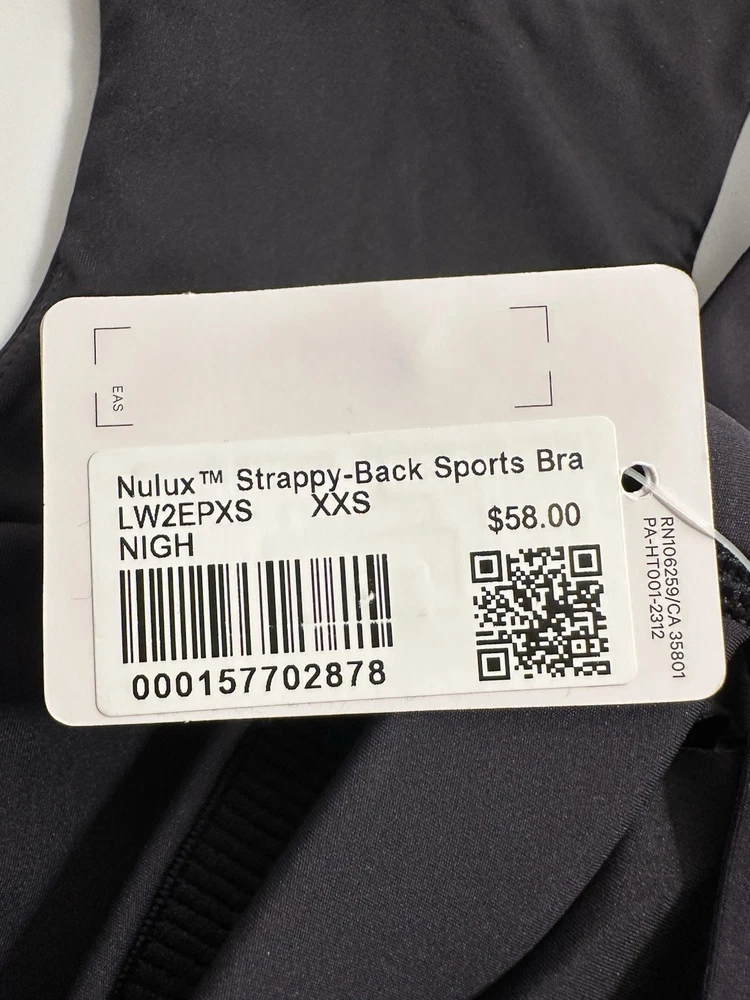 The Lululemon Women's Nulux Strappy Back Sports Bra in size XXS, Nightmoth, is a versatile addition to any activewear collection. Made of a blended fabric with nylon components, this wireless sports bra offers medium support and features a stylish logo accent. The pullover closure and strappy back design make it comfortable for various activities like yoga. The solid black color and full cup coverage add both style and functionality to this machine washable sports bra from the trusted brand Lululemon.