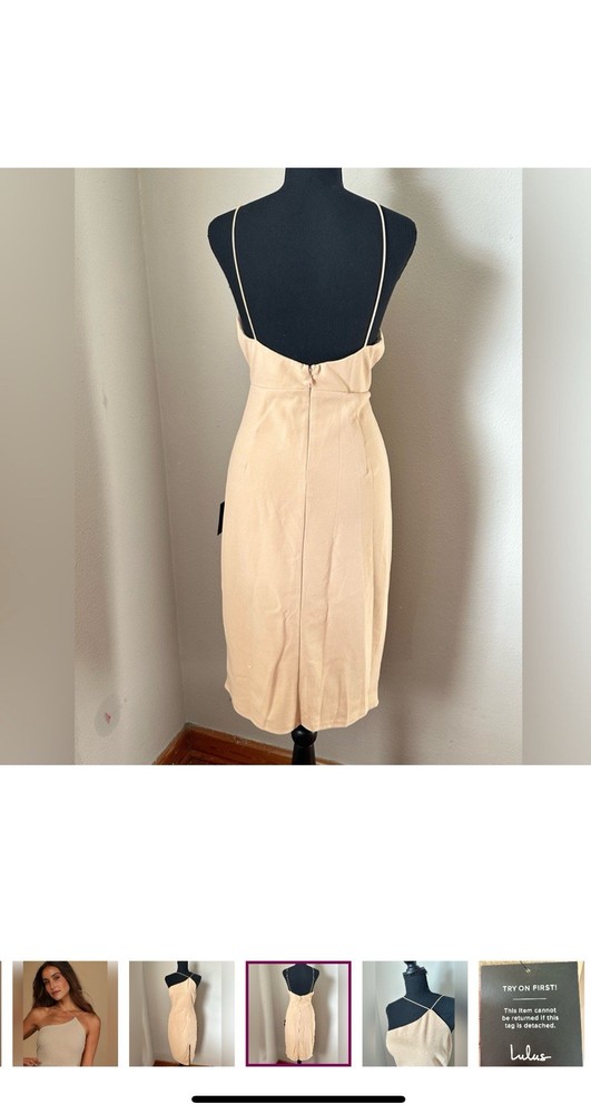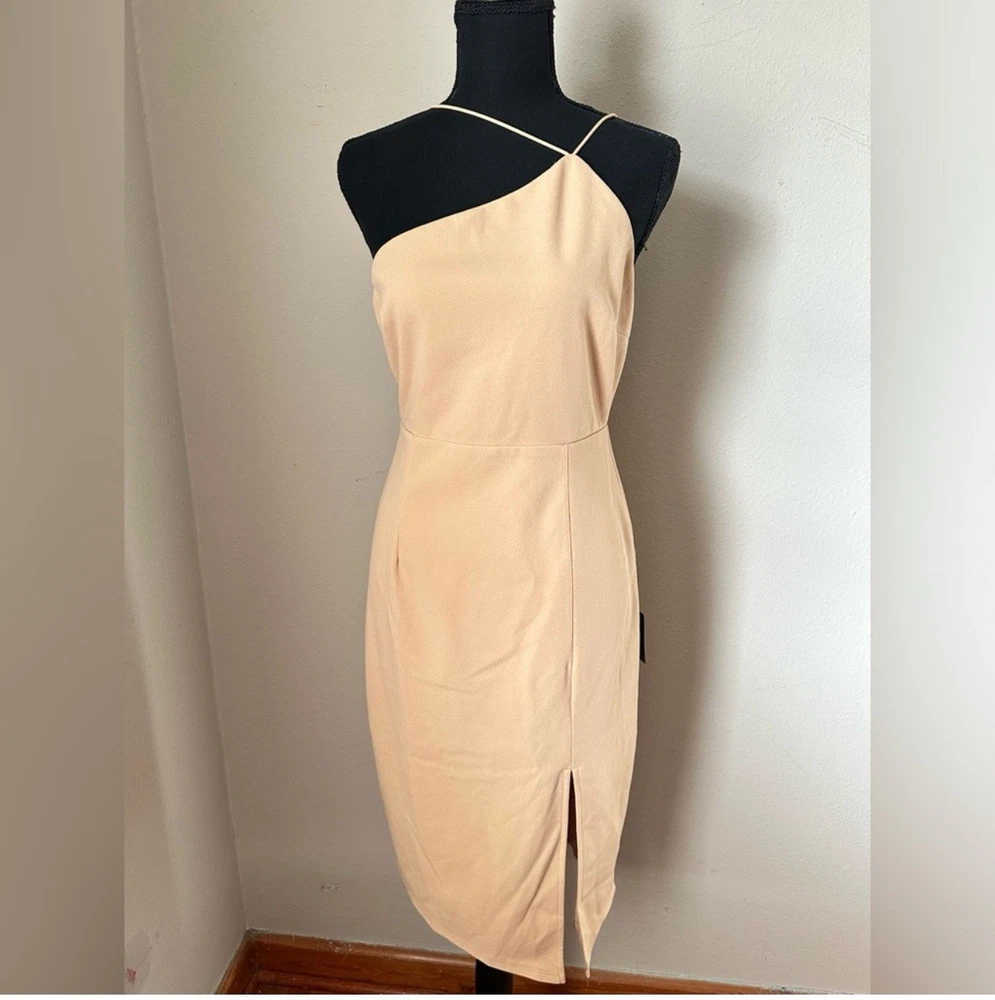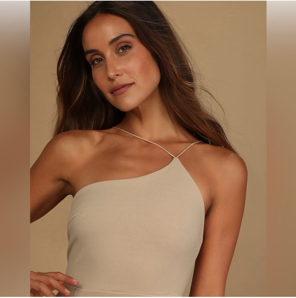 Step out in style with this elegant beige one-shoulder dress. Perfect for any occasion, this dress offers a chic and sophisticated look.