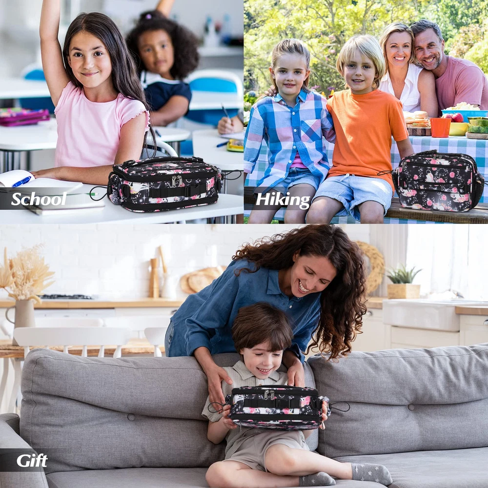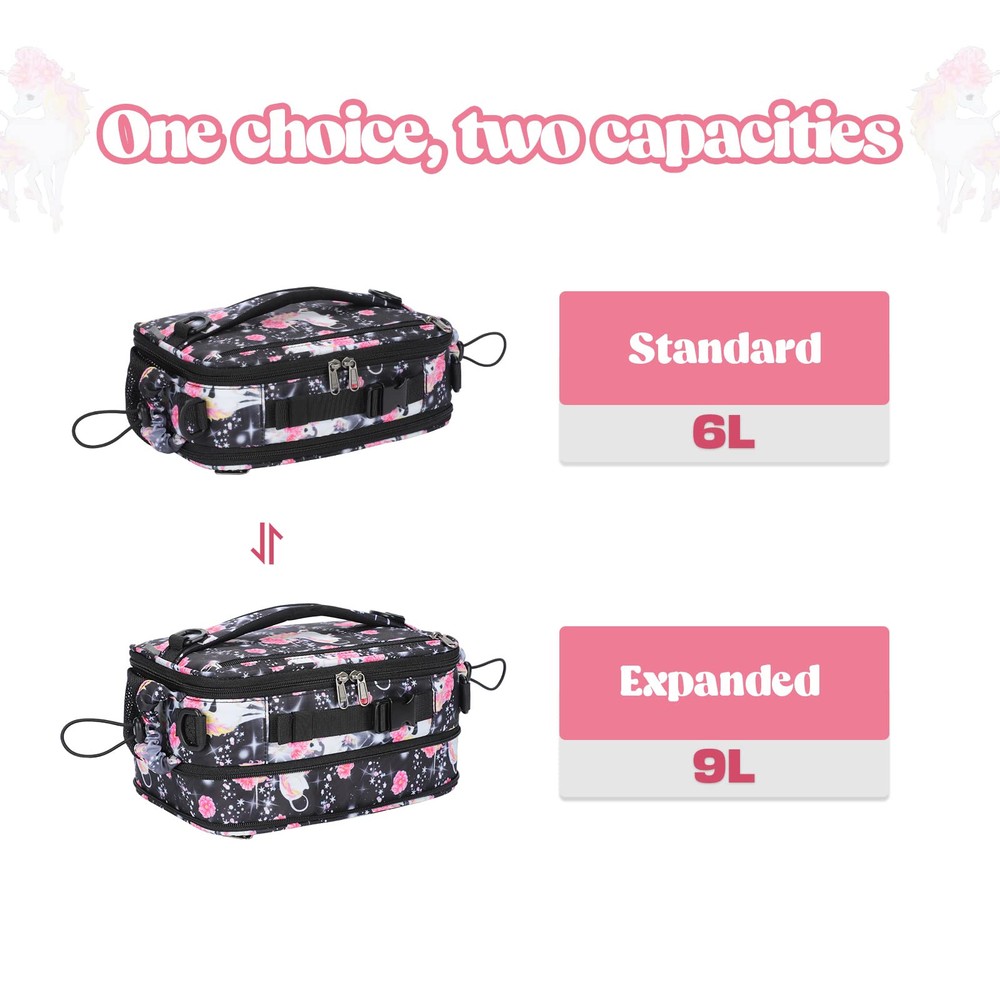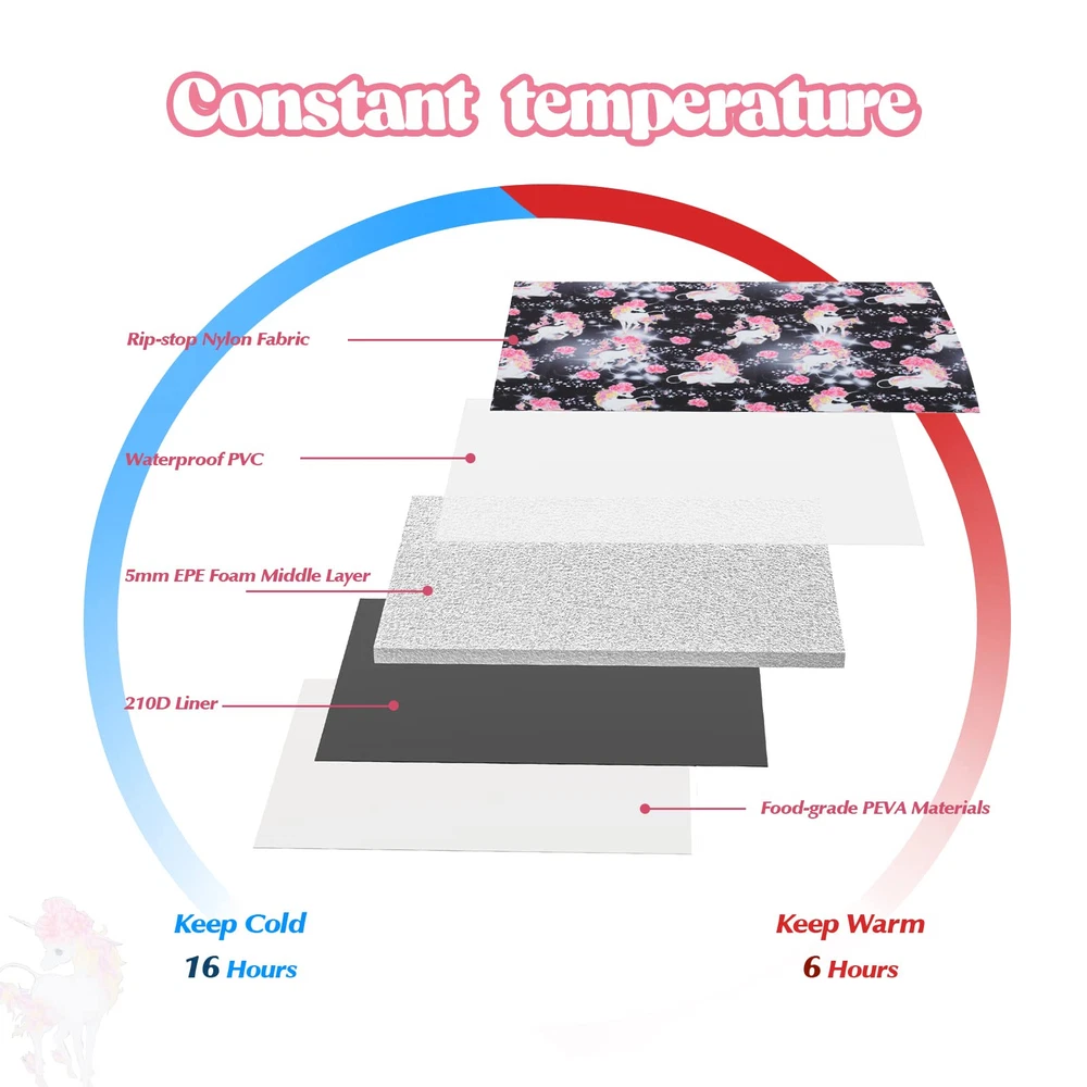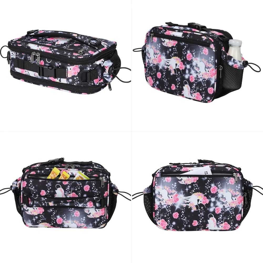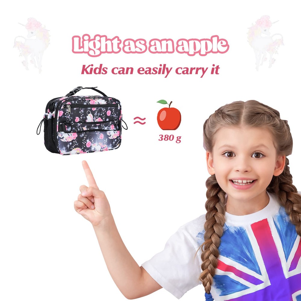 Description The lunch box is specially designed for children. With the concept of “smaller size but larger capacity”, this lunch box for is expandable and foldable. This insulated lunch bag prints with various vivid and interesting patterns. There are 7 kinds available.These reusable lunch box is suit for boys and girls.They could be used in various situation such as school, home, park and so on. Durable:lunch box uses high-quality nylon and SBS zipper.The high-quality SBS zipper used in the lunch box for makes it easy and smooth for children to use.Printed with various vivid and interesting patterns, making children's childhood full of joy.This durable lunch bag could be used in various situation such as school, home, park and so on.The recommended age grading is more than 3 years old. Insulated and Safe: lunch bag is made of thickened PEVA insulating liner and sponge, which is non-and BPA-free. This food-material is suitable for children to use. This lunch box can keep food and beverages at a constant temperature for up to 16 hours. Expandable & Foldable: With a reinforced zipper, top compartment of expandable lunch box can be easily expanded with a simple zipper action.The original measure is 12.4*8.5*3.7 inch (L*W*H),storing 6 L. And the expandable measure could be 12.4*8.5*5.7 inch (L*W*H),storing 9L, which can meet children’s different storing needs. Multi-Pockets: There are retractable mesh pockets on both sides of the lunch box for boys and girls, which can hold towels or small water bottles. There are pockets on the front and back of the reusable lunch bag, the front pocket can hold children's cutlery and the back pocket can hold keys, toy and note book etc. A zippered mesh pocket inside the bag could be used for snacks. Multiple Carrying Choices: Detachable and adjustable straps,handle,buckle,and hooks allow you to hold lunch bag by hand/shoulder.Or you can attach this lunch box to your backpack to keep your hands free.