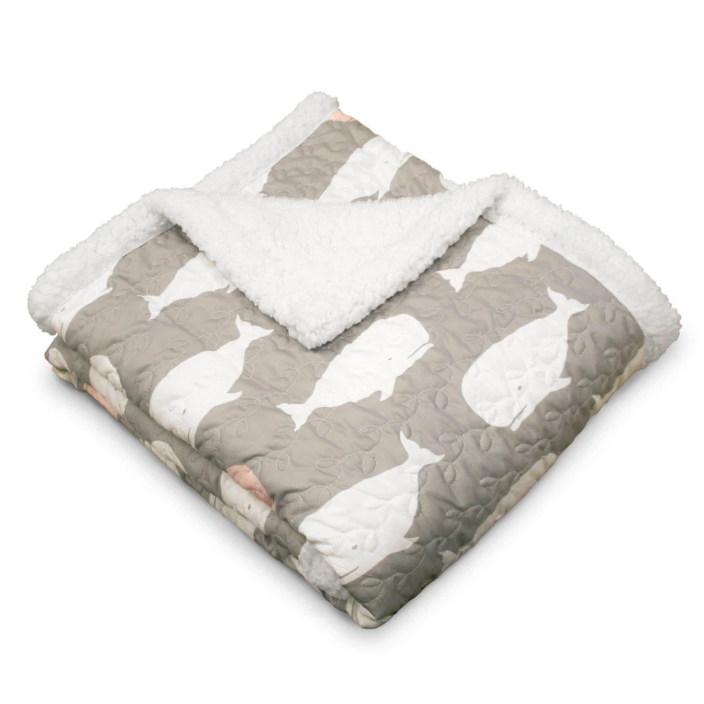 Let the kid inside come alive with this playful Whale Sherpa reverse throw. Perfect touch to any room. Made from micro fiber. Part of the Whale collection. Soft, 100% microfiber fabric reversible Sherpa throw measures 60” x 50”. Adorable, swimming light blue and white whales make for a cute, comfortable, cozy throw. A perfect, fuzzy ocean theme animal blanket for the foot of the bed, pet crate, nursery or as a gift. Two throws in one - white whales against a navy background on one side and a solid white Sherpa blanket on the reverse. Throw is easy to care for and safe to machine wash cold and tumble dry low. Do not iron.