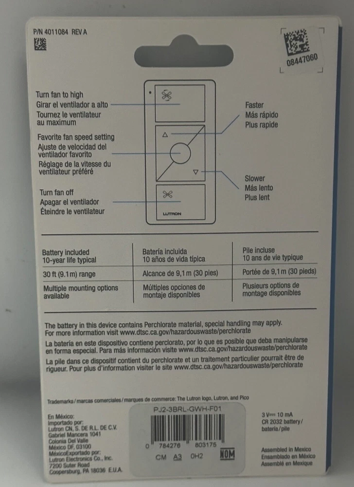 Brand new sealed Control your fan wirelessly from anywhere with the Lutron Pico Remote for Caseta Wireless Smart Fan. This remote control is designed for use with the Lutron smart home system and is compatible with the PJ2-3BRL-WH-F01 model. It features a combination switch style, AC current rating, and a rectangular box shape. The remote control is made of ABS/plastic and plastic materials, and is manufactured in Mexico. It has a universal design that is perfect for any home improvement project. With this remote control, you can easily control your fan from anywhere, making it a must-have for any smart home enthusiast.