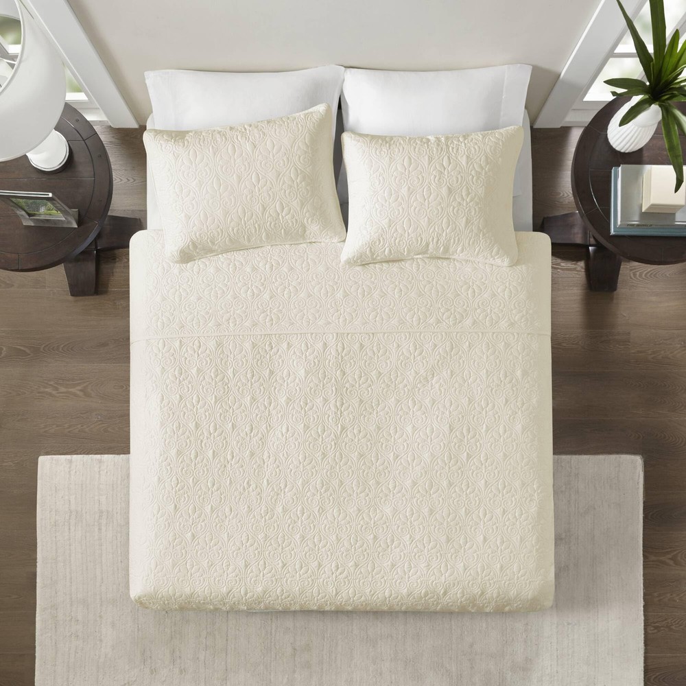 The Madison Park Quebec Reversible Coverlet Set offers a charming cottage-inspired update to your bedroom. The coverlet and shams (1 in Twin/TwinXL) flaunt a classic stitch pattern that creates a rich depth and texture on the face of the bedding set. Prewashed cotton filling provides added comfort and durability making it the perfect for use in the summer or as a layering piece in the winter. FEATURE Soft microfiber fabric in dusty ivory all over floral pattern quilting Set includes: 1 coverlet, 2 standard shams Face: 100Percent polyester filling: 100Percent cotton Measurements: 90-by-90-inch coverlet, 20-by-26-inch standard shams Machine washable