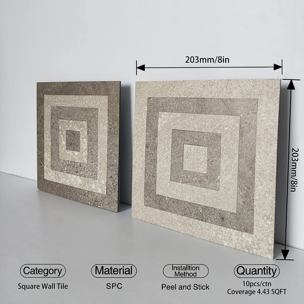 is a DIY home decor brand founded in 2020, California. Too expensive, too many skills and efforts required, and too much time-consuming, we are fully aware that these are the issues for young people when it comes to home renovation. But a new look of the space, a refreshing of life and the desire of the trend, these are things that motivate us to decorate our home as well. Model Description: Large stone tile design, luxury tile with matte texture,natural veins, a modern luxury style, refreshing your home with a simple but elegant wall. Dimensions & packing: Individual piece dimension L x W x H : 8"x8"x0.16", each box contains 10 sheets, which covers 4.83 square feet. Products are well packed with PE foam surrounded to protected damage during transportation. Leaflet contained for better guide of installation & maintenance. Material: Durable thicker environment-friendly stone composite material, made of a latest upgraded SPC vinyl tile base, nice imitation of ceramic tile but of much lighter weight for handling a DIY wall decoration. Premium Feature: Product is waterproof, oil-proof and heat resistant make it super fit for kitchen, bathroom, living room, door way and accent wall backsplashes. Easily wipe to remove stains, protect the walls from splashes and oil. Stronger upgraded backing glue make it better than ordinary wall stickers. 【Special Design】Geometric new pattern design. Tumbled travertine faux stone look, two colors alternate together and you can divide the tile into small squares. The overlap of multiple squares gives us the effect of spatio-temporal tunnel 【Premium Features】These kitchen backsplashes are made of luxury vinyl material. Compared to other peel stick vinyl tiles, wall stickers and panels, LUXURY tiles are much thicker and rigid, and therefore more durable. The tiles are waterproof, oil resistant and heat resistant. Easy to clean and maintain.It is a very beautiful and cost-effective decorative tile for refreshing your home 【Installation Tips】The ambience wall tile is easy to install, just peel its back tape and stick it on. For trimming, just use a utility knife or box cutter to cut open a line from either surface or back and snap to break off (use chainsaw if necessary). This tile can be used in a various scenes, such as kitchen, bathroom, bedroom and living room backsplashes, also can be nice wall decoration for fireplace, doorway, entrance accent. But only for interior decoration, and shower is not recommended 【Size & Package】Each tile is 8”x 8”x 0.16”, there are two patterns in each box and contains 10 pieces, with a total area of 4.83 square feet. We always recommend taking 5~10% more for installation losses concern 【Service Tenet】"Quality first, credibility first, service first" is our purpose to bring a good wall decoration users and satisfaction for clients is our desire. Email us for any questions or concerns