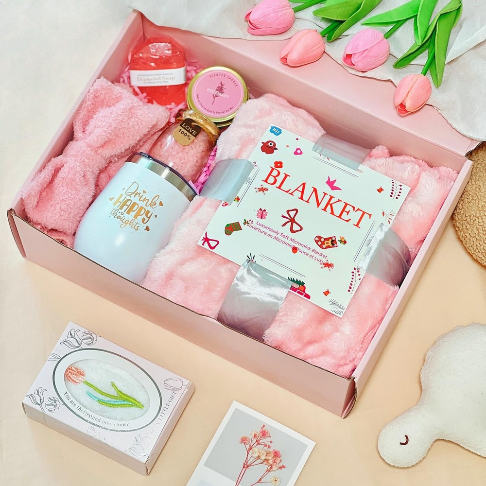Searching for the perfect gift that will make her beam with joy? Look no further than our Spa Baskets for Women Gift. This 12 - piece set is the ideal choice for a wide range of Women's Birthday Gifts, whether you're celebrating your mom's special day or surprising your best friend. The set includes a soft and cozy flannel blanket, perfect for wrapping up in after a relaxing bath. There's also a 12oz insulated tumbler, great for keeping her favorite beverages at the right temperature during her spa time. A rosemary - scented candle fills the air with a calming aroma, setting the mood for relaxation. A handmade soap and a floral - scented soap offer gentle cleansing, while a bath bomb provides a luxurious and soothing bath experience. For added comfort, there's a fluffy headband to keep her hair in place. A dried flower gift card adds a touch of elegance, and the whole set comes in an elegant gift box. What's more, a tulip - themed digital painting set allows for creative expression, and a makeup bag offers practicality. For moms, on their birthdays, what could be more heartwarming than this thoughtful present? As Mom Birthday Gifts or Birthday Gifts for Mom, every item in this spa basket is a gentle consolation for mom's daily toils. Imagine mom, after a long day, wrapping herself in the soft blanket, sipping from the tumbler, and enjoying a bath with the scented products. Instantly, her fatigue fades away. It's not just a birthday gift but a magical box that allows mom to enjoy some exclusive me - time. It's especially suitable as 30th Birthday Gifts for Women for mom, commemorating this significant life milestone. In various Birthday Gifts scenarios, it stands out. As Women's Birthday Gifts or Birthday Gift for Women, the rich contents of the spa basket are truly eye - catching. The recipient can easily create their own "spa day" at home during lazy weekends or after a long day at work, indulging in a warm and soothing atmosphere, and enjoying rare comfort. Our Spa Baskets for Women Gift seamlessly combines luxury and practicality. It's suitable for multiple important occasions, sending the most heartfelt and unforgettable wishes and care to every special woman in your life, becoming a warm and beautiful highlight in their birthday memories. 1.Unique Gifts for Women: Our gift set is a standout present for women. Ideal as birthday gifts for women birthday unique, best friend birthday gifts for women, or sister birthday gifts, it makes her feel cherished. Each item is carefully picked, guaranteeing a memorable unboxing. Let her know she's special with this remarkable set. 2.Luxury Care Package for Women: Our self care gifts for women are meticulously crafted with love. This care package for women is a luxurious spa baskets for women gift filled with items designed to delight and pamper. Whether it's for a birthday, Mother's Day, Christmas, or as a stress - relief gift, it's bound to bring her priceless joy. Let her feel your warm hug and love through this thoughtfully curated set. 3.12 - Piece Self - Care Gift Set for Women: Our care package for women is a complete 12 - item set, perfect for birthday gifts for mom and gift baskets for women. It includes a soft flannel blanket, a tulip - themed digital painting set, a 12oz tumbler, a rosemary - scented candle, soaps, a bath bomb, a fluffy headband, a gift card with dried flowers, an elegant box, and a makeup bag. All these items meet her self - care needs. 4.Soft and Cozy Blanket: Wrap her in love with our blanket, perfect for birthday gifts for women friendship and best friend birthday gifts for women. Incredibly soft, it gives comfort. As it says, "This is my hug to you." A symbol of affection for cozy moments. 5.Relaxing Painting, Aromatherapy & Bath Gifts: Our set has a happy birthday gifts for women blend of a digital painting set, scented candles for gifts for mom birthday, and bath products. The candles and bath items create a soothing mood, and the painting offers a calming activity. A great way to help her unwind. 6.12oz Water Bottle: Our 12oz thank you gifts for women water bottle is a practical and stylish part of our gift set for women. With a 12oz capacity, it's great for carrying drinks. Whether at work or on the go, it's a convenient companion to show your care.