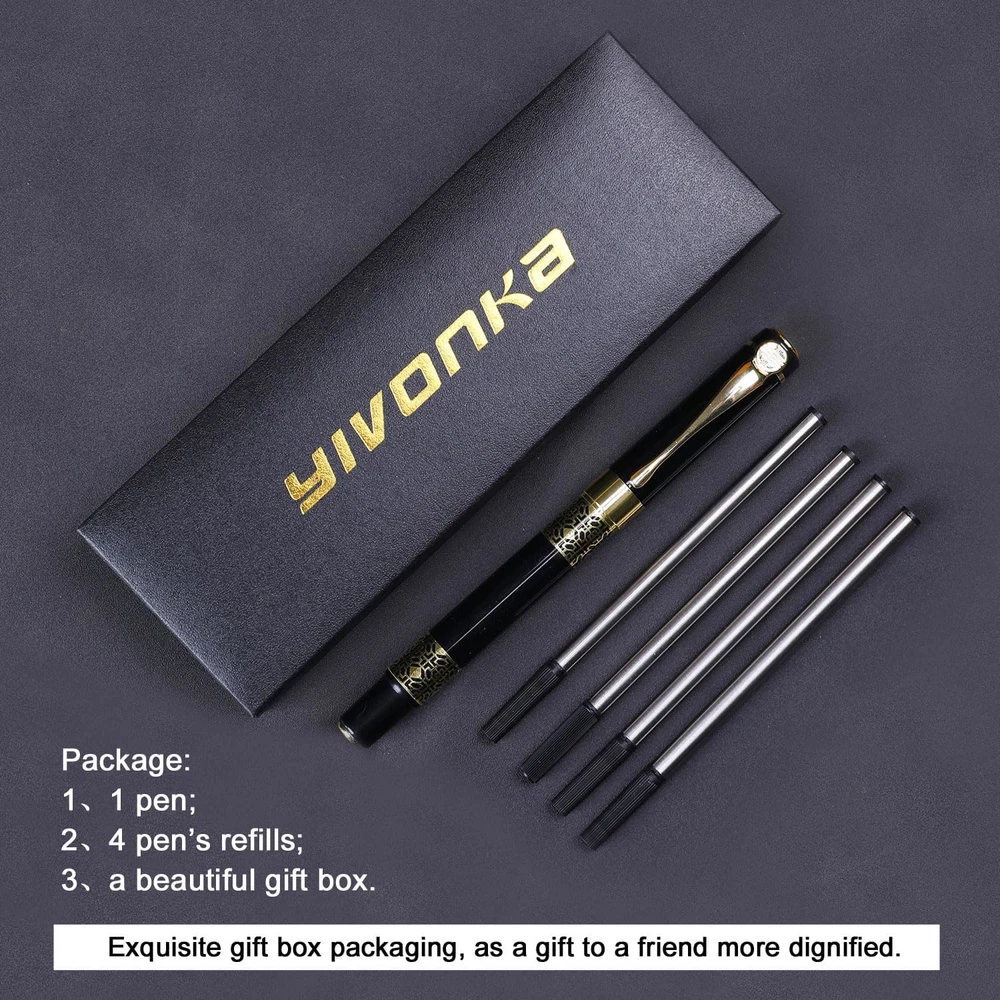 Fast Shipping Great Customer Support Satisfaction Guaranteed DESCRIPTION Shipping Shipping Shipping All domestic packages are shipped for Free (Unless other shipping method was selected during the checkout) Most items ship and arrive much sooner than the estimate delivery date. Usually within 2-3 days from payment. However, we have longer estimates to compensate for the occasional delay or supply chain breakdown. We do not accept P.O. BOXES - PLEASE PROVIDE A PHYSICAL ADDRESS Return Return Return In the event that you would like to return your purchase, we allow returns that are processed within the defined return date (the return date is to be found in the return policy/shipping and handling section) Please contact us for a return authorization and the return shipping address. Payment Payment Payment PayPal is our preferred method of payments it's the quickest, easiest and most secure way to pay for your goods or services online. PayPal offers buyer and seller protection should there be a problem. If you do not have a PayPal account, to get started and buy your first item with us is very easy. Simply click on the 'Buy It Now' button and follow the eBay checkout steps. Select PayPal as the payment method you then will be given the chance to enter your card details in to PayPal's secure checkout in order to pay for your order. Once the payment has been made, you will then be given the opportunity to make your own PayPal account to make paying for your items in the future very easy. Should there be a problem with payment please do let us know. Feedback Feedback Feedback Customer satisfaction is very important to us. If you have any problem with your order,please contact us and we will do our best to make you satisfied, please do not leave a negative feedback before we resolve your problem. We guarantee that your issue will be solved quickly. As long as you are happy with your purchase of , please leave us a positive feedback. Your feedback is very important to us it affects our search placement on eBay. We will leave a positive feedback for you in return automatically once we receive your feedback. Contact Us Contact Us Contact Us If you have any queries, please contact us via ebay. We usually respond within 24 hours on weekdays. Thank you for visiting our ebay store! ★Built to last: Our pen is made with a sturdy steel pipe and multi-layer baking paint, ensuring durability and longevity. ★Smooth writing: With a 0.5mm medium point and high-quality black ink, our pen provides a smooth and continuous writing experience that preserves your text for the long term. ★Classic design: Our pen's classical and retro design exudes charm and sophistication, providing a spiritual enjoyment that's sure to impress. ★Comfortable use: At 39g and 14.4cm/5.67inch, our pen is perfectly weighted and sized for comfortable use, making writing a pleasure. ★Complete Package: Get 1 Black pen, 4 refills, and 1 exquisite gift boxes in one package. ★Versatile: Our pen is perfect for learning and office writing, and makes an exquisite gift for relatives, friends, and business partners. ★Satisfaction guarantee: We stand behind our product with a 100% satisfaction guarantee and provide considerate service to every customer, ensuring you can purchase with confidence. ★Attention: Our store's gift pens are printed with the "YIVONKA" trademark on the gift boxes. After purchasing the gift pen, please make sure to check the product carefully. Thank you! 1、Product Description: ★This exquisite gift box ballpoint pen set is an ideal gift for valuable employees,helpful colleagues or loved ones. ★the design from classical style makes the whole branch full of classical and retro charm, so that the owner has spiritual enjoyment. ★This pen has a textured handle for a strong grip. It has a sense of balance and heavy- weight written on the smooth clean lines of the ball tip. 2、Usage scenario: ★It can be used for writing when students study; ★It can be used for business people to write in office; ★It can be presented as an exquisite gift to relatives, friends or partners. 3、Product information: ★Pen weight: 39g, pen length: 14.4cm/5.67inch, built-in Steel pipe, multi-layer baking paint. Usage: cover pulling type. ★we use high-quality ink,allow your pen to glide smoothly across any type of paper. ★You can replace the ink color with a refill from any local stationery store. ★Package: 1 pen, 4 pen refills and a beautiful gift box, sometimes we will give beautiful gifts; 4、Perfect service: ★we promise 100% return, customer satisfaction is our business purpose, bold and assured purchase, and we will give considerate service to every customer. Luxury Black Ballpoint Pen Refill Gift Set for Men & Women Professional Office Click here to see description Fast Shipping Great Customer Support Satisfaction Guaranteed DESCRIPTION Shipping All domestic packages are shipped for Free (Unless other shipping method was selected during the checkout) We ship within two business days of payment, usually sooner Standard FREE shipping takes between 3-5 business days Expedited shipping takes between 2-3 business days Overnight shipping takes between 1-2 business days We do not accept P.O. BOXES - PLEASE PROVIDE A PHYSICAL ADDRESS We Ship Globally using ebay's GSP, the item is sent to a logistic center in KY and shipped from there to the rest of the world. International customers are responsible for all duties and taxes Contact your local authority for questions related to the amount of duties or taxes you will be responsible for Return In the event that you would like to return your purchase, we allow returns that are processed within the defined return date (the return date is to be found in the return policy/shipping and handling section) Please contact us for a return authorization and the return shipping address. Please contact us for a Return Merchandise Authorization (RMA) number. We advise you to use a reputabl