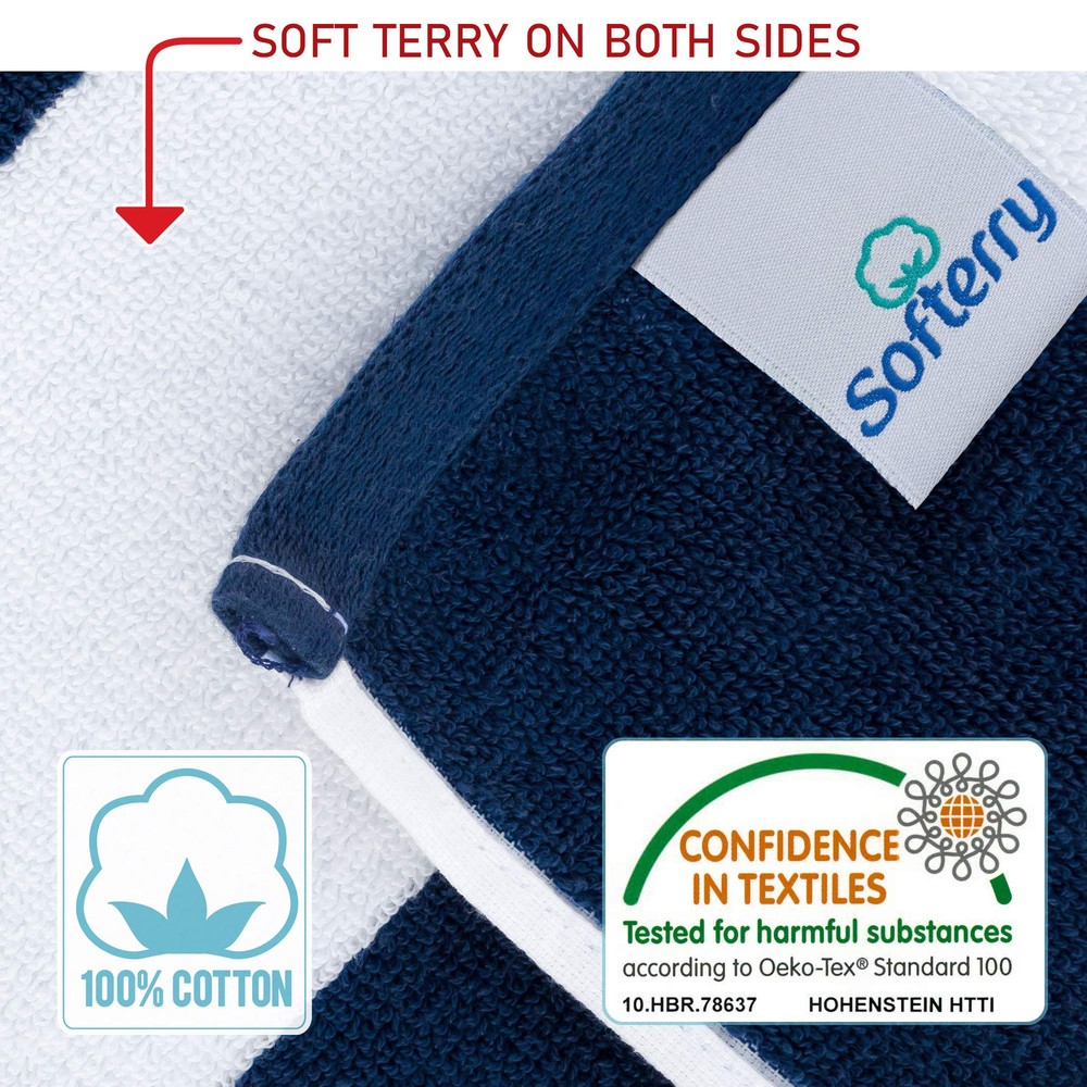 ⭐ OVERSIZED & COMFORTABLE- Designed for ultimate comfort, our extra large 40"x 72" (102 x 180cm) towels offer perfect coverage and noticeable absorbency on both sides. Quantity: One Towel Per pack. ⭐ PREMIUM QUALITY - Heavyweight 550 GSM 2lb. Designed for Premium buyers, this Classic Resort Cabana towel is the same available in many 5 Stars USA Hotels! ⭐ SOFT COTTON- Woven with 100% Premium cotton to make the towels Luxuriously extra soft, comfortable and ready to dry you quickly. ⭐ OEKO-TEX CERTIFIED: 40" x 72" (102 x 180 cm) and weighs 2.2 lbs per pc. To attain the international Oeko-Tex Standard 100 certification, the fabric has been tested and certified to be free from harmful levels of more than 100 substances known to be harmful to human health. It also means that the production cares about the environment being ecologic safe. ⭐ MACHINE WASHABLE: Wash with cold water and tumble dry on low heat. For best results, wash separately the first time to reduce lint transfer. DO NOT use bleach, fabric softeners, and iron.