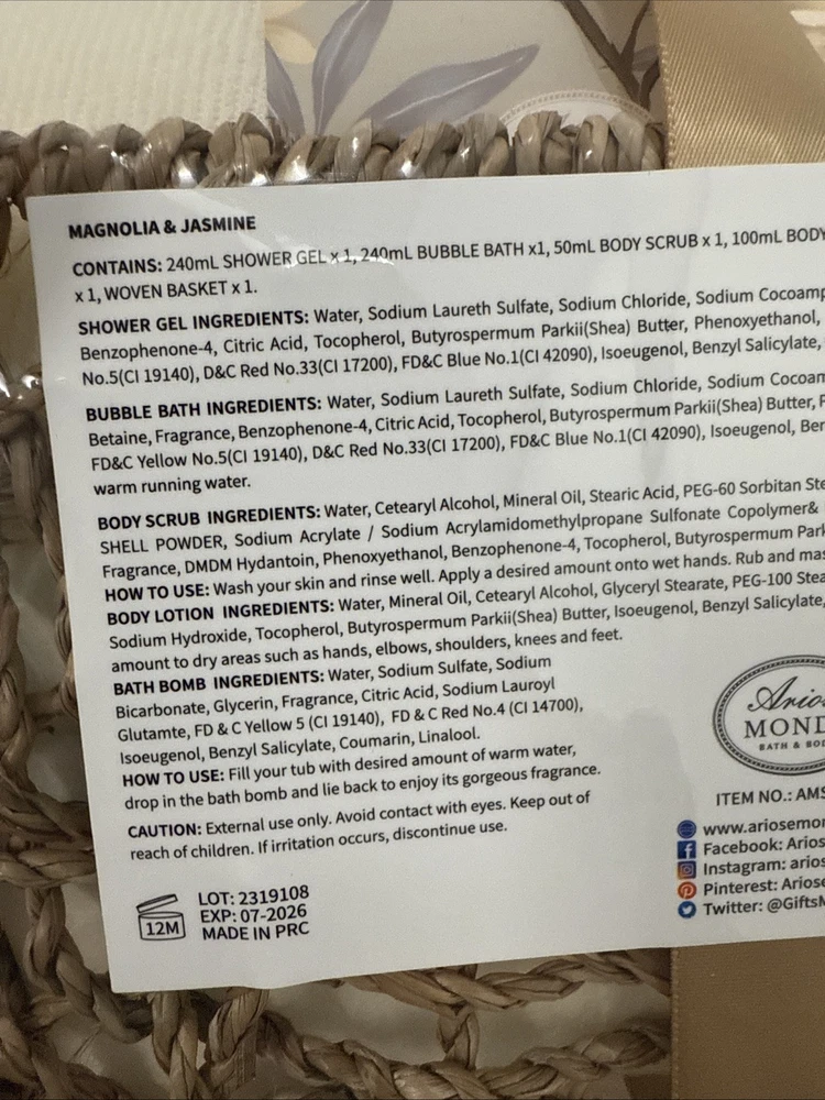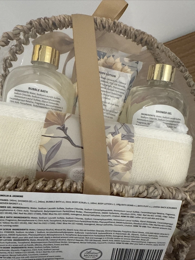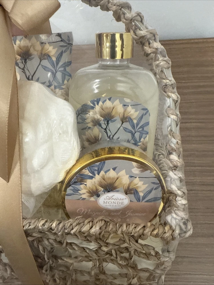 Spa Gift Basket with Magnolia Jasmine Bath Set for Women 6 Items.