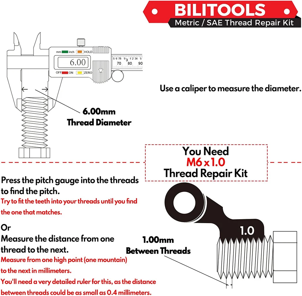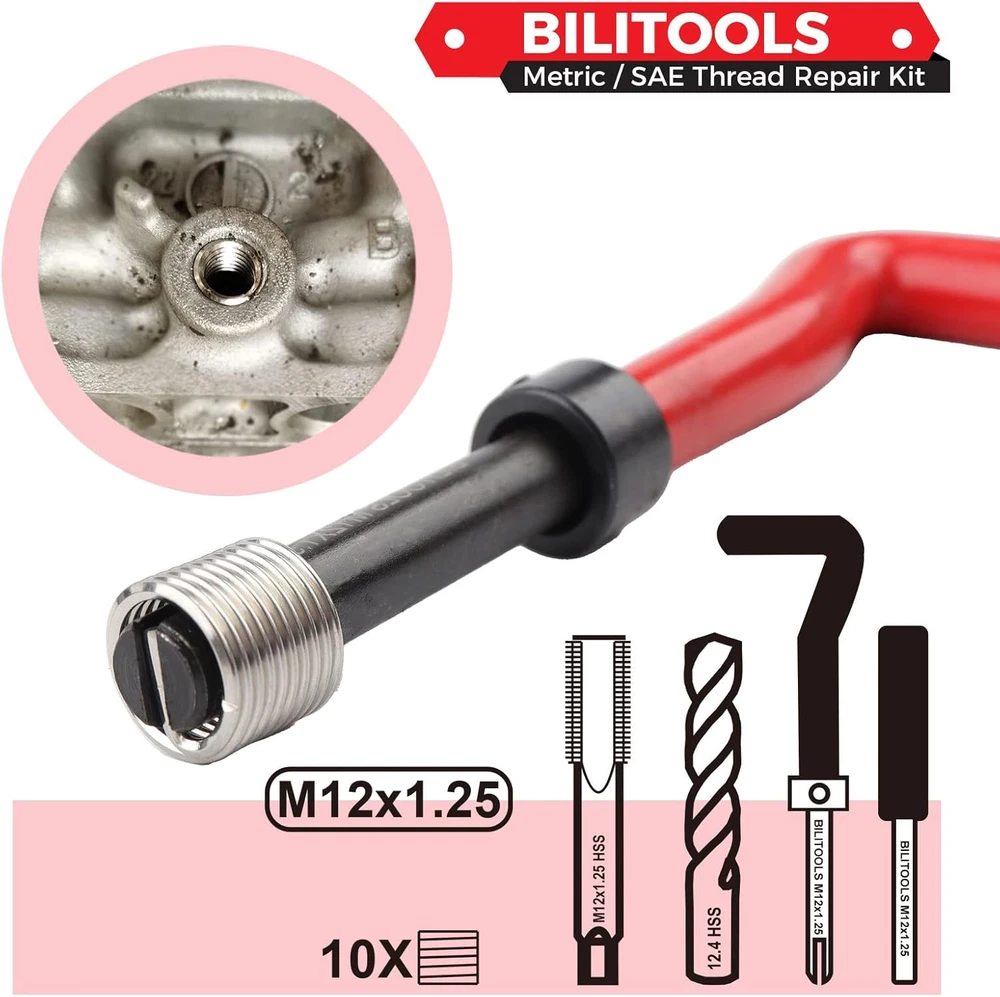 Used for repairing damaged or stripped internal threads and creating a stronger internal thread. Suitable for all metals, composites, polymers and other materials. Our thread repair kit can be widely used in automotive and plumbing applications. 304 Stainless thread inserts create longer lasting durable threads, increase the possibility of higher torque application in weaker metals. 135° apex angle of twist drills, with stronger metal penetration and higher efficiency Thread repair kit includes a collection of tools including HSS drill, tap, thread inserts, installation tool, break pin tool. All the parts are organized in a convenient iron case for easy transport and storage between jobs. Attention: Before you buy this kit, please make sure which size do you need. If you don't know, Please see the picture 6. Product Description 1 Step 1: Drill 2 Step 2: Tap 3 Step 3: Install 4 Step 4: Tap down Thread Repair Kit Instruction Be sure to keep the drill at a 90-degree angle to the surface when drilling. Cut threads in the hole with the tap provided, and be sure to lubricate the tap with cutting oil. Ensure that the tap is properly aligned and perpendicular to the workpiece to prevent cross-threading. Clamp the appropriate tap in a tap wrench. Commence the thread cutting using firm and even pressure - with a quarter turn clockwise, followed by a quarter turn anti-clockwise to clear the metal shavings from the thread. Attention: This product is not suitable for spark plug thread repair!!! Metric Thread Repair Kit Metric Thread Repair Kit HSS Material of Drill HSS M5 x 0.8 Size M6 x 1.0 304 Stainless Material of Inserts 304 Stainless 25x Number of Inserts 25x HSS Material of Drill HSS M5 x 0.8 Size M8 x 1.25 304 Stainless Material of Inserts 304 Stainless 25x Number of Inserts 25x HSS Material of Drill HSS M5 x 0.8 Size M10 x 1.0 304 Stainless Material of Inserts 304 Stainless 25x Number of Inserts 10x HSS Material of Drill HSS M5 x 0.8 Size M10 x 1.25 304 Stainless Material of Inserts 304 Stainless 25x Number of Inserts 10x Metric Thread Repair Kit Metric Thread Repair Kit Metric Thread Repair Kit Metric Thread Repair Kit Metric Thread Repair Kit Metric Thread Repair Kit HSS Material of Drill HSS M10 x 1.5 Size M12 x 1.25 304 Stainless Material of Inserts 304 Stainless 10x Number of Inserts 10x HSS Material of Drill HSS M10 x 1.5 Size M12 x 1.5 304 Stainless Material of Inserts 304 Stainless 10x Number of Inserts 10x HSS Material of Drill HSS M10 x 1.5 Size M14 x 1.25 304 Stainless Material of Inserts 304 Stainless 10x Number of Inserts 8x Metric Thread Repair Kit Metric Thread Repair Kit Metric Thread Repair Kit SAE Thread Repair Kit SAE Thread Repair Kit HSS Material of Drill HSS 1/4-20 Size 5/16-18 304 Stainless Material of Inserts 304 Stainless 25x Number of Inserts 25x HSS Material of Drill HSS 1/4-20 Size 3/8-16 304 Stainless Material of Inserts 304 Stainless 25x Number of Inserts 10x HSS Material of Drill HSS 1/4-20 Size 7/16-14 304 Stainless Material of Inserts 304 Stainless 25x Number of Inserts 10x SAE Thread Repair Kit SAE Thread Repair Kit SAE Thread Repair Kit