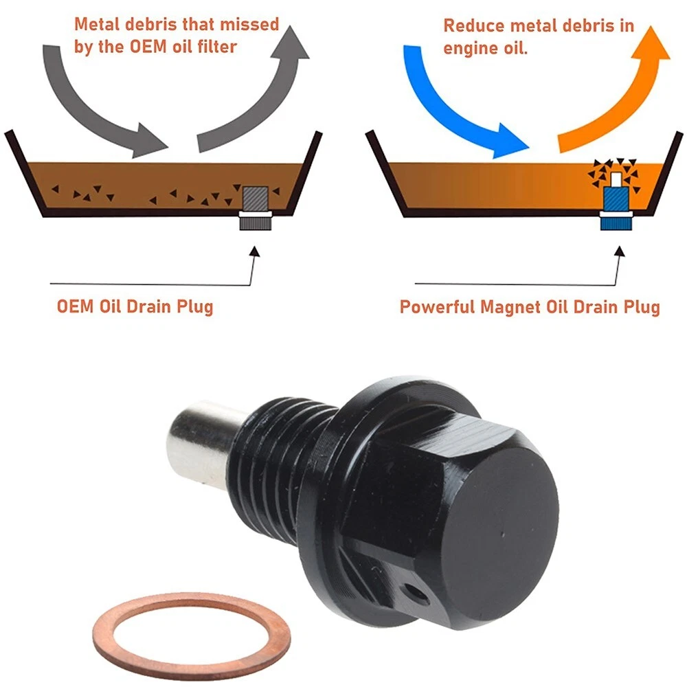 Product Description: 100% brand new and high quality. Name: Magnetic Oil Pan Screw Material: Aluminum Alloy Size: M14*1.25 Color:Black,(The default shipping color is black,Our store also has red, blue, silver, purple, gold, if you want a different color, please leave a message when you pay, thank you). Features: 1. Easy installation, lightweight 2. To reduce engine wear with a magnetic oil drain plug 3. Trapping contaminants and metallic particles that do the most harm 4. With magnet oil drain sump plug, trap the smaller for nanoparticles that don't get filtered 5. Magnetic drain plug is to help keep harmful metal shaving out of your engine. 6. Over time your engine components wear down they will start to release metal shavings into your engine oil. -These plugs have an incredibly strong magnet to help gather this debris directly out of your oil during operation. 7.When it comes time to change your oil just clean off the magnetic end and reused it Applicable Model : Universal fit for most Honda/Acura/Mazda/Mitsubishi/Suzuki/Ford/Hyundai and more selected models Please check the size of your original plug before you purchase. Note: This product is mainly used for decoration, which is different from the oil pan screws of the original vehicle!!!! Packa ge included: 1 x Magnetic Oil Drain Plug