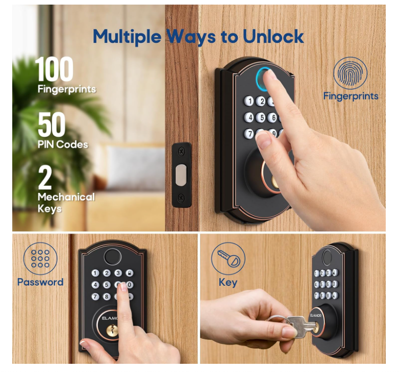 Advanced Fingerprint Unlock: Equipped with cutting-edge biometric recognition, our smart door lock identifies fingerprints in 0.3 seconds and unlocks in 1 second with a 99.99% accuracy rate, ensuring fast and reliable access. 3-in-1 Keyless Unlock: Our fingerprint door lock with 2 Lever handles supports up to 100 fingerprints and 50 PIN codes, perfect for large families or shared spaces. It includes 2 backup keys for emergencies, and no app or Wi-Fi is needed—your finger is the key to unlocking. Auto Lock & One-Touch Locking: The automatic locking feature secures your door 5–30 seconds after unlocking, ensuring safety even if you're distracted. One-touch locking adds convenience for quick and secure closure. Durable & Long-Lasting: Built with a robust aluminum alloy, IP54 waterproofing, and a durable lock cylinder, the front door handle sets includes a low-battery LED indicator and emergency USB Type-C power supply, offering lasting reliability and protection. Easy to Install: Install in minutes with a basic screwdriver. The adjustable design fits most door frames, with a center distance range of 2-3/8" (60mm) to 2-3/4" (70mm) for seamless integration.