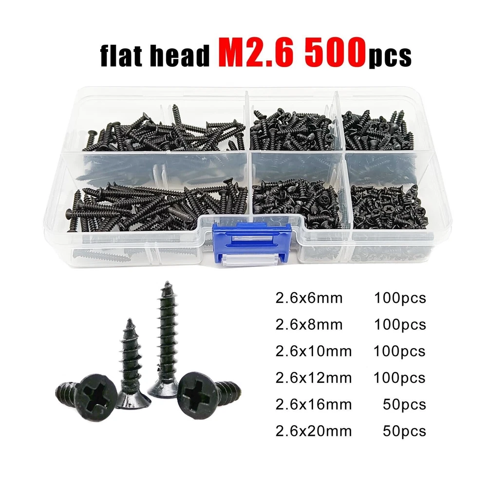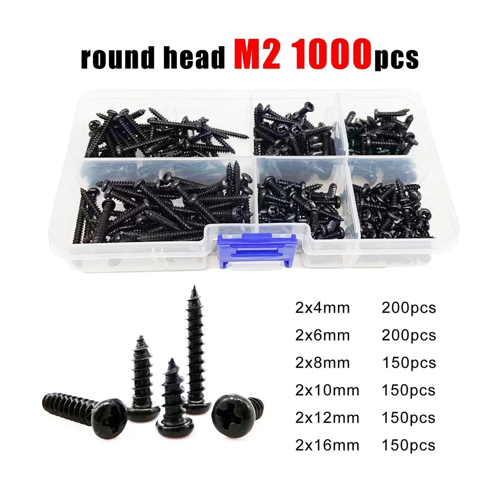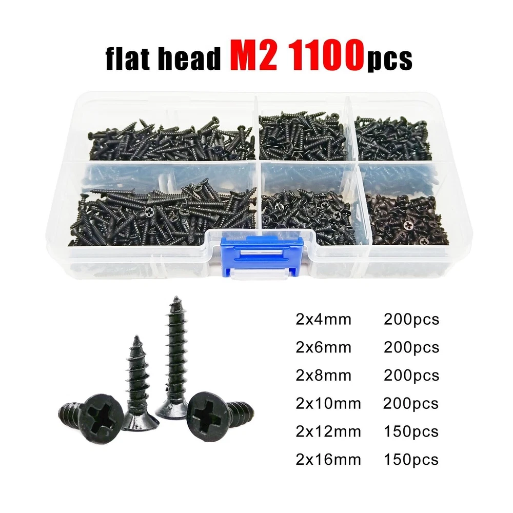Material Black carbon steel Box include flat head M2 1100pcs 200pcs M2x4 + 200pcs M2x6 + 200pcs M2x8 + 200pcs M2x10 +150pcs M2x12 +150pcs M2x16 round head M2 1000pcs 200pcs M2x4 + 200pcs M2x6 + 150pcs M2x8 + 150pcs M2x10 +150pcs M2x12 +150pcs M2x16 flat head M2.6 500pcs 100pcs M2.6x6 + 100pcs M2.6x8 + 100pcs M2.6x10 + 100pcs M2.6x12 + 50pcs M2.6x16 + 50pcs M2.6x20 round head M2.6 500pcs 100pcs M2.6x6 + 100pcs M2.6x8 + 100pcs M2.6x10 + 100pcs M2.6x12 + 50pcs M2.6x16 + 50pcs M2.6x20 flat head M3 300pcs 50pcs M3x8 + 50pcs M3x10 + 50pcs M3x12 + 50pcs M3x16 +50pcs M3x20 + 50pcs M3x25 round head M3 300pcs 50pcs M3x8 + 50pcs M3x10 + 50pcs M3x12 + 50pcs M3x16 +25pcs M3x20 + 25pcs M3x25 On Dec 14, 2024 at 18:31:32 PST, seller added the following information:
