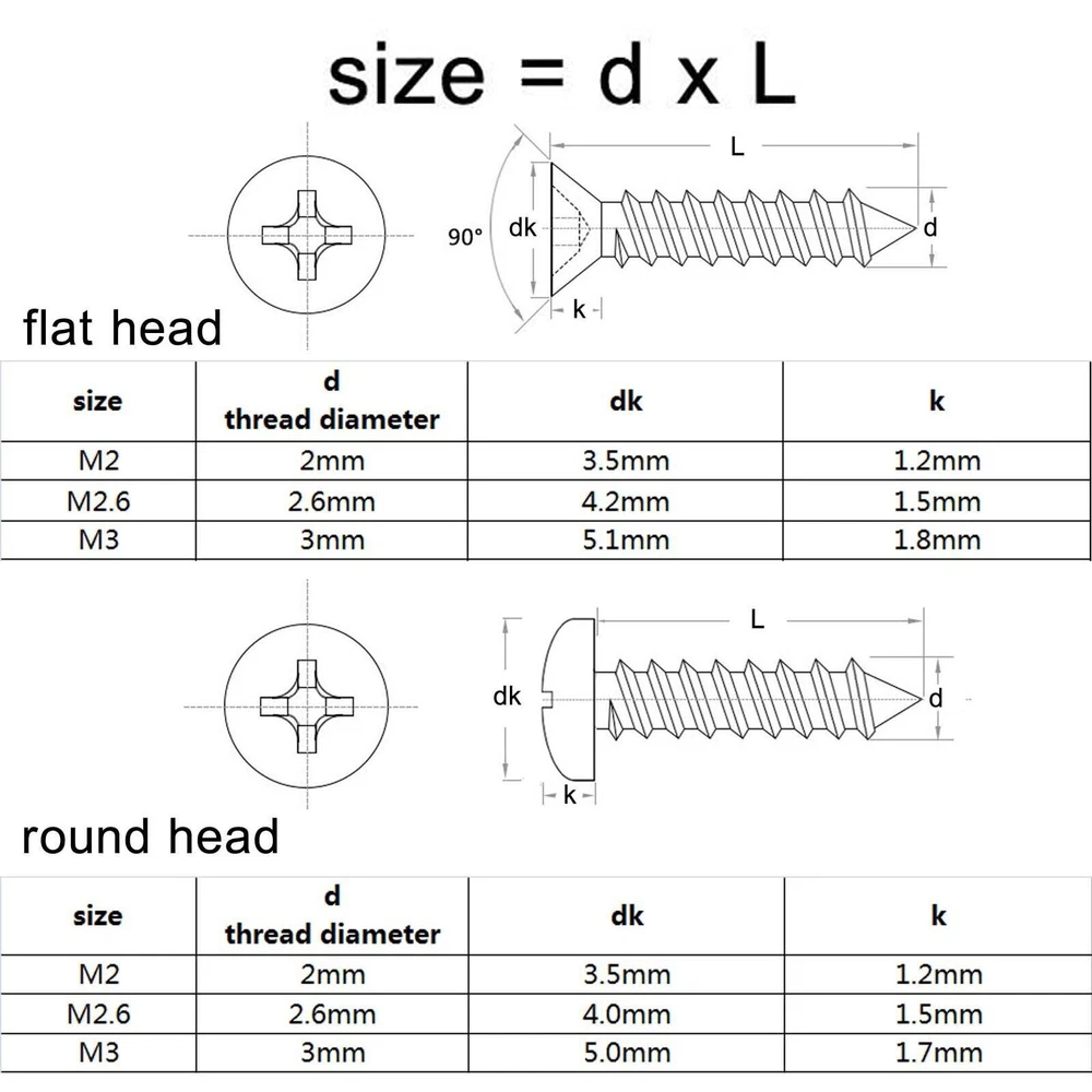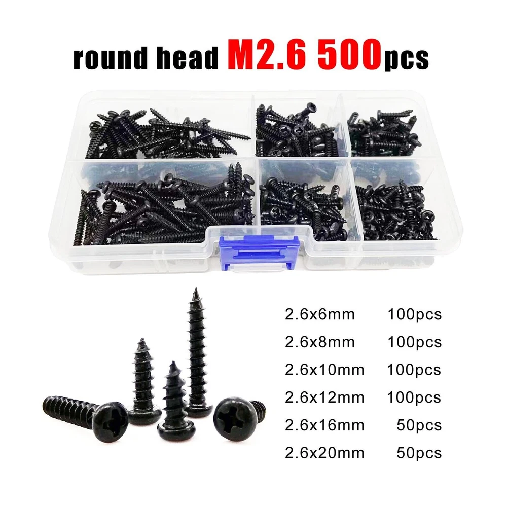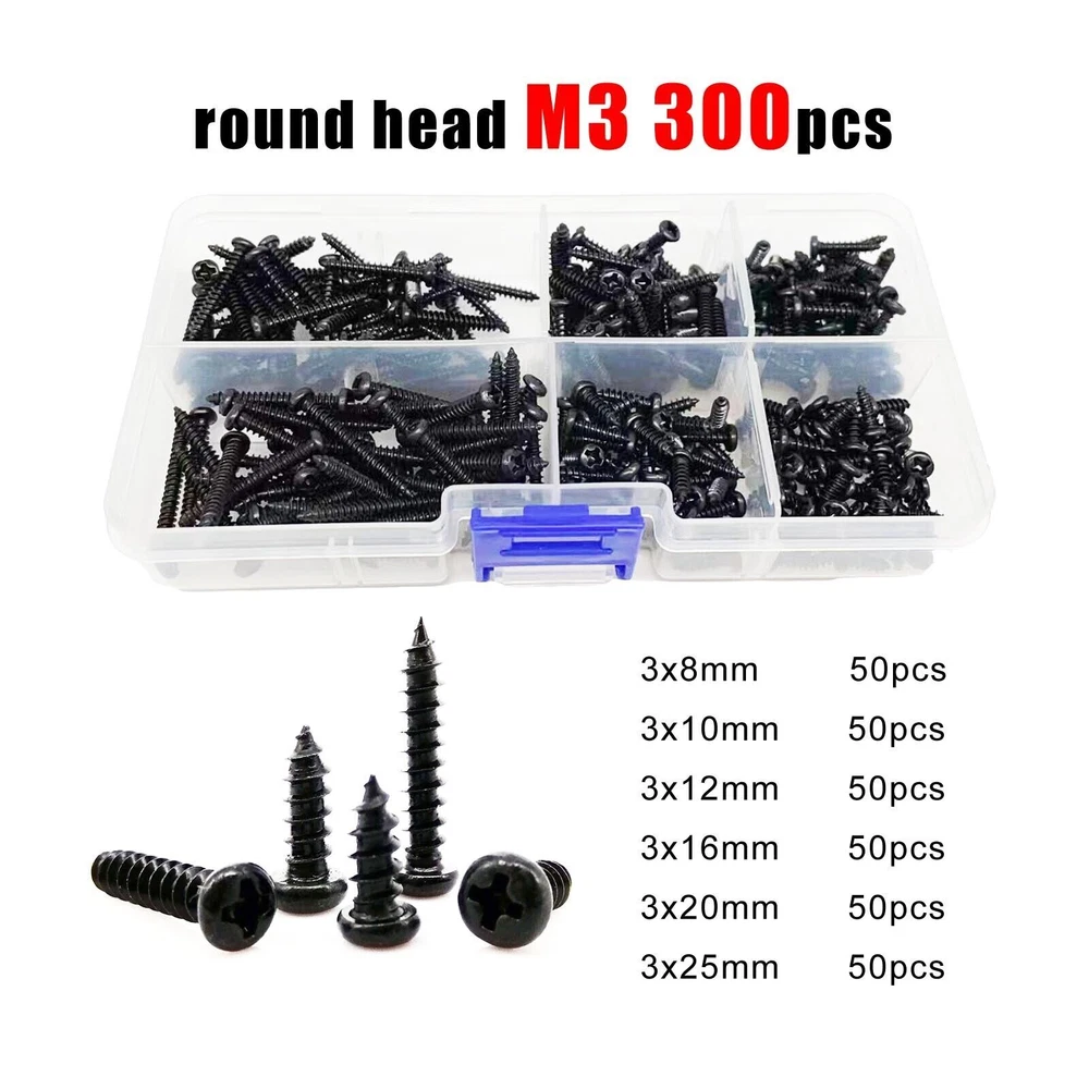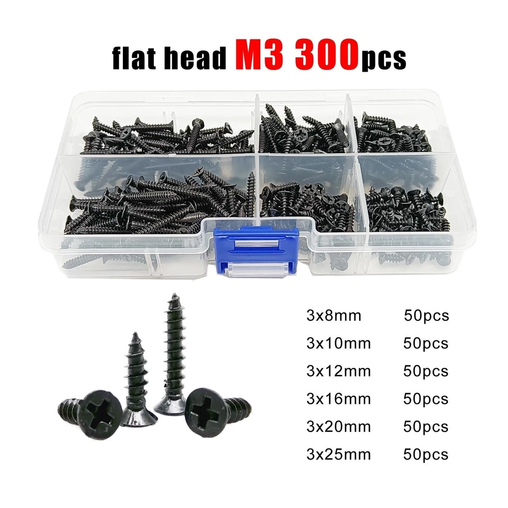 Material Black carbon steel Box include flat head M2 1100pcs 200pcs M2x4 + 200pcs M2x6 + 200pcs M2x8 + 200pcs M2x10 +150pcs M2x12 +150pcs M2x16 round head M2 1000pcs 200pcs M2x4 + 200pcs M2x6 + 150pcs M2x8 + 150pcs M2x10 +150pcs M2x12 +150pcs M2x16 flat head M2.6 500pcs 100pcs M2.6x6 + 100pcs M2.6x8 + 100pcs M2.6x10 + 100pcs M2.6x12 + 50pcs M2.6x16 + 50pcs M2.6x20 round head M2.6 500pcs 100pcs M2.6x6 + 100pcs M2.6x8 + 100pcs M2.6x10 + 100pcs M2.6x12 + 50pcs M2.6x16 + 50pcs M2.6x20 flat head M3 300pcs 50pcs M3x8 + 50pcs M3x10 + 50pcs M3x12 + 50pcs M3x16 +50pcs M3x20 + 50pcs M3x25 round head M3 300pcs 50pcs M3x8 + 50pcs M3x10 + 50pcs M3x12 + 50pcs M3x16 +25pcs M3x20 + 25pcs M3x25 On Dec 14, 2024 at 18:31:32 PST, seller added the following information: