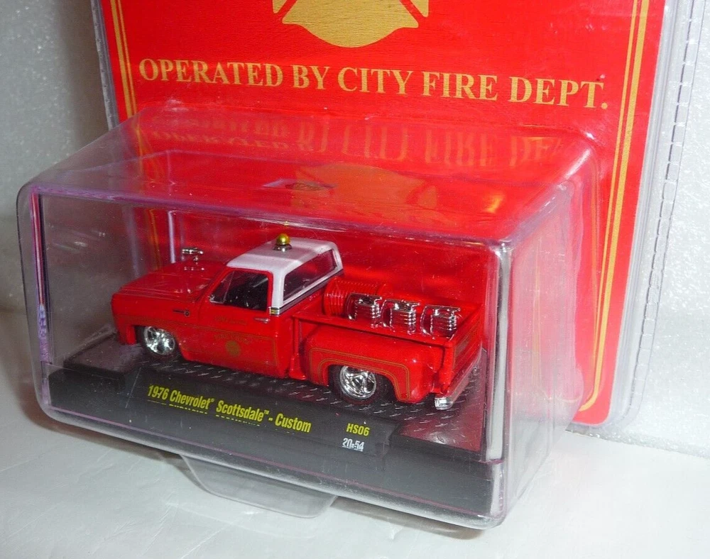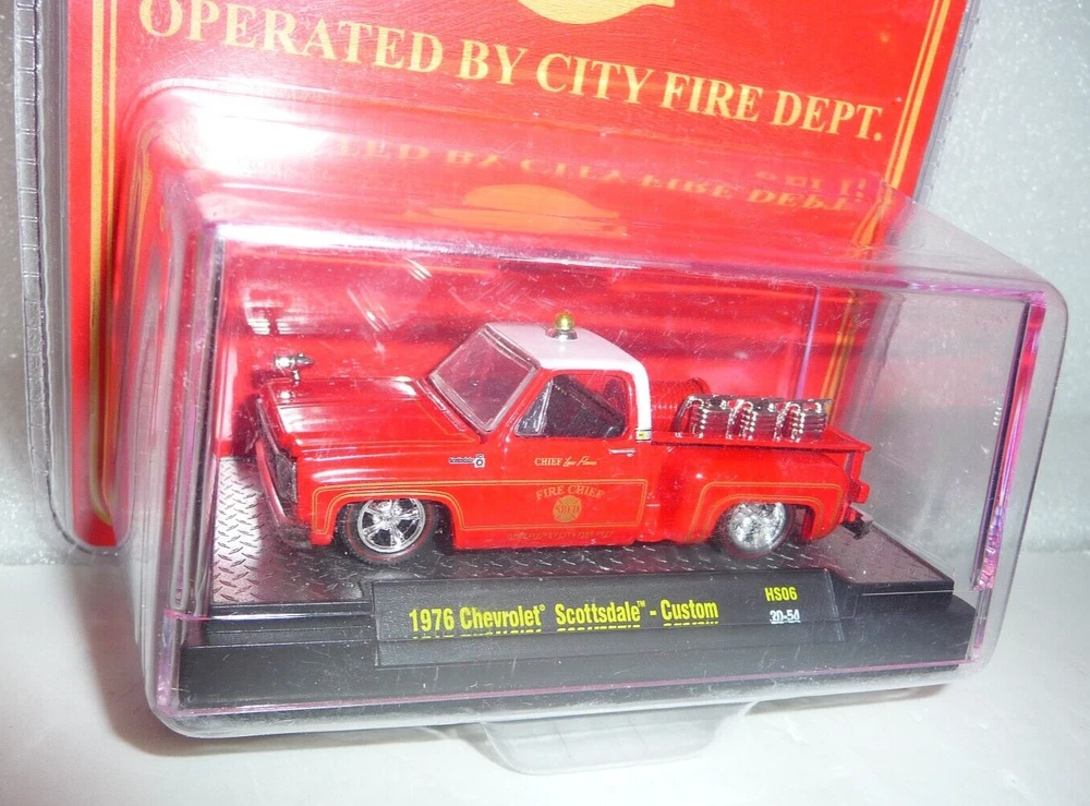 M2 Machines SBFD Chief "Low Flame" 1976 Chevrolet Scottsdale Custom 1:64 Diecast. Car is new in package. Package is a sealed plastic clamshell in new condition. Includes an acrylic display case.