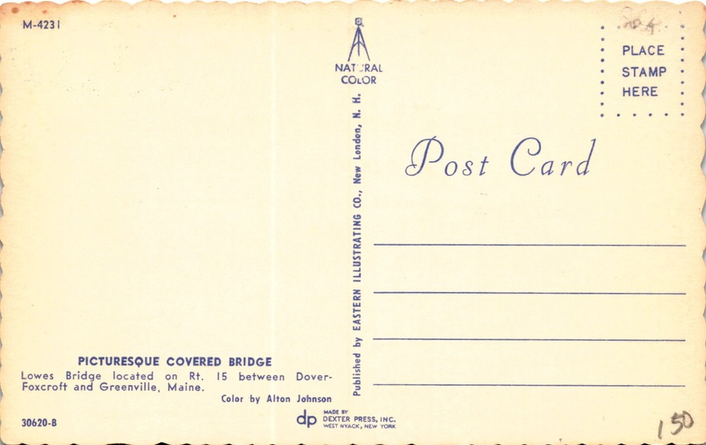 MAKE AN OFFER. THE MORE YOU BUY THE BETTER DEAL I WILL ACCEPT This postcard features a picturesque covered bridge known as Lowes Bridge located on Route 15 between Dover-Foxcroft and Greenville in Maine. The image is in natural color and was published by the Eastern Illustrating Co. based in New London, New Hampshire. The color was added by Alton Johnson, and the postcard was made by Dexter Press, Inc.