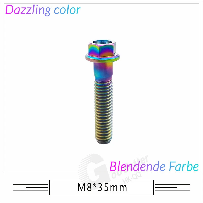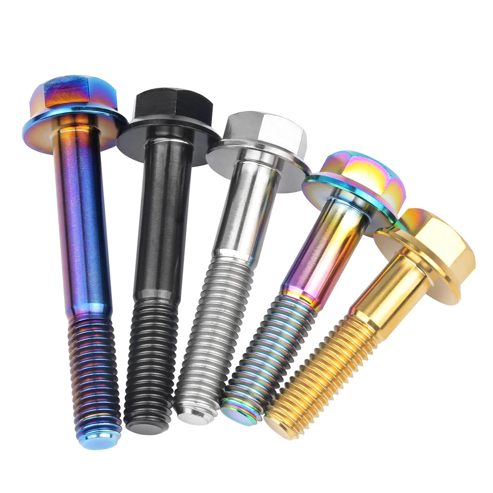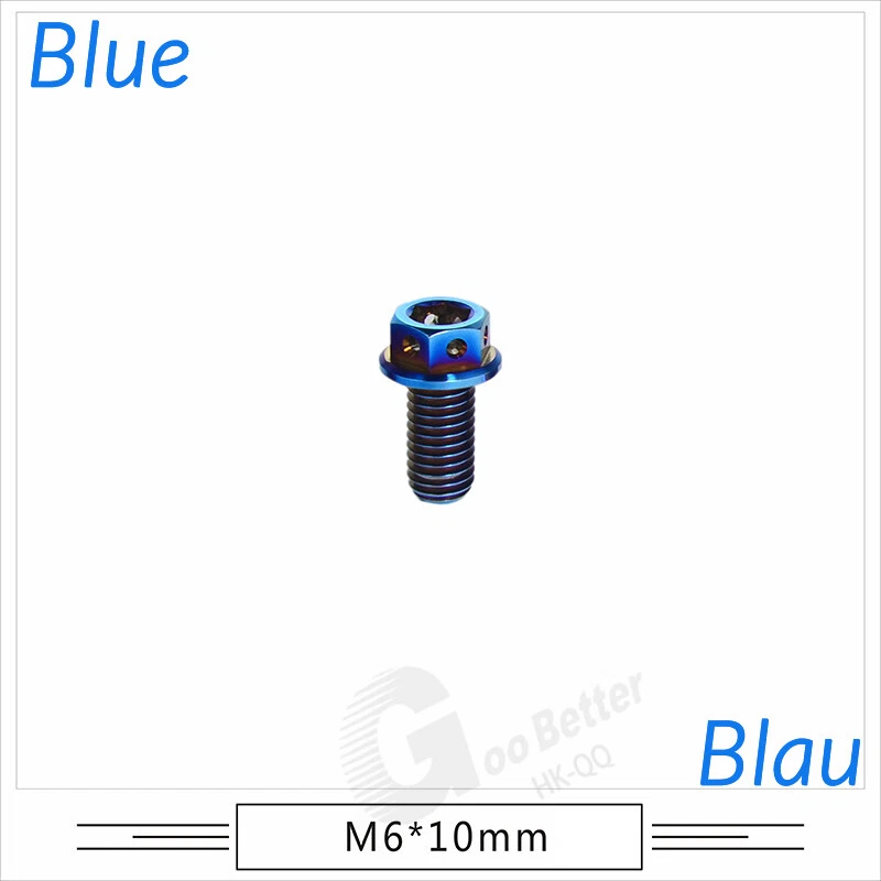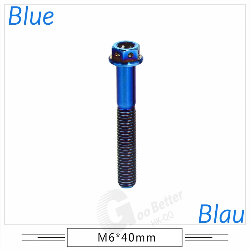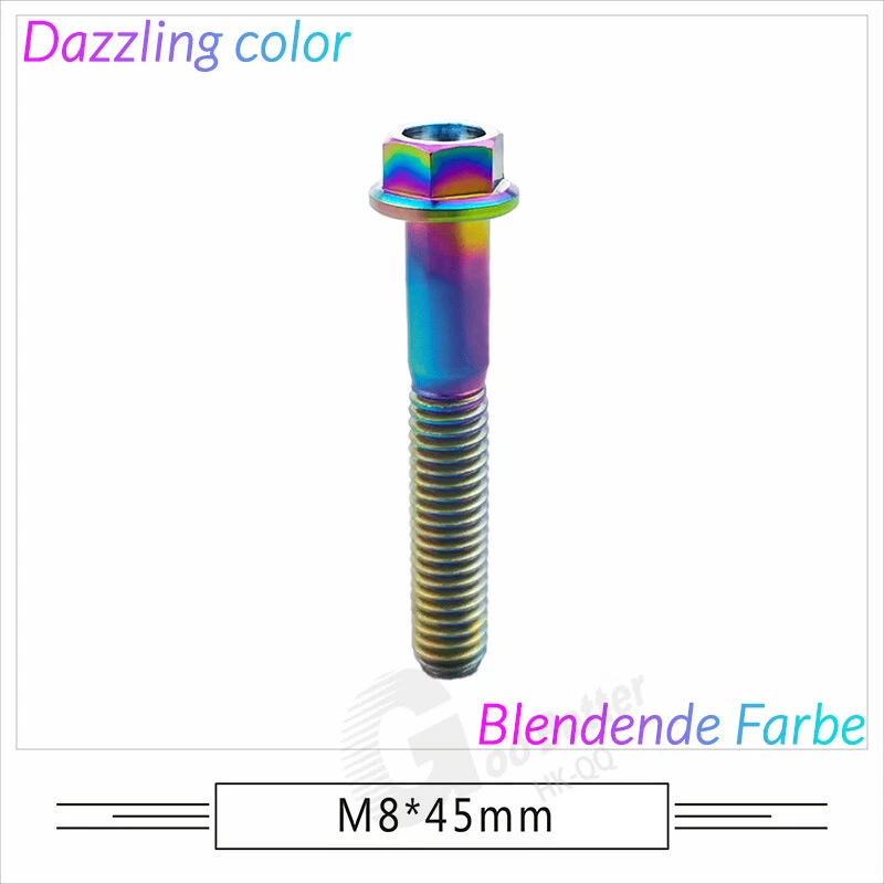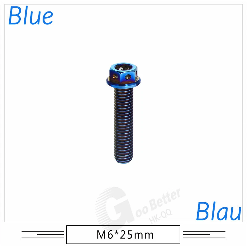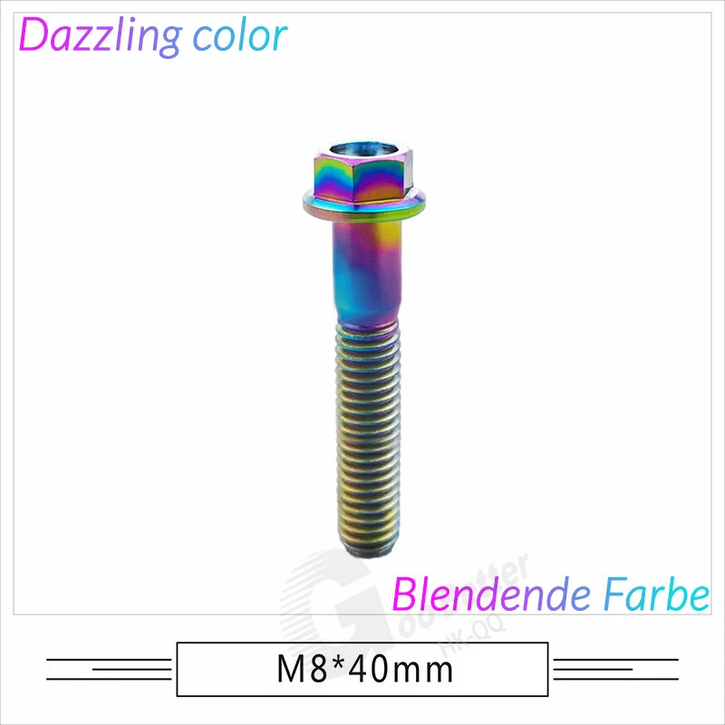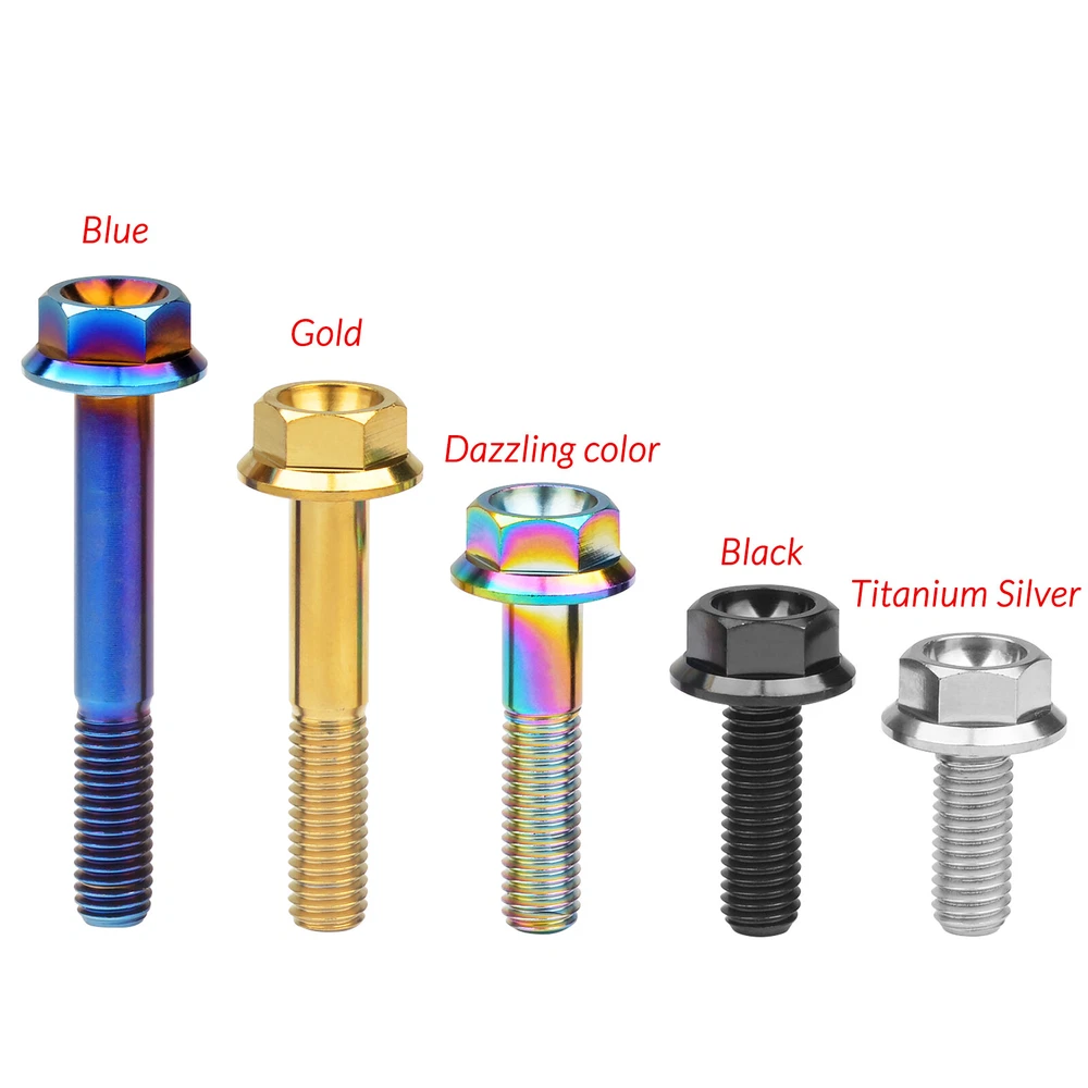 M6 M8 M10 Titanium Bolt Anodized Color Hex Flange Head 10,15,20,25,30,35,40-90mm We use high standard TC4 titanium alloy raw materials from aerospace grade titanium suppliers, rejecting inferior materials with secondary melting or no quality guarantee. Each batch of raw materials undergoes strict metal flaw detection to control quality from the source and ensure product quality to the greatest extent possible. Ultra lightweight: Titanium alloy screws are overall lightweight, with a density of only 55.7% of steel and a weight almost half that of steel! High strength: Titanium alloy screws are lightweight, but have high strength and hardness. The measured hardness is HRC34-38. While reducing weight, the strength and safety are still guaranteed. Titanium, like steel, also has an inherent flexibility, but this characteristic of titanium is more pronounced. The superior performance of this emerging material makes it a material for bicycle manufacturing. Super anti-corrosion: Its service life is longer than that of other metals. No matter in heavy rain, mud or rainstorm, a little wiping will immediately show metallic luster. Thank you for browsing our products ♥