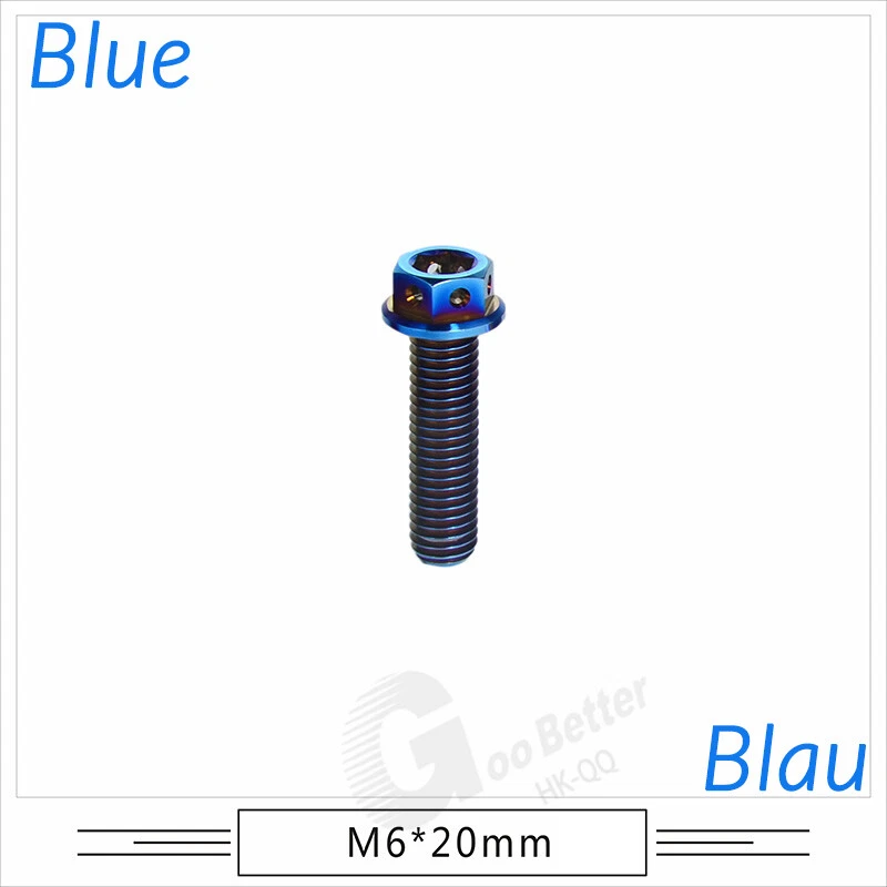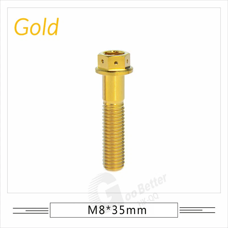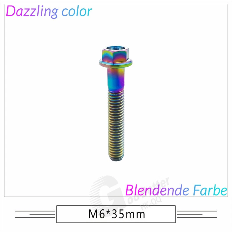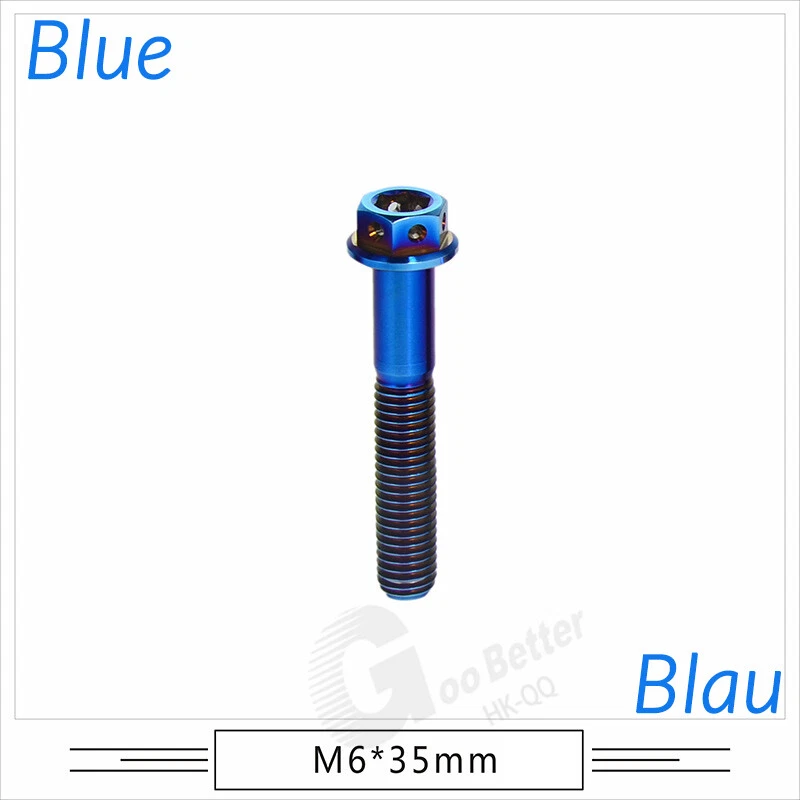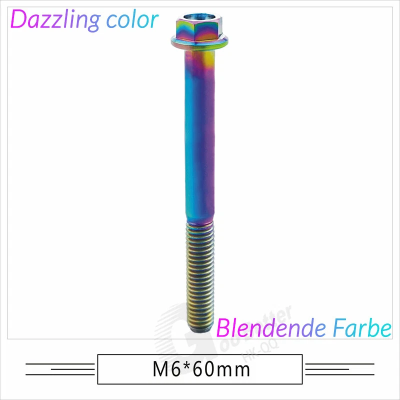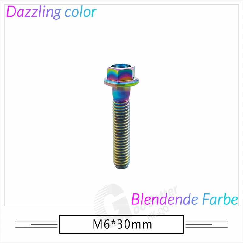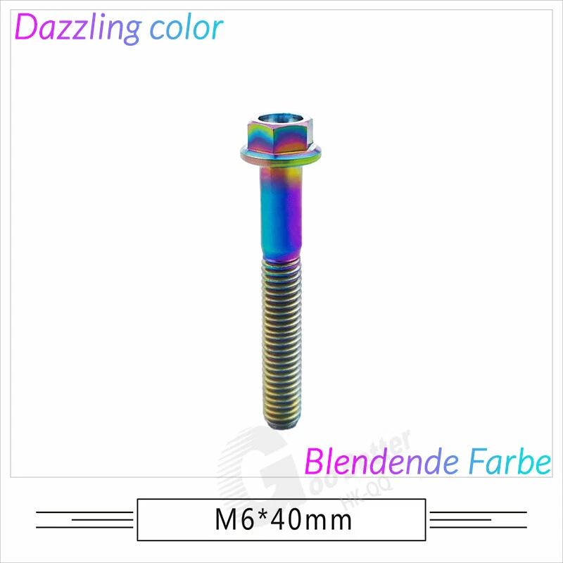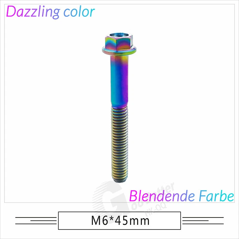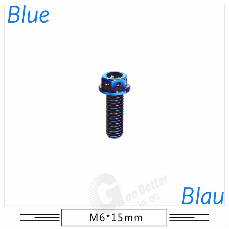 M6 M8 M10 Titanium Bolt Anodized Color Hex Flange Head 10,15,20,25,30,35,40-90mm We use high standard TC4 titanium alloy raw materials from aerospace grade titanium suppliers, rejecting inferior materials with secondary melting or no quality guarantee. Each batch of raw materials undergoes strict metal flaw detection to control quality from the source and ensure product quality to the greatest extent possible. Ultra lightweight: Titanium alloy screws are overall lightweight, with a density of only 55.7% of steel and a weight almost half that of steel! High strength: Titanium alloy screws are lightweight, but have high strength and hardness. The measured hardness is HRC34-38. While reducing weight, the strength and safety are still guaranteed. Titanium, like steel, also has an inherent flexibility, but this characteristic of titanium is more pronounced. The superior performance of this emerging material makes it a material for bicycle manufacturing. Super anti-corrosion: Its service life is longer than that of other metals. No matter in heavy rain, mud or rainstorm, a little wiping will immediately show metallic luster. Thank you for browsing our products ♥