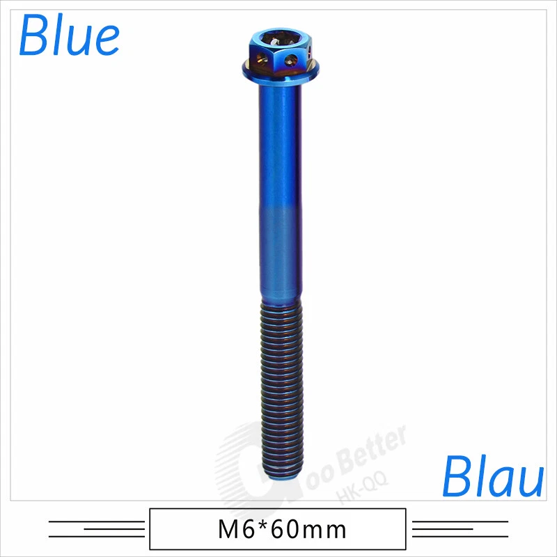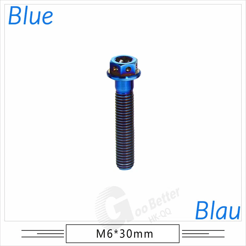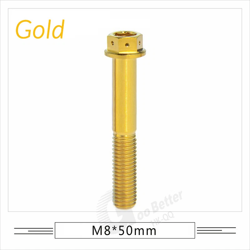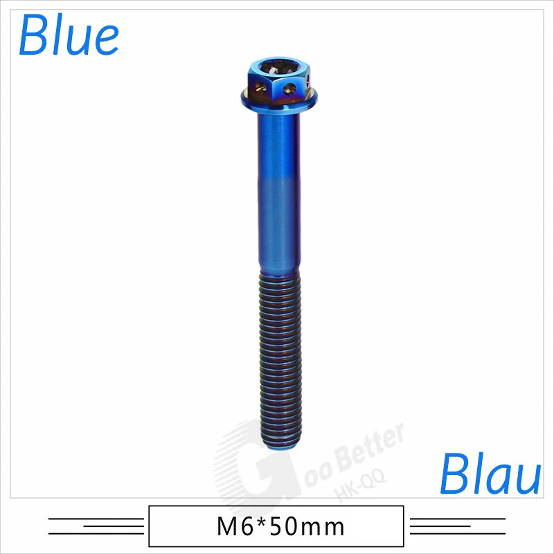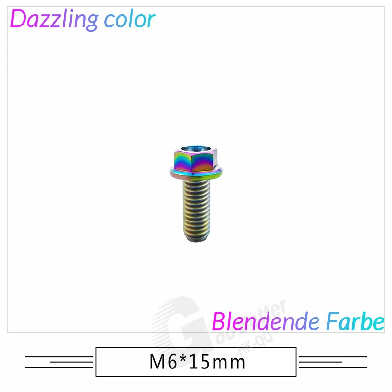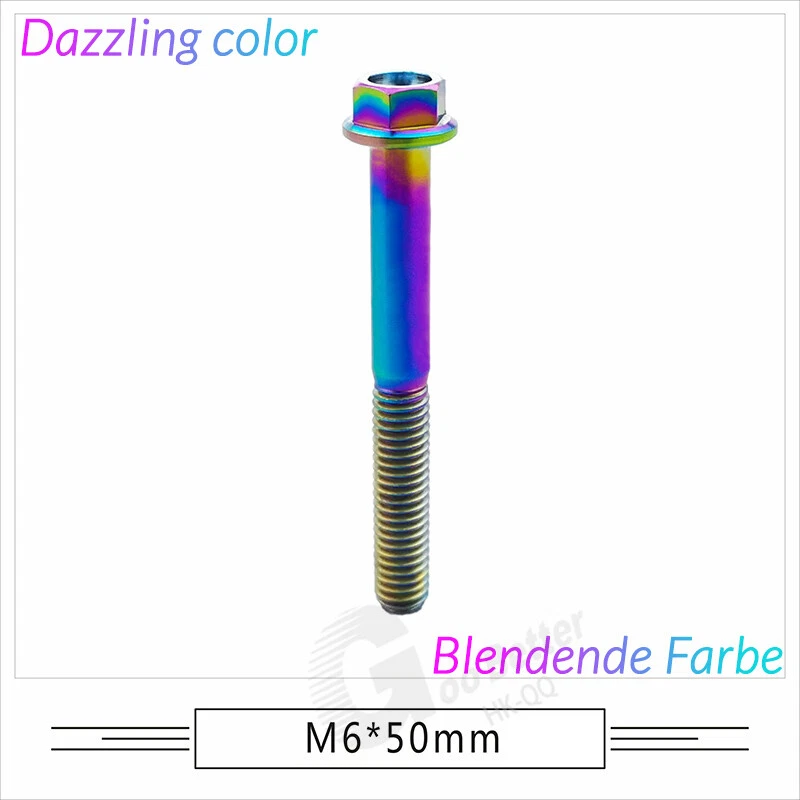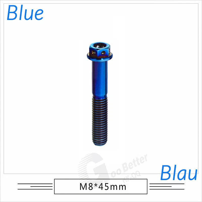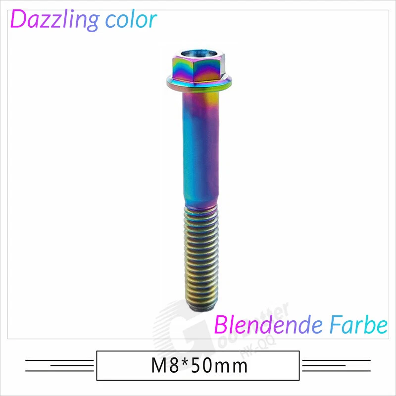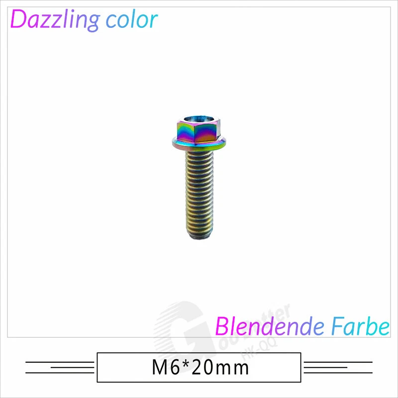 M6 M8 M10 Titanium Bolt Anodized Color Hex Flange Head 10,15,20,25,30,35,40-90mm We use high standard TC4 titanium alloy raw materials from aerospace grade titanium suppliers, rejecting inferior materials with secondary melting or no quality guarantee. Each batch of raw materials undergoes strict metal flaw detection to control quality from the source and ensure product quality to the greatest extent possible. Ultra lightweight: Titanium alloy screws are overall lightweight, with a density of only 55.7% of steel and a weight almost half that of steel! High strength: Titanium alloy screws are lightweight, but have high strength and hardness. The measured hardness is HRC34-38. While reducing weight, the strength and safety are still guaranteed. Titanium, like steel, also has an inherent flexibility, but this characteristic of titanium is more pronounced. The superior performance of this emerging material makes it a material for bicycle manufacturing. Super anti-corrosion: Its service life is longer than that of other metals. No matter in heavy rain, mud or rainstorm, a little wiping will immediately show metallic luster. Thank you for browsing our products ♥