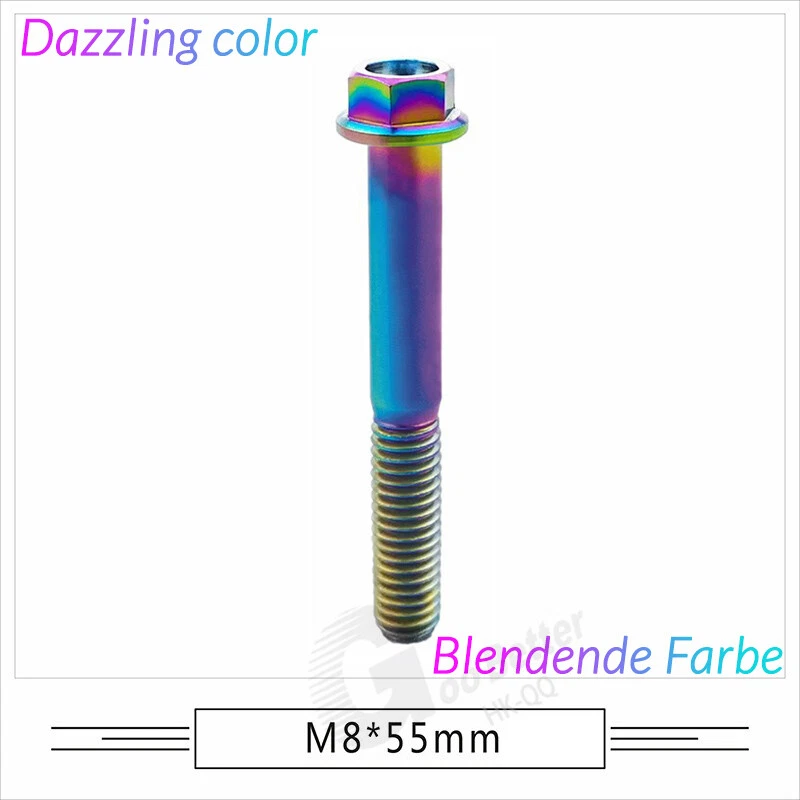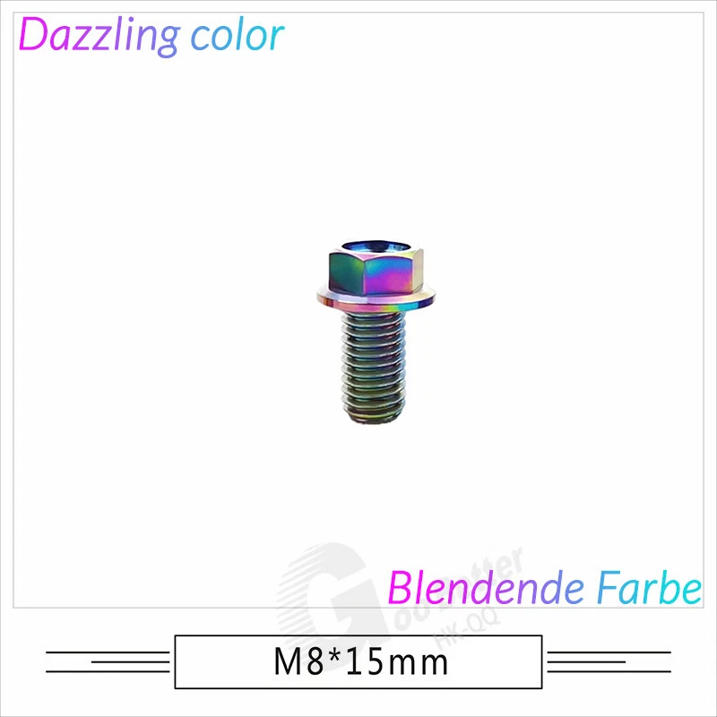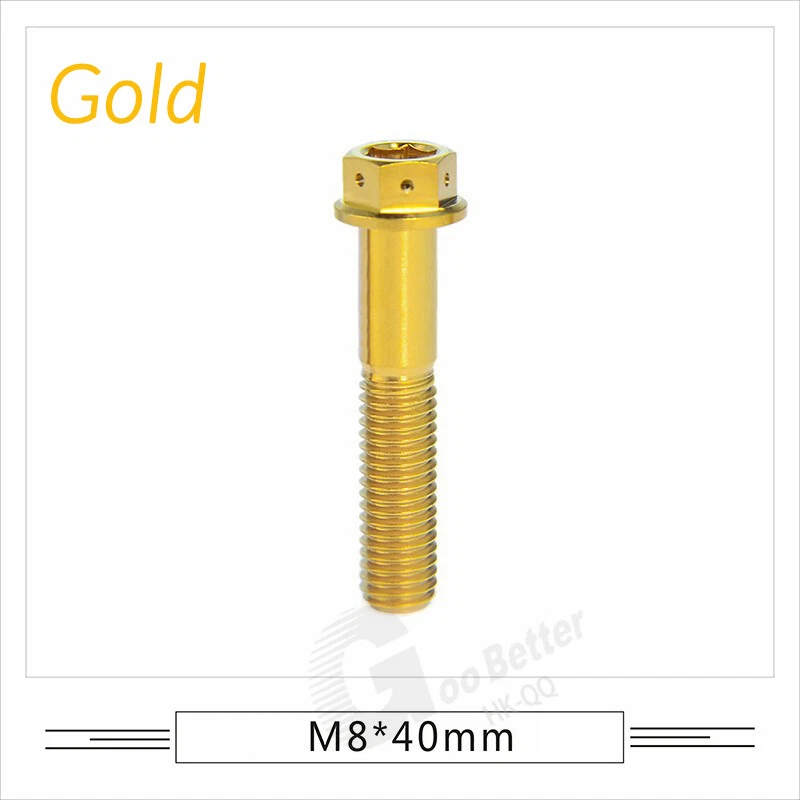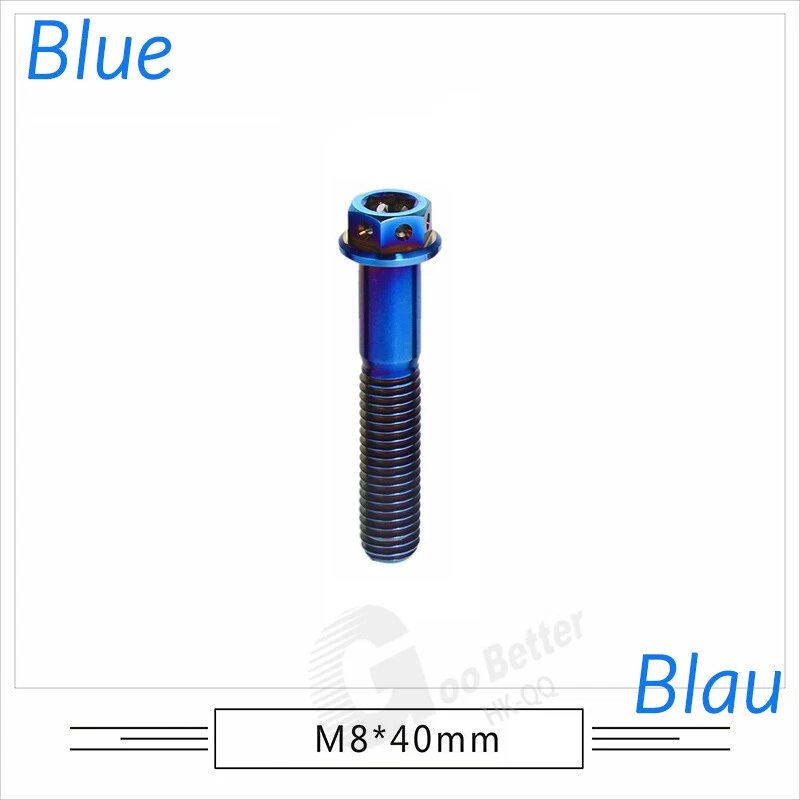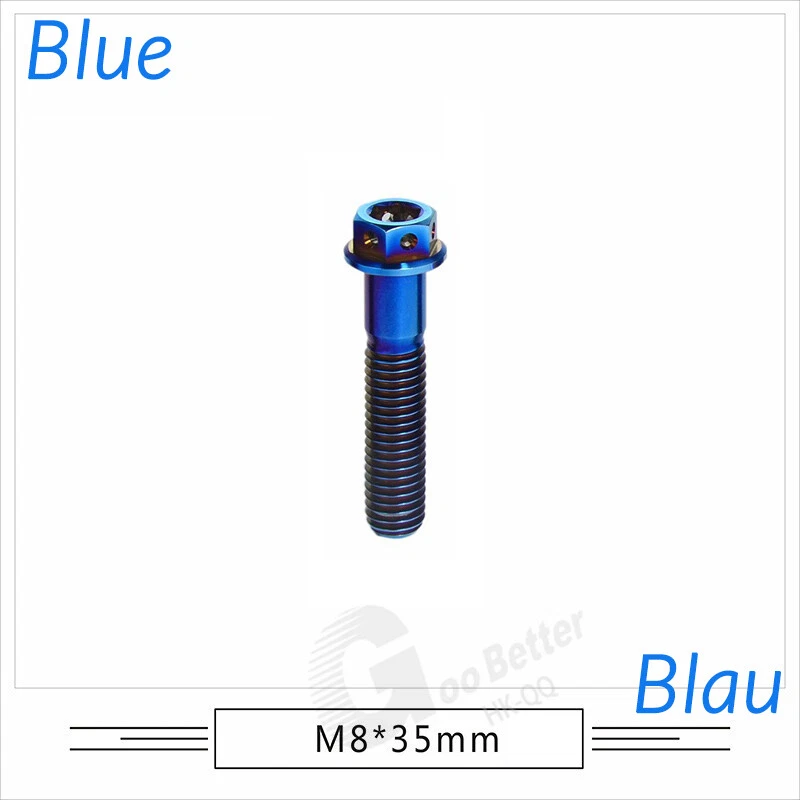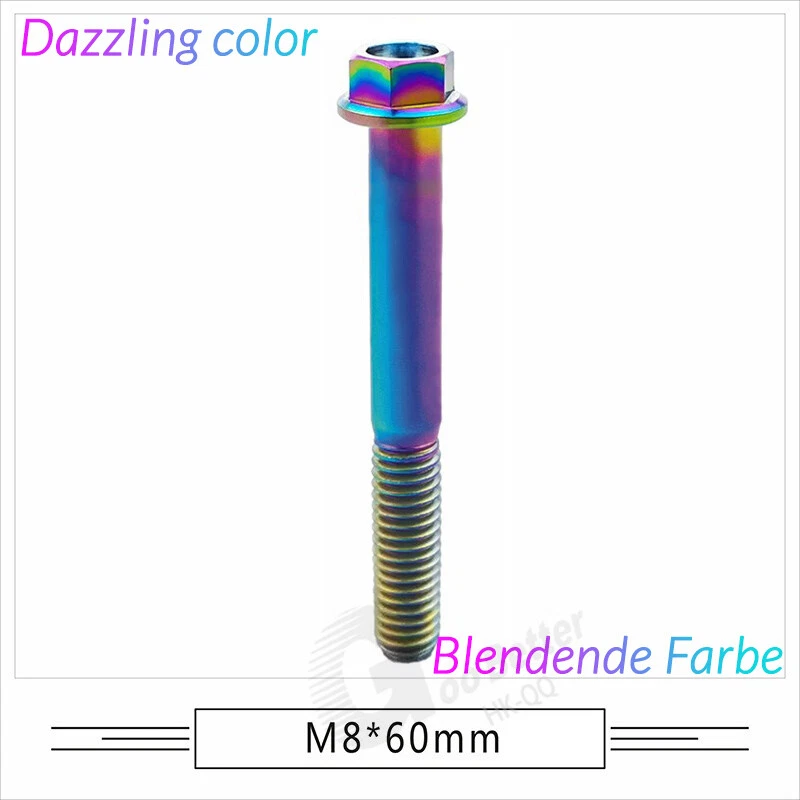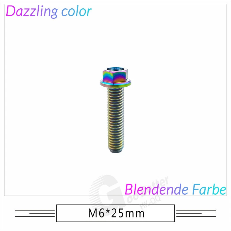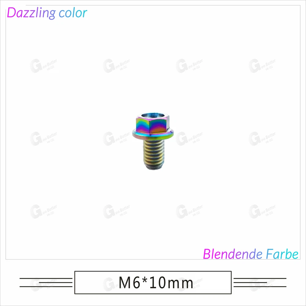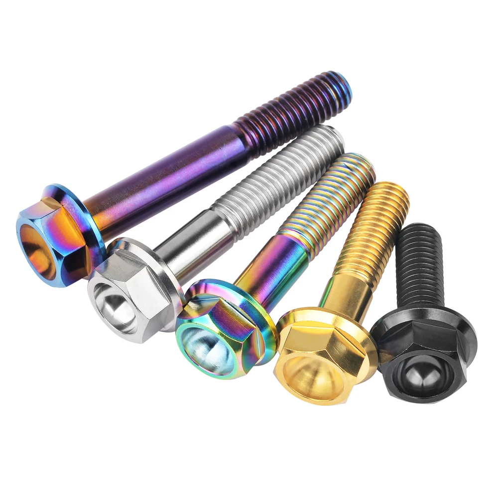 M6 M8 M10 Titanium Bolt Anodized Color Hex Flange Head 10,15,20,25,30,35,40-90mm We use high standard TC4 titanium alloy raw materials from aerospace grade titanium suppliers, rejecting inferior materials with secondary melting or no quality guarantee. Each batch of raw materials undergoes strict metal flaw detection to control quality from the source and ensure product quality to the greatest extent possible. Ultra lightweight: Titanium alloy screws are overall lightweight, with a density of only 55.7% of steel and a weight almost half that of steel! High strength: Titanium alloy screws are lightweight, but have high strength and hardness. The measured hardness is HRC34-38. While reducing weight, the strength and safety are still guaranteed. Titanium, like steel, also has an inherent flexibility, but this characteristic of titanium is more pronounced. The superior performance of this emerging material makes it a material for bicycle manufacturing. Super anti-corrosion: Its service life is longer than that of other metals. No matter in heavy rain, mud or rainstorm, a little wiping will immediately show metallic luster. Thank you for browsing our products ♥