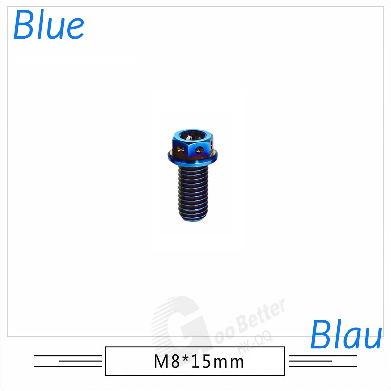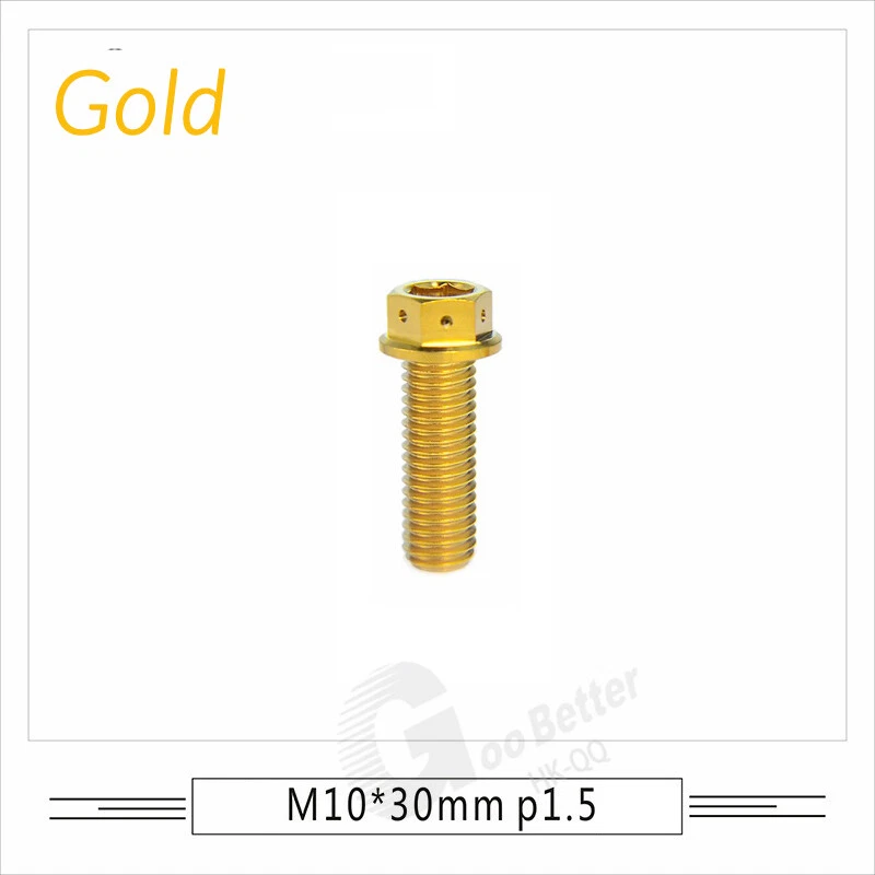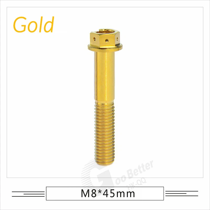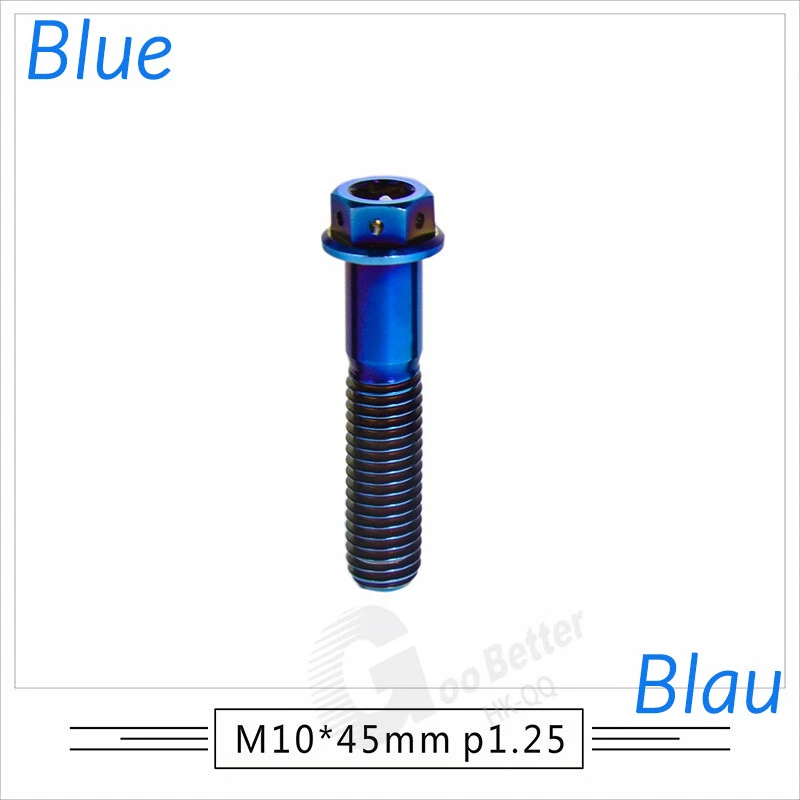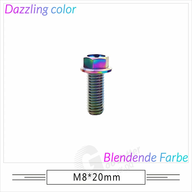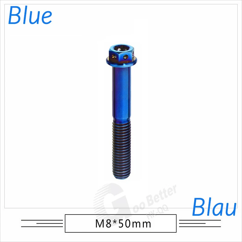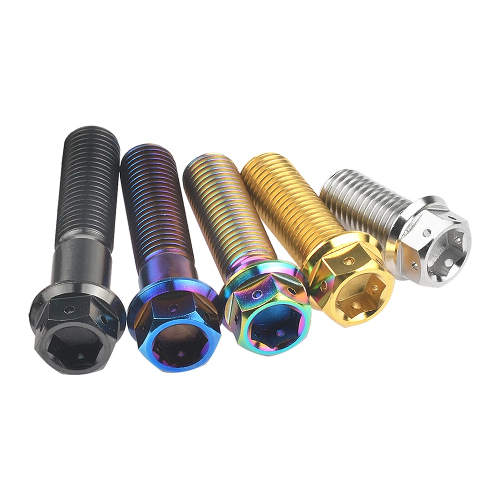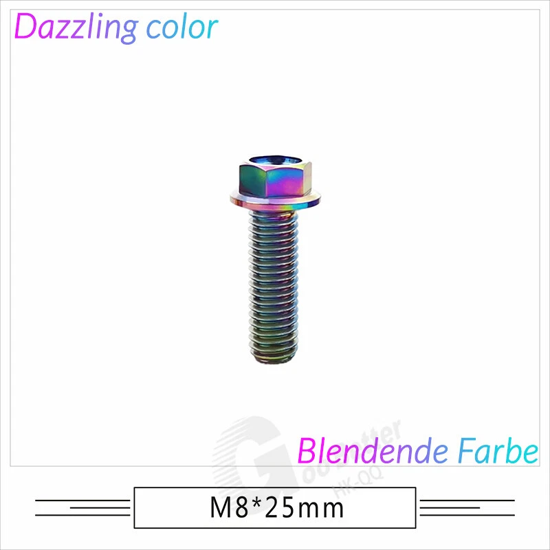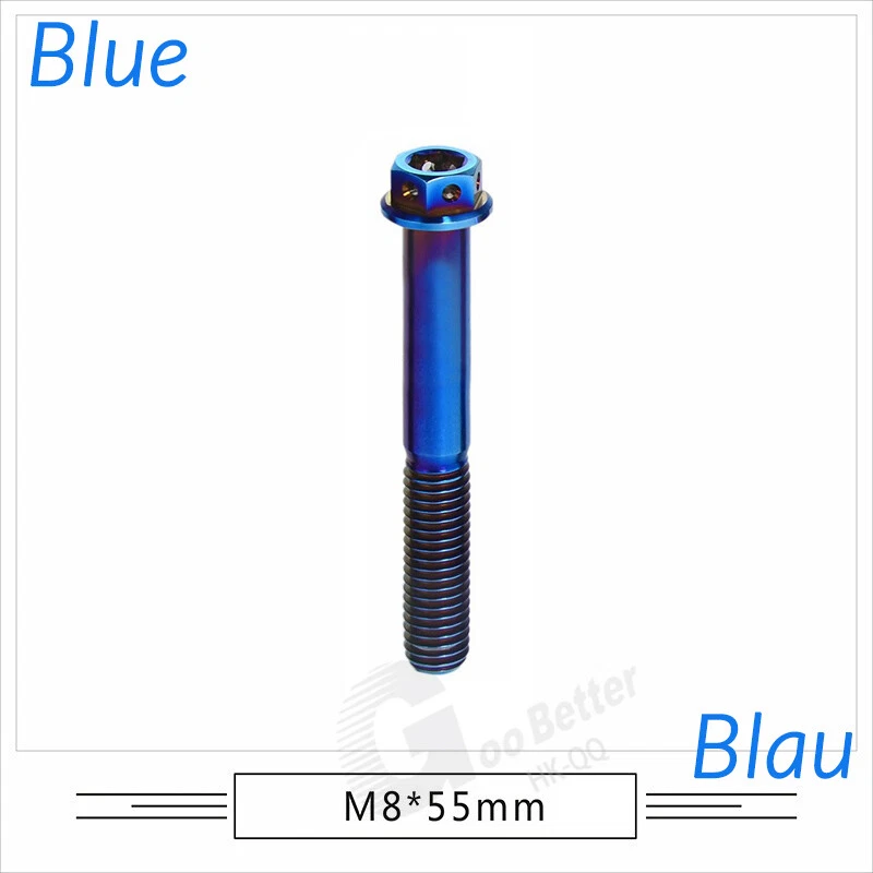 M6 M8 M10 Titanium Bolt Anodized Color Hex Flange Head 10,15,20,25,30,35,40-90mm We use high standard TC4 titanium alloy raw materials from aerospace grade titanium suppliers, rejecting inferior materials with secondary melting or no quality guarantee. Each batch of raw materials undergoes strict metal flaw detection to control quality from the source and ensure product quality to the greatest extent possible. Ultra lightweight: Titanium alloy screws are overall lightweight, with a density of only 55.7% of steel and a weight almost half that of steel! High strength: Titanium alloy screws are lightweight, but have high strength and hardness. The measured hardness is HRC34-38. While reducing weight, the strength and safety are still guaranteed. Titanium, like steel, also has an inherent flexibility, but this characteristic of titanium is more pronounced. The superior performance of this emerging material makes it a material for bicycle manufacturing. Super anti-corrosion: Its service life is longer than that of other metals. No matter in heavy rain, mud or rainstorm, a little wiping will immediately show metallic luster. Thank you for browsing our products ♥