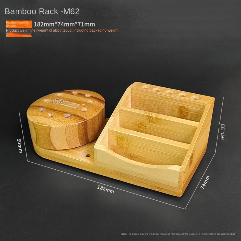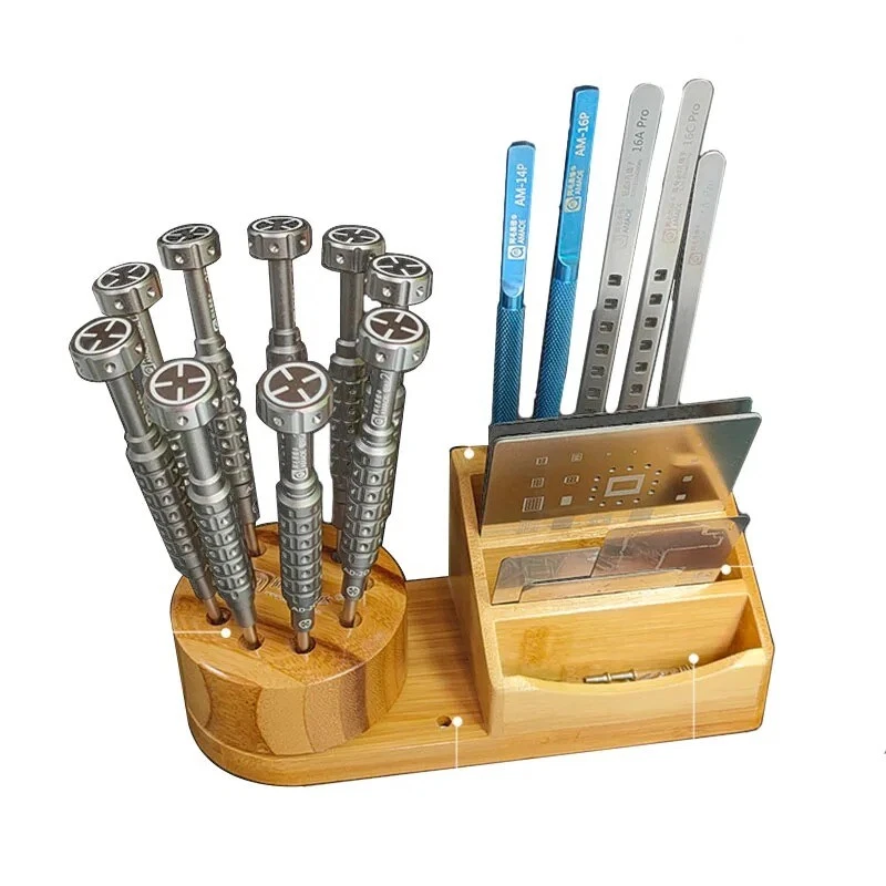 M62/Multifunction Rotating Screwdriver Holder Tweezers Steel Mesh Mobile Phone Repair Tool Storage Box Features: Made of bamboo material. Environmental protection and beautiful