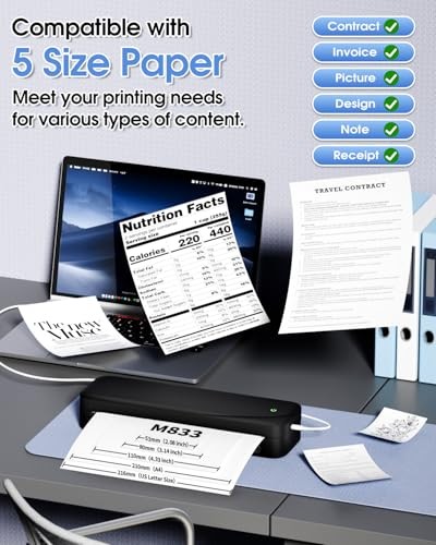 Menu 1. We require immediate payment. 2. We currently accept payment via eBay managed payments only. 3. Once payment is cleared, we will dispatch your shipment within 1-3 business days. Please refer to the "Shipping" tab for more information regarding shipping speed to your destination. M833 Portable Wireless Printer for Travel, Inkless Thermal Printer Bluetooth Support 8.5'' x 11'' US Letter & A4 Thermal Paper, for Phone & Laptop for Office, School, Home Product description M833 portable wireless printer is a compact and portable A4 thermal printer designed for versatile usage in various scenarios including business travel, sales, logistics, offices, homes, and schools. It caters to your printing needs wver you are, ensuring convenience and efficiency M833 portable printer support for Bluetooth connectivity to smartphones and tablets, as well as USB connectivity to computers. Whether you're on the go or in the office, this inkless thermal printer ensures hassle-free printing at your fingertips By employing thermal printing technology, M833 inkless portable printer eliminates the need for ink cartridges or ribbons, ensuring both green and cost-effectiveness. Say goodbye to the hassles and expenses associated with traditional printing methods With a large battery capacity, M833 mobile printer provides extended battery life on a single charge, ensuring prolonged usage even in the absence of power outlets. Say goodbye to interruptions as you enjoy uninterrupted printing wver you are Featuring a high-resolution printing capability of 300 dpi, M833 travel printer s crisp and vibrant print outputs. It also offers support for multiple consumable sizes such as 2 inch, 3 inch, 4 inch, A4 and US Letter, ensuring compatibility with various printing requirements PLEASE MESSAGE US IF YOU HAVE ANY OTHER QUESTIONS, AND MANY THANKS FOR READING ALL OF THIS. Copyright ©#. All Rights Reserved.