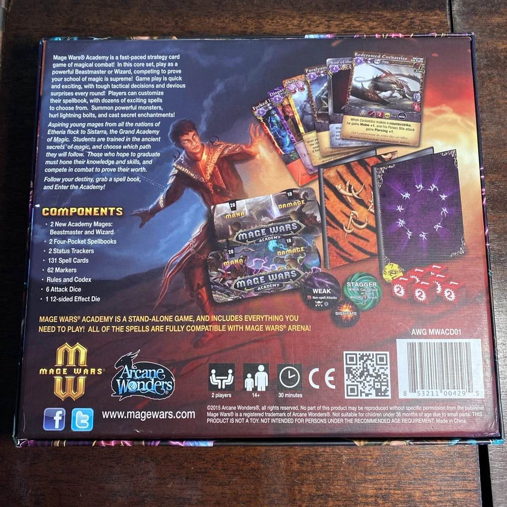 Min. Number of Players:2 playersTheme:FantasyType:Complete Gamegtin13:853211004295Game:Mage Wars AcademyTitle:Mage Wars ArenaAge Level:12-16 Years, 17 Years & UpFeatures:CORE SETGame Type:Board GameUPC:853211004295Custom Bundle:NoModified Item:NoGender:AnyVintage (Yes/No):NoRecommended Age Range:14+Year:2015Game Title:Mage WarsCountry/Region of Manufacture:ChinaAward:seal of excellence the dice towerMPN:AWG MWACD01Brand:Arcane WondersCharacter Family:Wizards