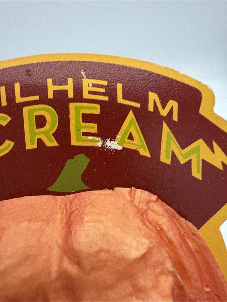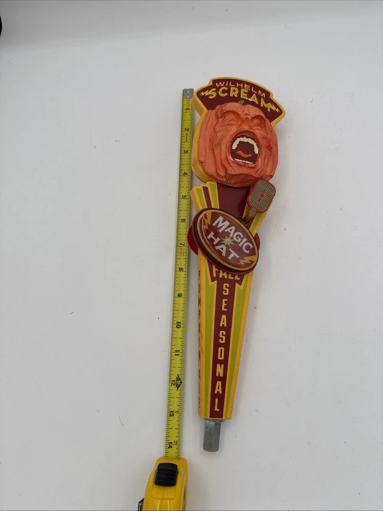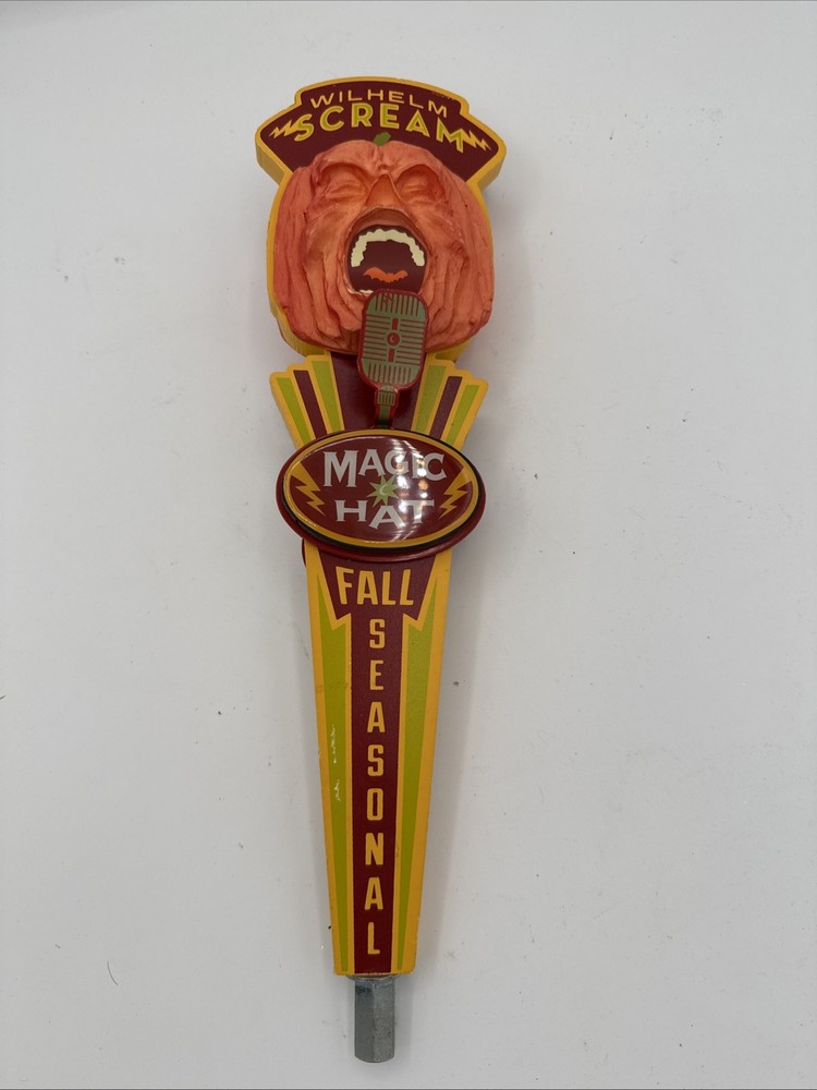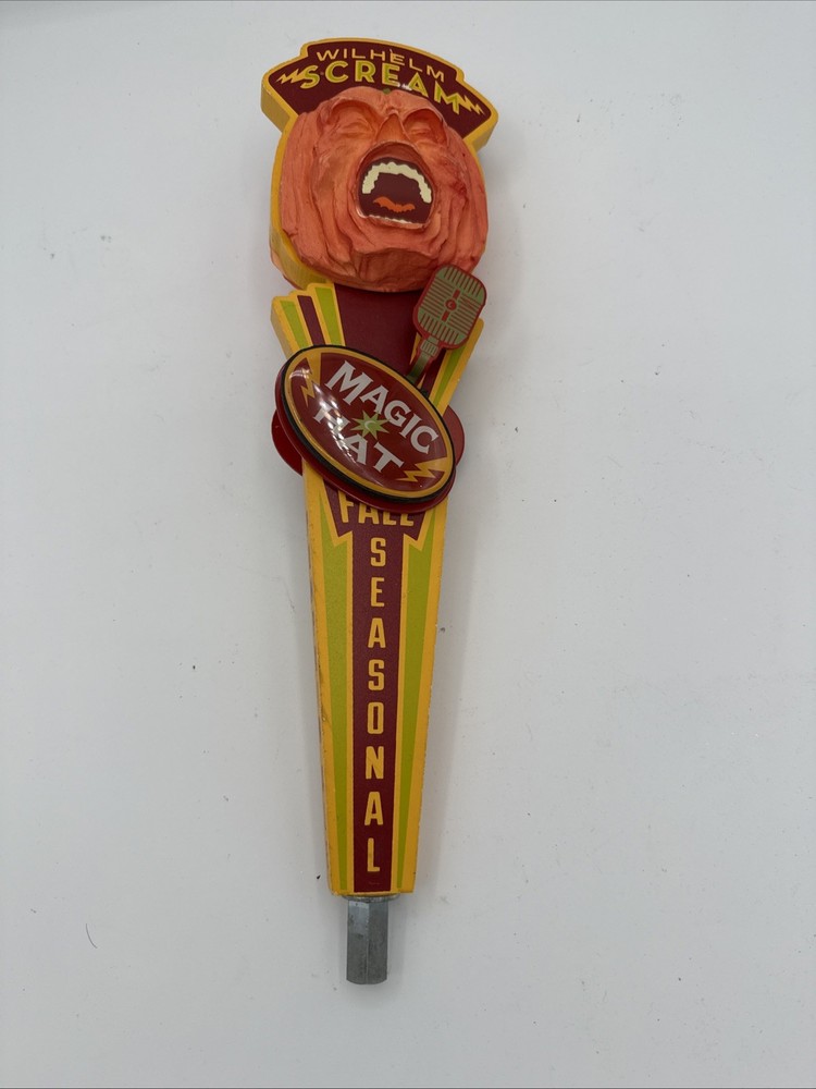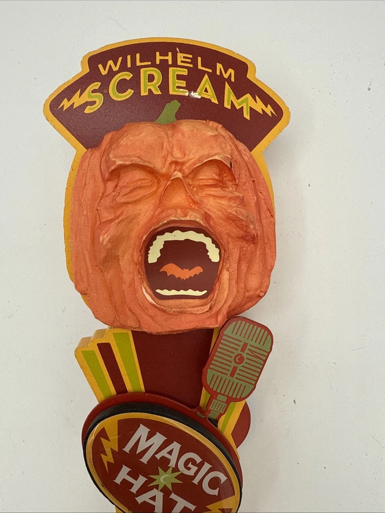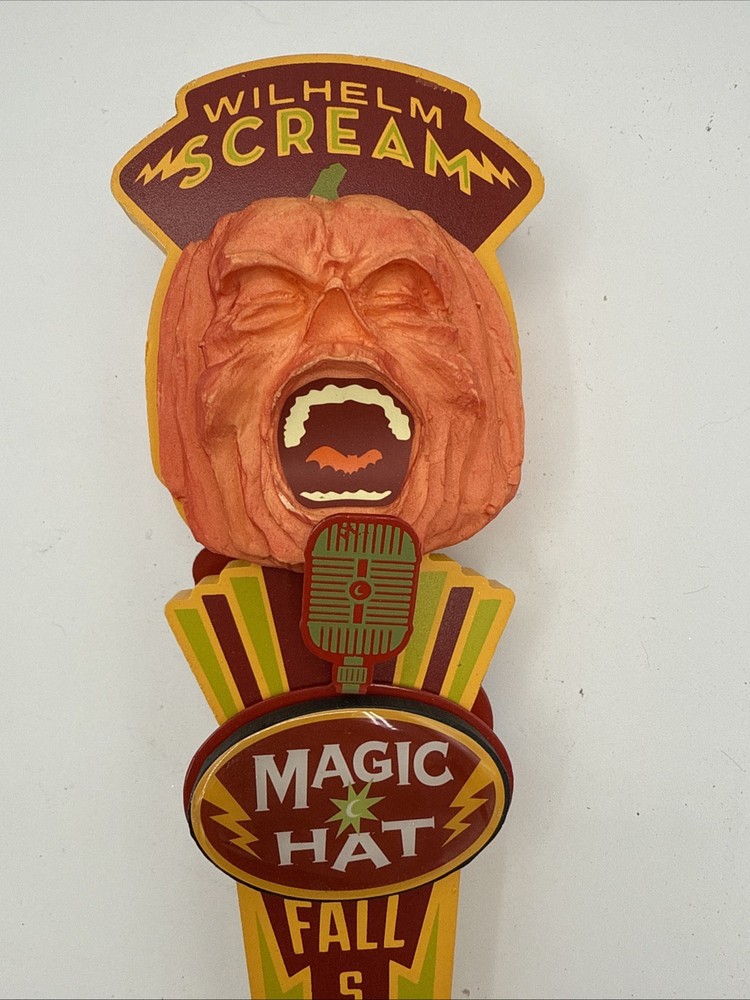 The product is a Magic Hat Wilhelm Scream Pumpkin Ale fall seasonal draft beer tap pull, featuring a unique design inspired by the iconic Wilhelm Scream. This collectible tap handle knob is a great addition for beer enthusiasts or collectors of breweriana items. With its Vermont origin, it adds a touch of regional flair to any beer tap collection, making it a fun and seasonal decor piece for fall festivities.