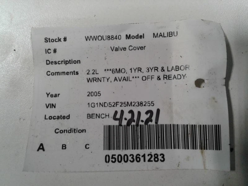 Powered by Frooition All Items See our eBay store for more great items >> Shop Categories ABS Anti-Lock Brake Part Other Aftermarket Stereos Air Bags Amplifiers Anti-Lock Brake Part Automobiles Stereos A/V Equipment CD Changers Center Caps + Wheel Covers Chassis Brain Box Coil Packs Computer + Control Modules Distributors Door Mirrors Door Panels DVD Equipment Engines Front Lamps Grilles Headlamp & Front Lamps Heat A/C Control Heater Motor/Blower Starters Interior Switches Interior Switch / Controls Keyless Entry FOB Owners Manual's Speedometers Tail Lights Transmission Wheels + Tires Alternators Fuel Pumps Window Regulators & Controls Steering Pumps Wiper Motors Compressors INFO/GPS/TV SCREENS Radiator Windshield Washer Bottles Condenser Shifters Windows & Sunroof Turbo Superchargers Glass Doors Air Cleaner Box Spindles Drive Shafts MALIBU 2005 Valve Cover 1393592 Item Description This listing is for the item pictured. It is ready to ship and comes with a 90 day warranty! eBay compatibility may be incorrect. See below for fitment information and any notes pertaining to this specific part. Feel free to contact us if you have any questions. Thanks for looking! Donor Vehicle: Year: 2005 Model: MALIBU Stock #: OU8840 Mileage: 109000 Notes: 2.2L 6MO, 1YR, 3YR LABOR WRNT This part will only fit: For more parts from this vehicle, CLICK HERE . About Us About Us Payment Shipping Terms Returns About Us We are a family-owned business with over 30 years in the used car parts industry. We're proud to provide excellent quality used auto parts at famously discounted prices! Over time we have grown to 4 locations in Harrison, MI, Lansing, MI, Saint Johns, MI, and Toledo, OH. We are here to serve you Monday thru Friday 8 a.m. to 5 p.m. EST. If you have any concerns or questions, please feel free to message us here on eBay. We will normally get back to you within 12 hours during the work week. Payment Payment We accept Paypal, all major credit cards and cash (if you are picking up the item). Payment is required within 2 days of winning a listing. If payment is not made after 2 days, an unpaid item case will be opened. Shipping Shipping Most items will ship ground with UPS or USPS. We may use other carriers at our discretion. In some instances, freight orders will require a business address with a loading dock or forklift. A good working phone number is required for all orders. Local pickup is also an option on any order. Our 4 locations are open Monday thru Friday from 8 a.m. to 5 p.m. EST. Please check with us before driving out to make sure we have the part ready at the location nearest to you. Terms Terms Most items include a 90-day warranty (unless otherwise indicated). This coverage is included on all new or used parts unless otherwise stated in the listing or on the front of the invoice. This warranty is non-transferable. Labor is not covered under any circumstance unless a separate labor warranty is purchased. Extended warranties are also available. Please see our website for complete details and exclusions. Returns Returns We allow 60 days for returns. If you ordered the incorrect part or simply do not need it, you are responsible for the origin and return shipping. Helpful Links Add to Favorite Sellers Sign up to Newsletter View Feedback Contact Seller Visit seller's eBay Shop About Seller Page More Items! View more great items Driver Side View Mirror Power Manual Fold Body Color Cap Fits 09-10 EDGE 1809688 $99.99 Driver Left Tail Light Fits 13-17 XV CROSSTREK 1793942 $119.99 Driver Tail Light Sedan Outer Quarter Panel Mounted Fits 15-18 FOCUS 1814998 $119.99 Engine Gasoline 2.0L Without Turbo VIN 2 8th Digit Fits 12-14 FOCUS 1799582 $694.99 Powered by Frooition Frooition | No-js Template | eBay design, eBay store design, eBay shop design, eBay template design, eBay listing design (ver:froo_no_js) This listing is currently undergoing maintenance, we apologise for any inconvenience caused.