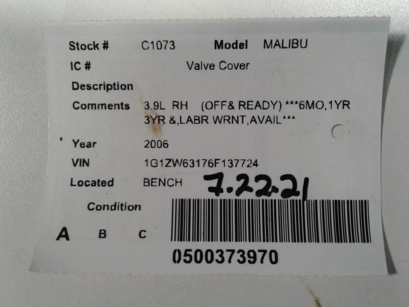 Powered by Frooition All Items See our eBay store for more great items >> Shop Categories ABS Anti-Lock Brake Part Other Aftermarket Stereos Air Bags Amplifiers Anti-Lock Brake Part Automobiles Stereos A/V Equipment CD Changers Center Caps + Wheel Covers Chassis Brain Box Coil Packs Computer + Control Modules Distributors Door Mirrors Door Panels DVD Equipment Engines Front Lamps Grilles Headlamp & Front Lamps Heat A/C Control Heater Motor/Blower Starters Interior Switches Interior Switch / Controls Keyless Entry FOB Owners Manual's Speedometers Tail Lights Transmission Wheels + Tires Alternators Fuel Pumps Window Regulators & Controls Steering Pumps Wiper Motors Compressors INFO/GPS/TV SCREENS Radiator Windshield Washer Bottles Condenser Shifters Windows & Sunroof Turbo Superchargers Glass Doors Air Cleaner Box Spindles Drive Shafts MALIBU 2006 Valve Cover 1435604 Item Description This listing is for the item pictured. It is ready to ship and comes with a 90 day warranty! eBay compatibility may be incorrect. See below for fitment information and any notes pertaining to this specific part. Feel free to contact us if you have any questions. Thanks for looking! Donor Vehicle: Year: 2006 Model: MALIBU Stock #: C1073 Mileage: 130000 Notes: 3.9L RH OFF READY 6MO,1YR This part will only fit: For more parts from this vehicle, CLICK HERE . About Us About Us Payment Shipping Terms Returns About Us We are a family-owned business with over 30 years in the used car parts industry. We're proud to provide excellent quality used auto parts at famously discounted prices! Over time we have grown to 4 locations in Harrison, MI, Lansing, MI, Saint Johns, MI, and Toledo, OH. We are here to serve you Monday thru Friday 8 a.m. to 5 p.m. EST. If you have any concerns or questions, please feel free to message us here on eBay. We will normally get back to you within 12 hours during the work week. Payment Payment We accept Paypal, all major credit cards and cash (if you are picking up the item). Payment is required within 2 days of winning a listing. If payment is not made after 2 days, an unpaid item case will be opened. Shipping Shipping Most items will ship ground with UPS or USPS. We may use other carriers at our discretion. In some instances, freight orders will require a business address with a loading dock or forklift. A good working phone number is required for all orders. Local pickup is also an option on any order. Our 4 locations are open Monday thru Friday from 8 a.m. to 5 p.m. EST. Please check with us before driving out to make sure we have the part ready at the location nearest to you. Terms Terms Most items include a 90-day warranty (unless otherwise indicated). This coverage is included on all new or used parts unless otherwise stated in the listing or on the front of the invoice. This warranty is non-transferable. Labor is not covered under any circumstance unless a separate labor warranty is purchased. Extended warranties are also available. Please see our website for complete details and exclusions. Returns Returns We allow 60 days for returns. If you ordered the incorrect part or simply do not need it, you are responsible for the origin and return shipping. Helpful Links Add to Favorite Sellers Sign up to Newsletter View Feedback Contact Seller Visit seller's eBay Shop About Seller Page More Items! View more great items Driver Side View Mirror Power Manual Fold Body Color Cap Fits 09-10 EDGE 1809688 $99.99 Driver Left Tail Light Fits 13-17 XV CROSSTREK 1793942 $119.99 Driver Tail Light Sedan Outer Quarter Panel Mounted Fits 15-18 FOCUS 1814998 $119.99 Engine Gasoline 2.0L Without Turbo VIN 2 8th Digit Fits 12-14 FOCUS 1799582 $694.99 Powered by Frooition Frooition | No-js Template | eBay design, eBay store design, eBay shop design, eBay template design, eBay listing design (ver:froo_no_js) This listing is currently undergoing maintenance, we apologise for any inconvenience caused.
