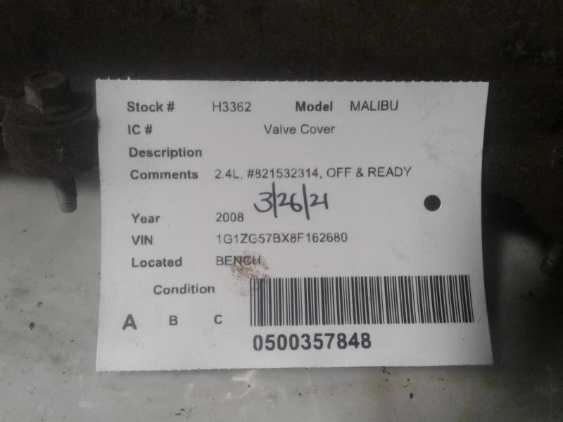 Powered by Frooition All Items See our eBay store for more great items >> Shop Categories ABS Anti-Lock Brake Part Other Aftermarket Stereos Air Bags Amplifiers Anti-Lock Brake Part Automobiles Stereos A/V Equipment CD Changers Center Caps + Wheel Covers Chassis Brain Box Coil Packs Computer + Control Modules Distributors Door Mirrors Door Panels DVD Equipment Engines Front Lamps Grilles Headlamp & Front Lamps Heat A/C Control Heater Motor/Blower Starters Interior Switches Interior Switch / Controls Keyless Entry FOB Owners Manual's Speedometers Tail Lights Transmission Wheels + Tires Alternators Fuel Pumps Window Regulators & Controls Steering Pumps Wiper Motors Compressors INFO/GPS/TV SCREENS Radiator Windshield Washer Bottles Condenser Shifters Windows & Sunroof Turbo Superchargers Glass Doors Air Cleaner Box Spindles Drive Shafts MALIBU 2008 Valve Cover 1380736 Item Description This listing is for the item pictured. It is ready to ship and comes with a 90 day warranty! eBay compatibility may be incorrect. See below for fitment information and any notes pertaining to this specific part. Feel free to contact us if you have any questions. Thanks for looking! Donor Vehicle: Year: 2008 Model: MALIBU Stock #: H3362 Mileage: 122000 Notes: 2.4L, 821532314, OFF READY This part will only fit: For more parts from this vehicle, CLICK HERE . About Us About Us Payment Shipping Terms Returns About Us We are a family-owned business with over 30 years in the used car parts industry. We're proud to provide excellent quality used auto parts at famously discounted prices! Over time we have grown to 4 locations in Harrison, MI, Lansing, MI, Saint Johns, MI, and Toledo, OH. We are here to serve you Monday thru Friday 8 a.m. to 5 p.m. EST. If you have any concerns or questions, please feel free to message us here on eBay. We will normally get back to you within 12 hours during the work week. Payment Payment We accept Paypal, all major credit cards and cash (if you are picking up the item). Payment is required within 2 days of winning a listing. If payment is not made after 2 days, an unpaid item case will be opened. Shipping Shipping Most items will ship ground with UPS or USPS. We may use other carriers at our discretion. In some instances, freight orders will require a business address with a loading dock or forklift. A good working phone number is required for all orders. Local pickup is also an option on any order. Our 4 locations are open Monday thru Friday from 8 a.m. to 5 p.m. EST. Please check with us before driving out to make sure we have the part ready at the location nearest to you. Terms Terms Most items include a 90-day warranty (unless otherwise indicated). This coverage is included on all new or used parts unless otherwise stated in the listing or on the front of the invoice. This warranty is non-transferable. Labor is not covered under any circumstance unless a separate labor warranty is purchased. Extended warranties are also available. Please see our website for complete details and exclusions. Returns Returns We allow 60 days for returns. If you ordered the incorrect part or simply do not need it, you are responsible for the origin and return shipping. Helpful Links Add to Favorite Sellers Sign up to Newsletter View Feedback Contact Seller Visit seller's eBay Shop About Seller Page More Items! View more great items Left Side Motor Engine Mount Bracket 2018 Kia Stinger $83.99 Wheel 18x8 5 Spoke Opt Rga Fits 08-10 SIERRA 1500 PICKUP 1427814 $199.99 C10 1984 Valve Cover 570225 $73.48 CARAVAN 1987 Valve Cover 570276 $83.98 Powered by Frooition Frooition | No-js Template | eBay design, eBay store design, eBay shop design, eBay template design, eBay listing design (ver:froo_no_js) This listing is currently undergoing maintenance, we apologise for any inconvenience caused.