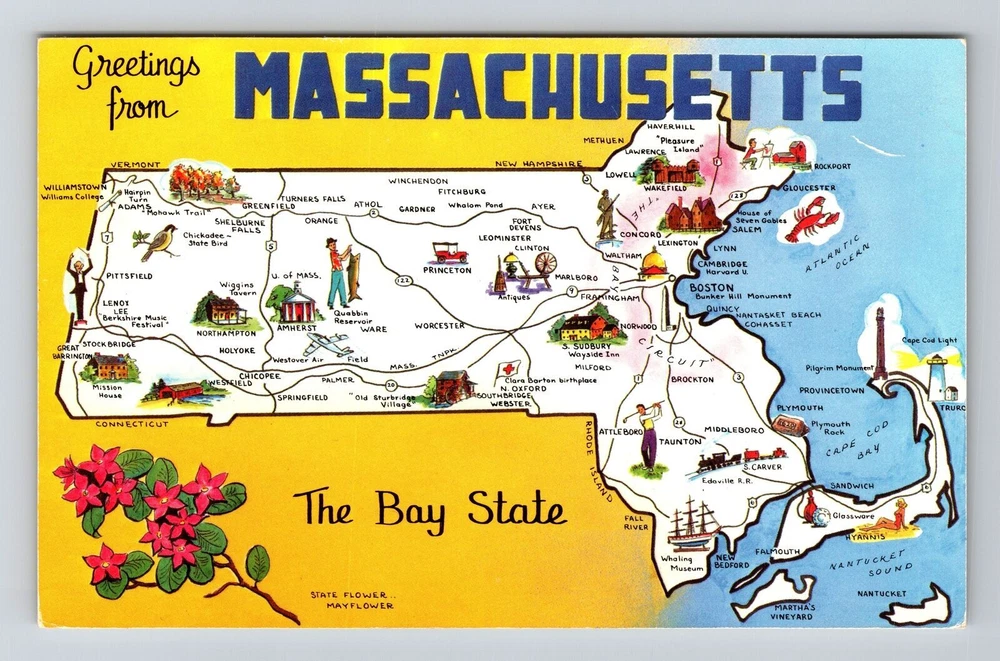MA-Massachusetts, Scenic Map Greetings, Landmarks, Vintage Postcard